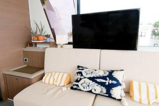 This yacht is designed with multiple lounging and relaxation zones. The forward cockpit offers a sunbathing area and seating with a table, while the flybridge features a spacious sun deck, helm station, and an alfresco dining space.