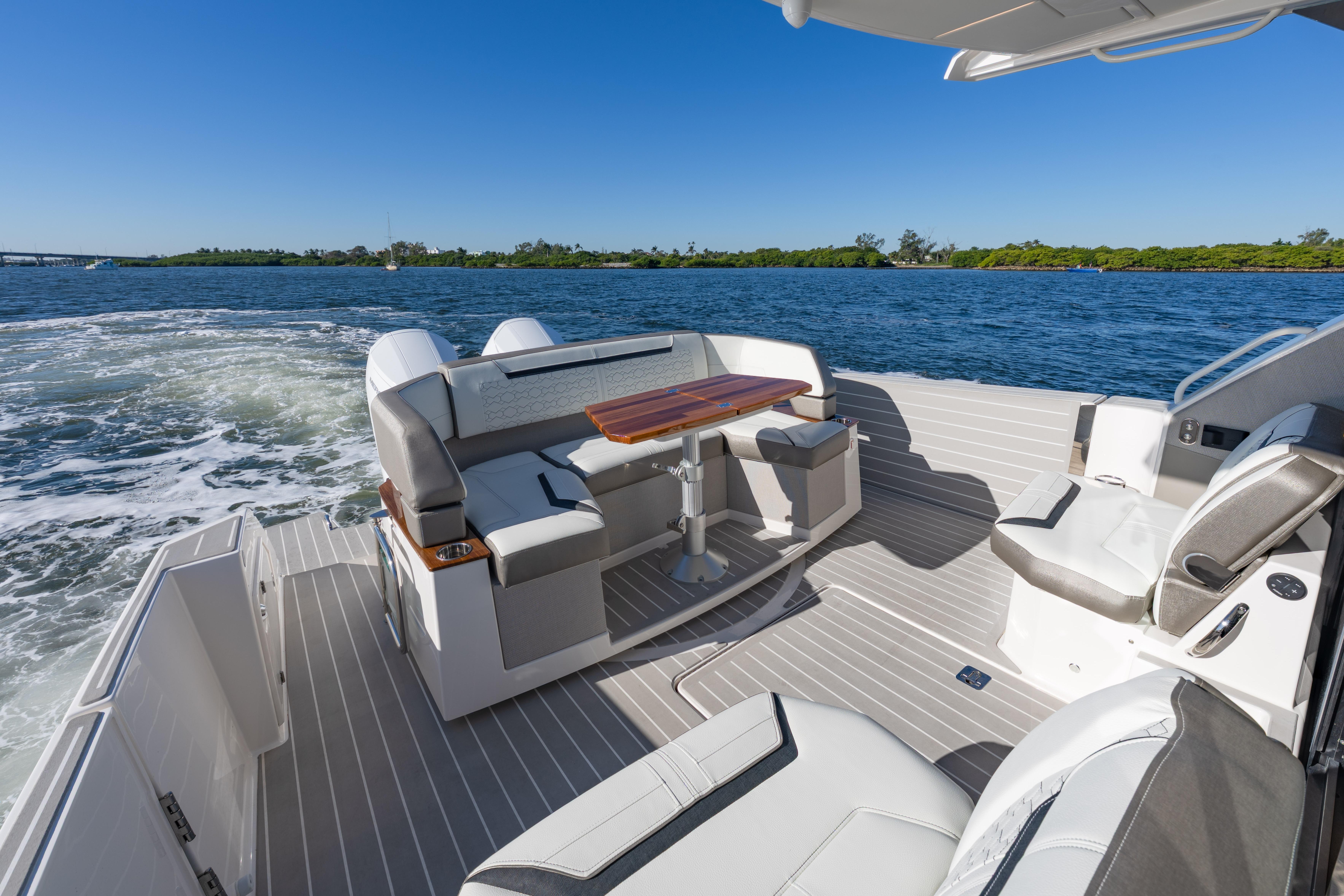 - Aft facing port and starboard lounge seats with drink holders, USB-A/USB-C charging outlets, stereo remote-control pad, and weather covers