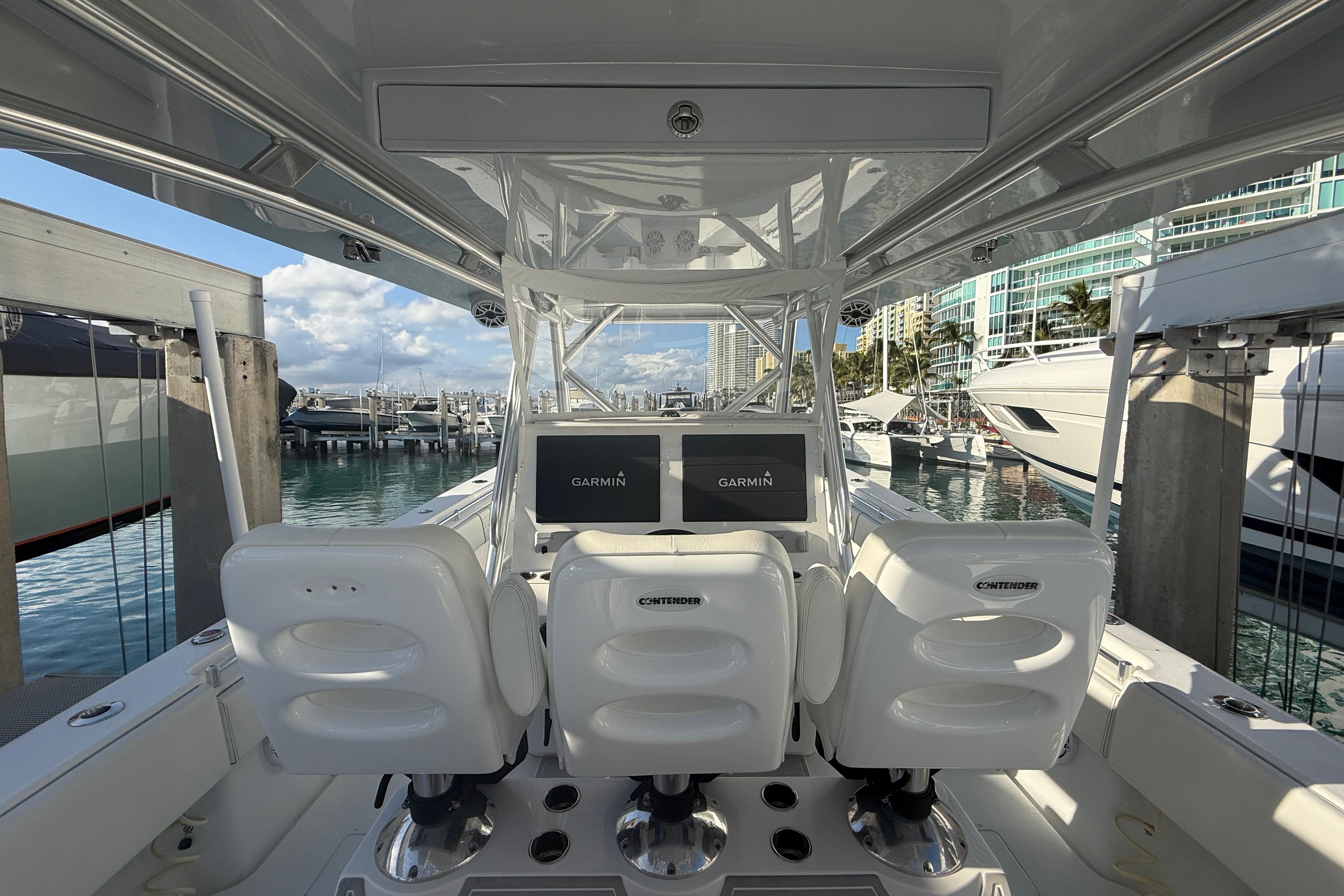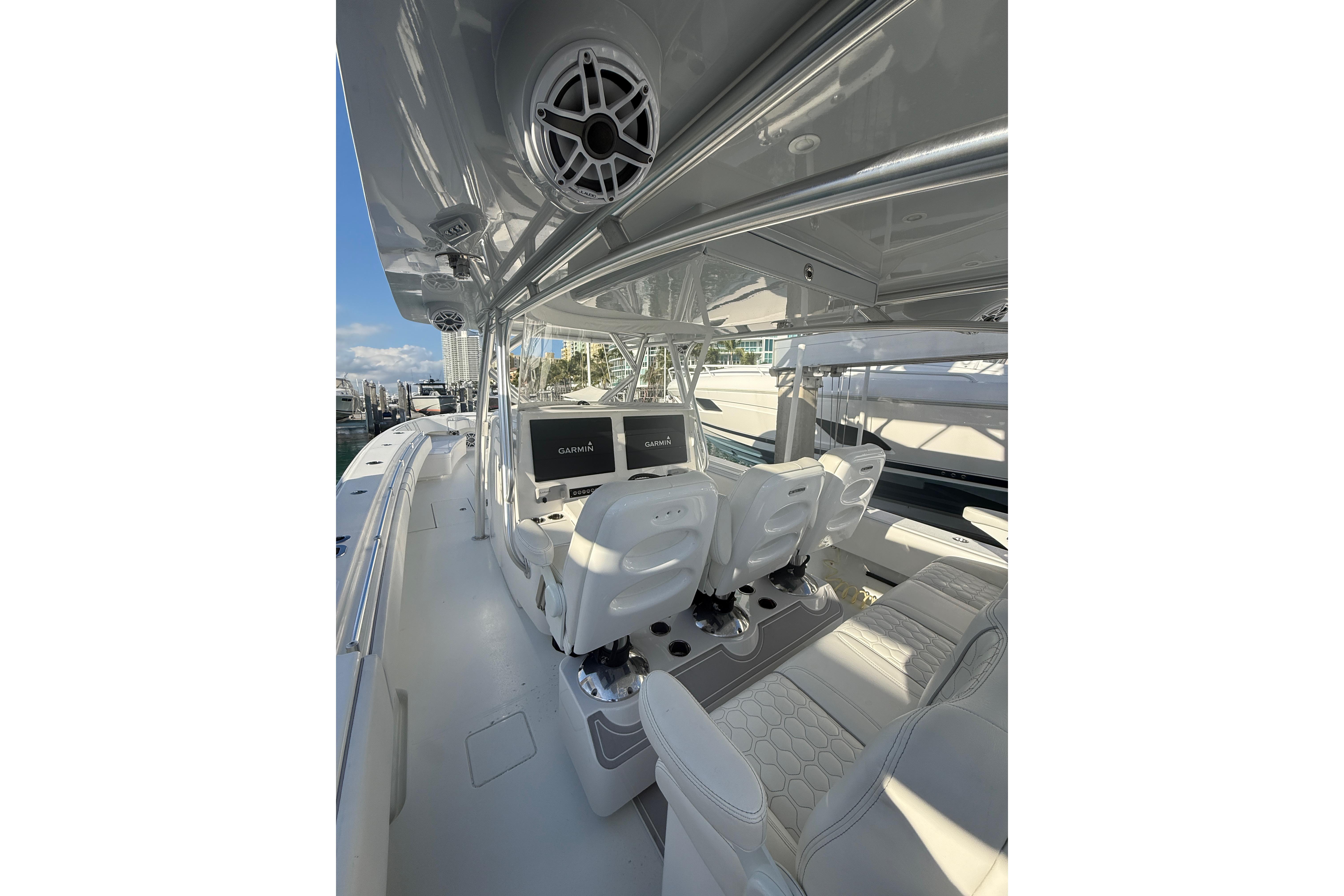 This 2024 Contender 44 ST was built with every available option from the factory. It was then outfitted with a custom tower by Custom Pipe Designs. The tower was thoughtfully designed and incorporates a fiberglass kite storage box, fiberglass spreader light boxes, fiberglass speaker boxes, and underside whisper gray painted hard tops. The tower console is fully equipped with Garmin electronics, 2 electric outlets for teaser reels, and Starlink. This vessel is maintained with an open check book and always receives its services as needed. It just received a complete detail from the tower down to the hull. She is a must see!