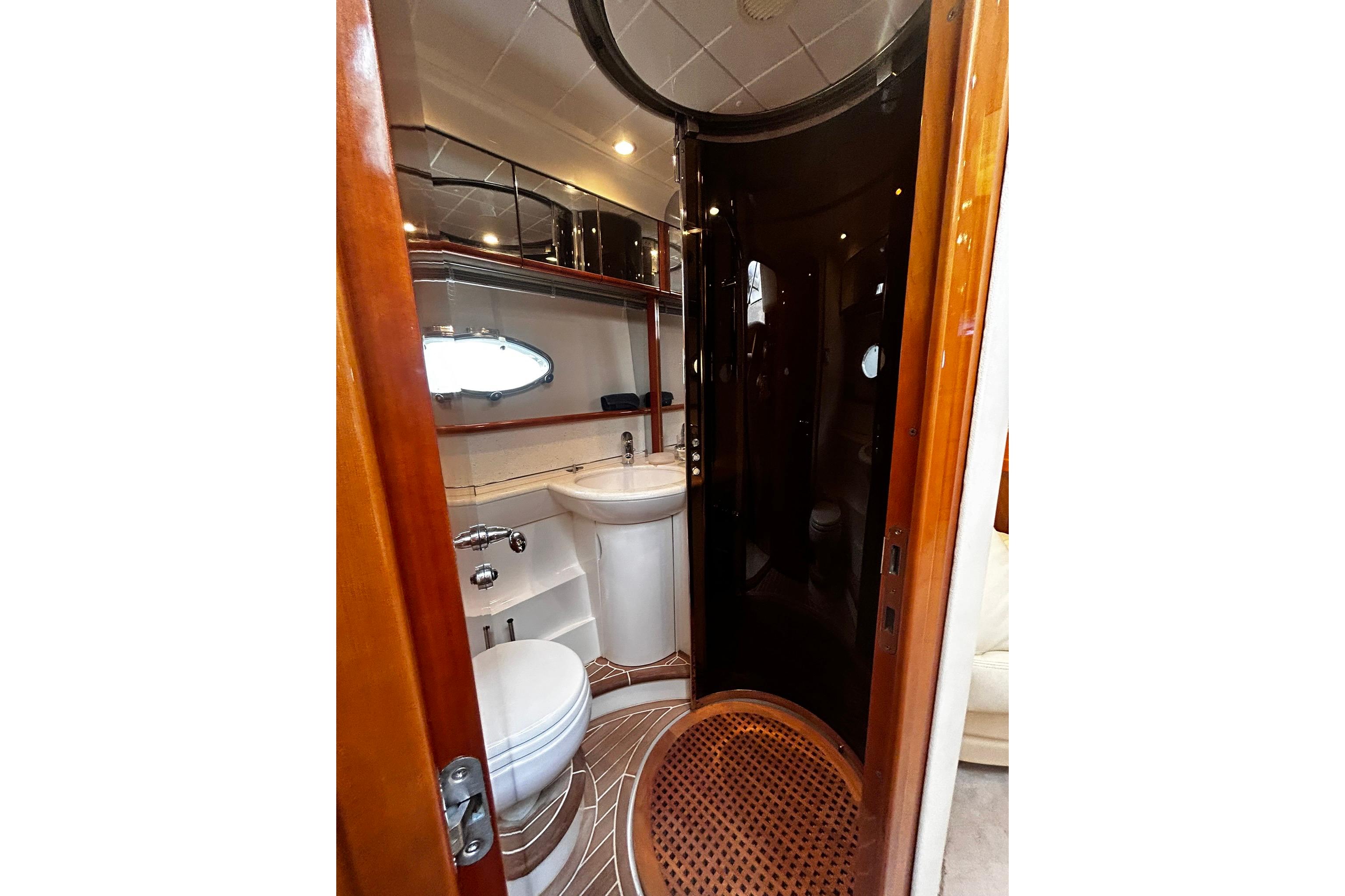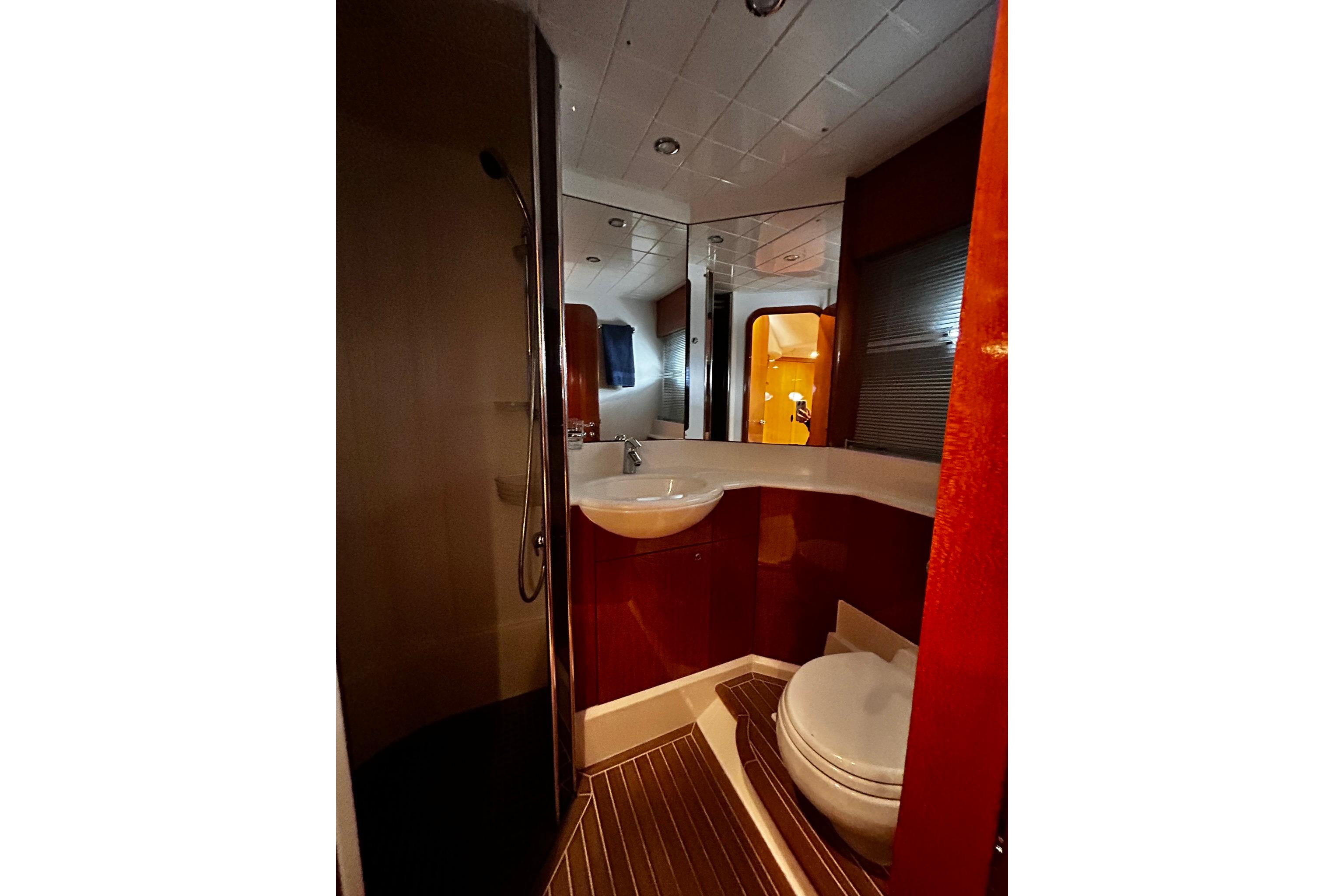 ELECTRICAL SYSTEMS 24 volt: 4 x heavyduty (130AH) batteries for engine starting * 6 x heavy duty (130AH) auxiliary batteries * Engine alternators charge via blocking diodes to isolate engine start batteries from auxiliaries * 2 x 40-amp 24v float battery chargers connected to both battery banks * 50-amp 24v/220v float unit for lighting * Remote battery master switches with control switch at main panel * Circuit breakers on all circuits. 220/240 volt: 11kW diesel generator with own starting battery and specially silenced exhaust * Shore support inlet in cockpit * Generator/ shore support change-over switch * Powerpoints in owner’s stateroom, both guest cabins, galley (double) and saloon * Polarity check system * Earth leakage safety trip * Shaverpoints in all bathrooms.
