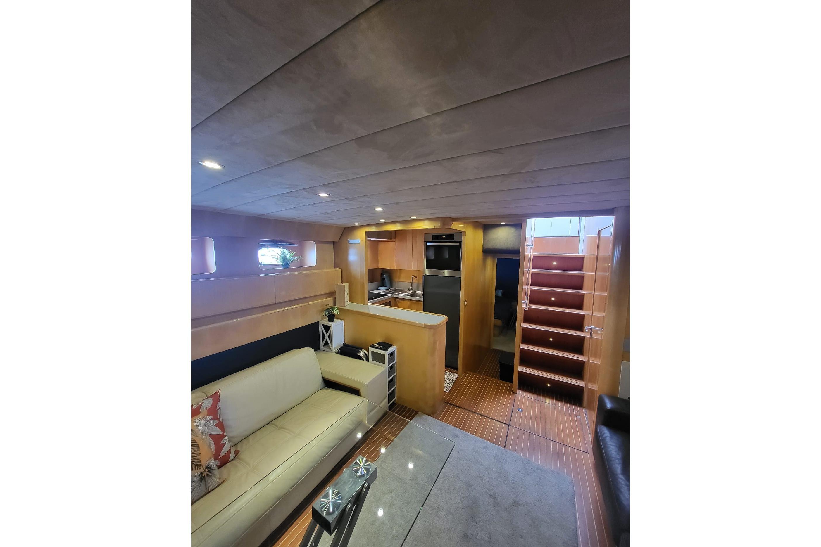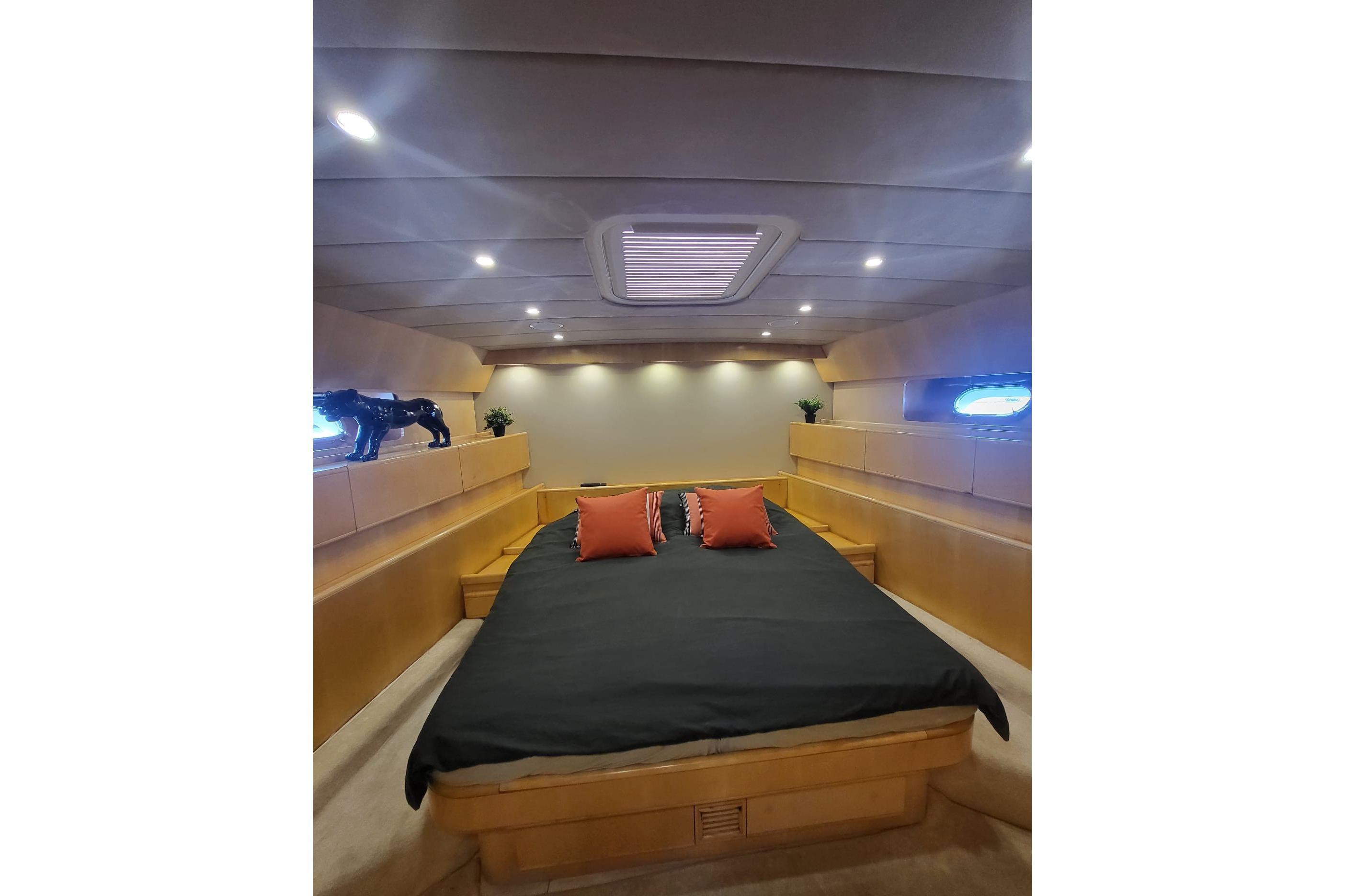 À l’intérieur, le Leopard 23 Sport propose un aménagement élégant et fonctionnel. Les cabines offrent un excellent niveau de confort, avec des volumes bien pensés et des finitions haut de gamme. Le salon intérieur bénéficie d’une belle luminosité et d’une atmosphère chaleureuse, propice à la détente après la navigation. L’ensemble est conçu pour permettre des croisières rapides avec tout le confort nécessaire à bord.