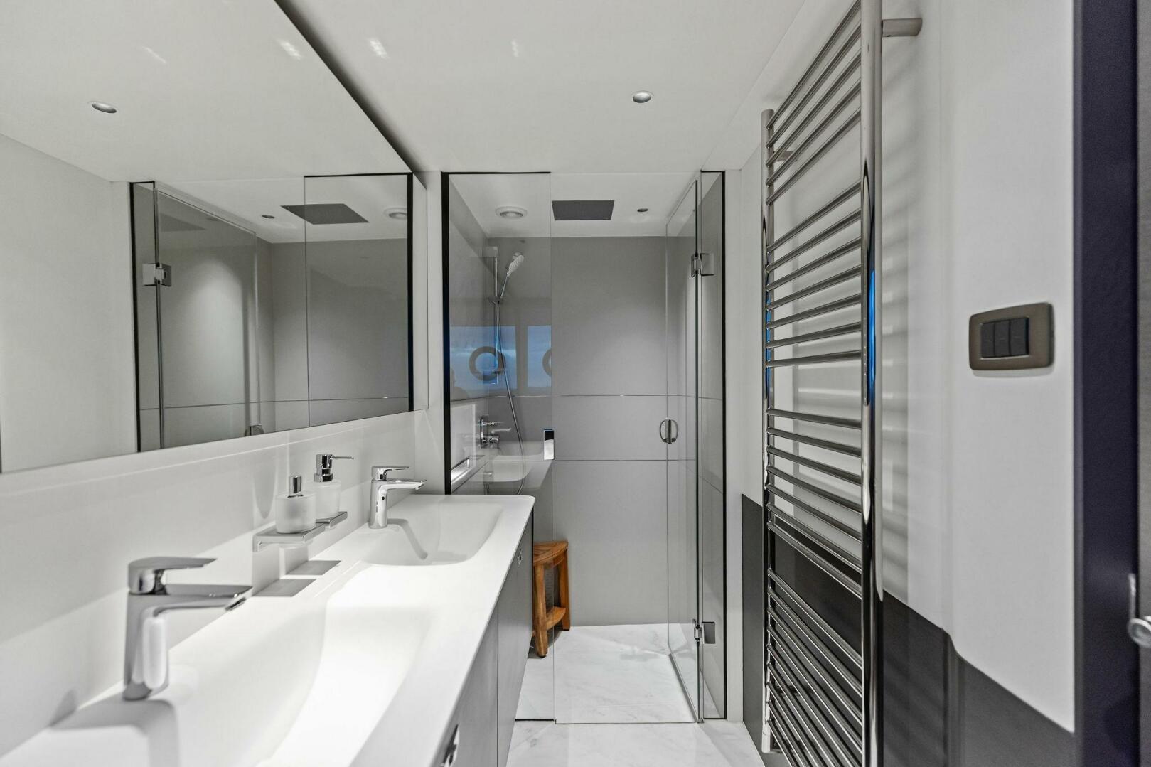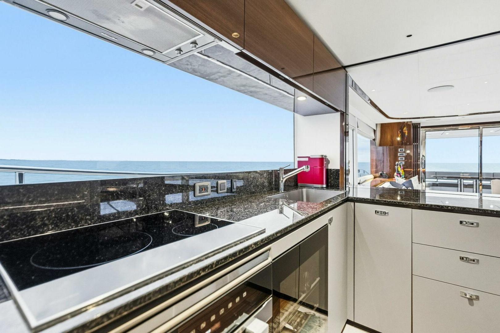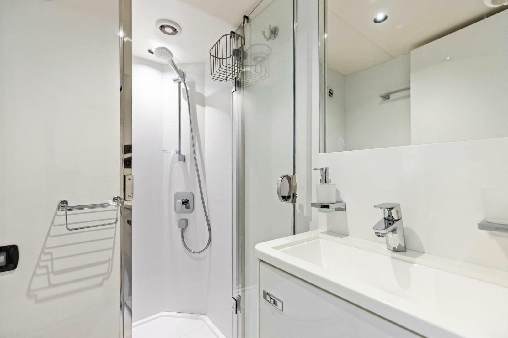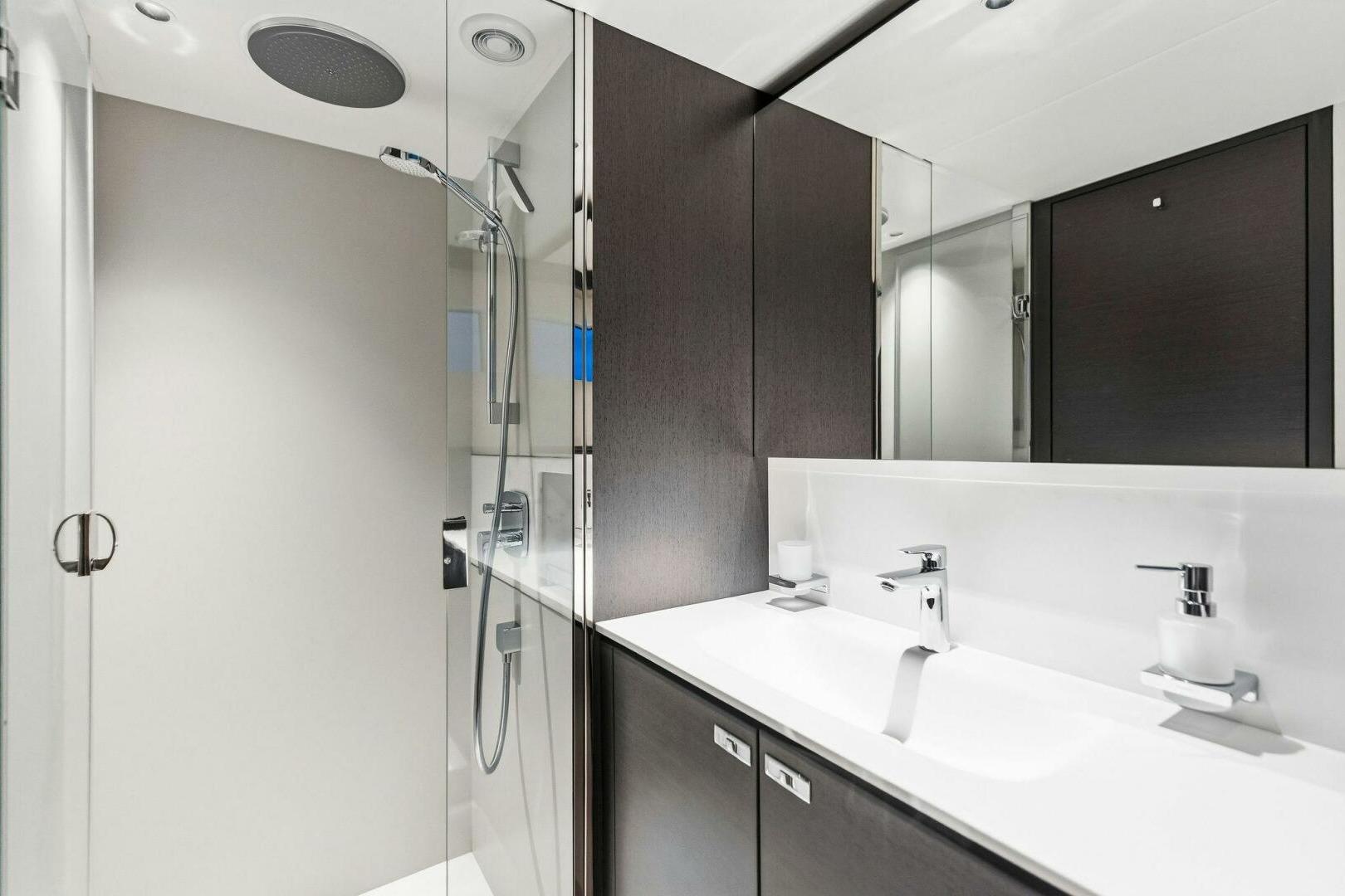 Day-to-day living onboard has been meaningfully upgraded. The galley is equipped with a refrigeration capacity nearly double that typically found on comparable yachts, supporting longer trips and greater self-sufficiency. Interior finishes throughout the yacht have been upgraded beyond standard specification, and the audio-visual systems have been enhanced, creating a more refined and immersive onboard environment.