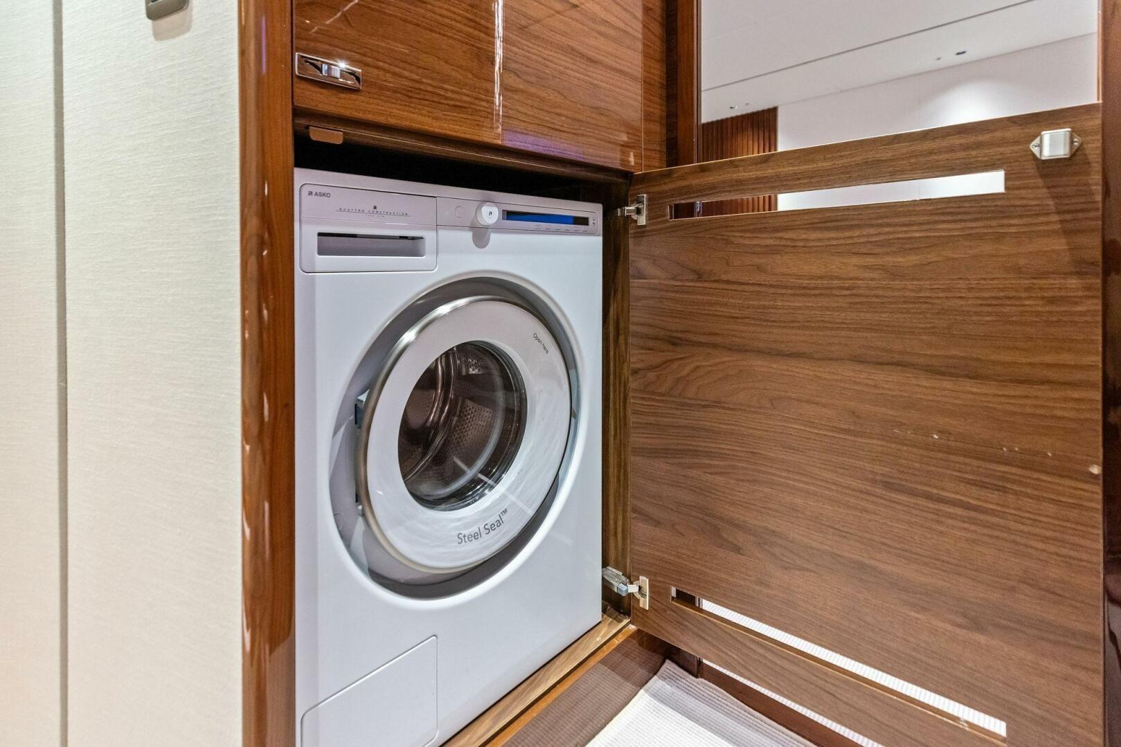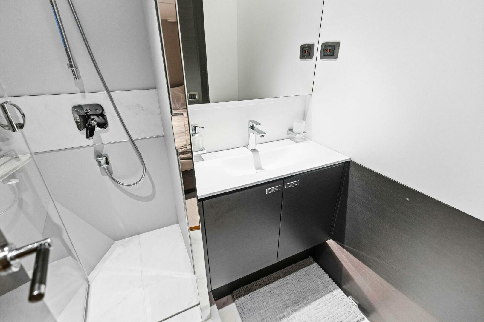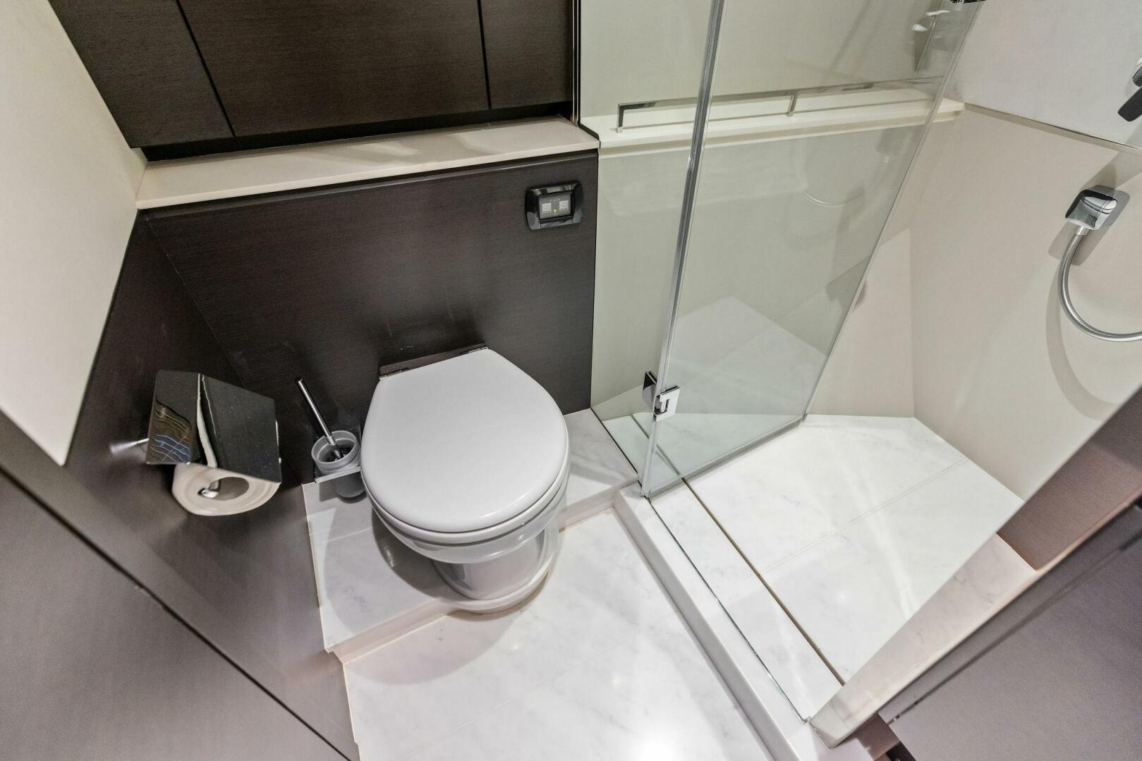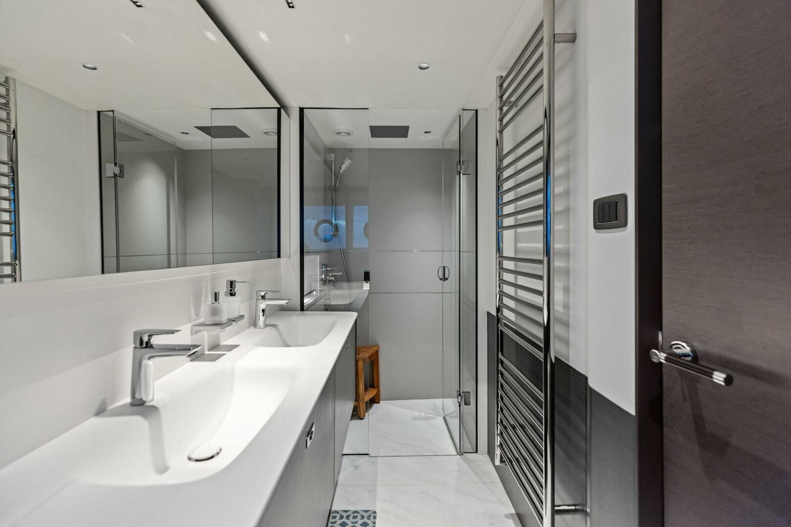 Day-to-day living onboard has been meaningfully upgraded. The galley is equipped with a refrigeration capacity nearly double that typically found on comparable yachts, supporting longer trips and greater self-sufficiency. Interior finishes throughout the yacht have been upgraded beyond standard specification, and the audio-visual systems have been enhanced, creating a more refined and immersive onboard environment.
