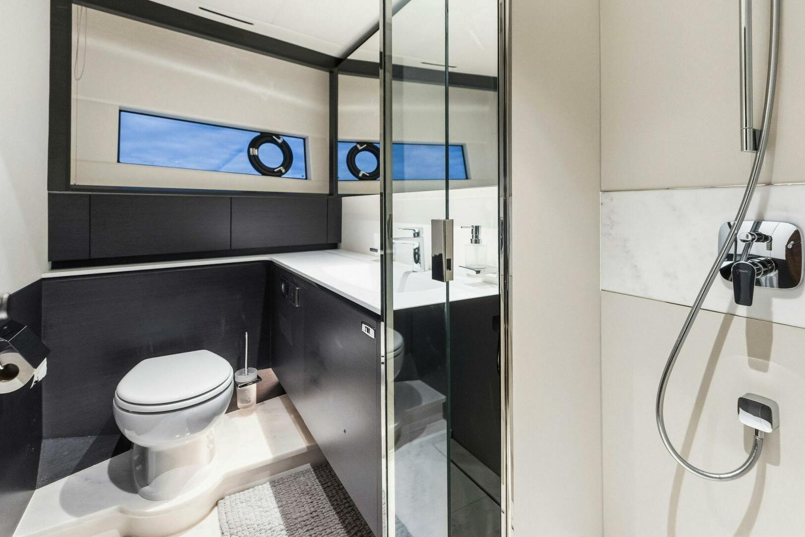 Inside, expansive main-deck glazing, elevated bulwarks, and an enclosed wheelhouse fill the saloon, galley, and dining areas with natural light, creating an open and inviting atmosphere. Teak decking and Oyster Grey metallic accents add a refined, contemporary finish throughout.