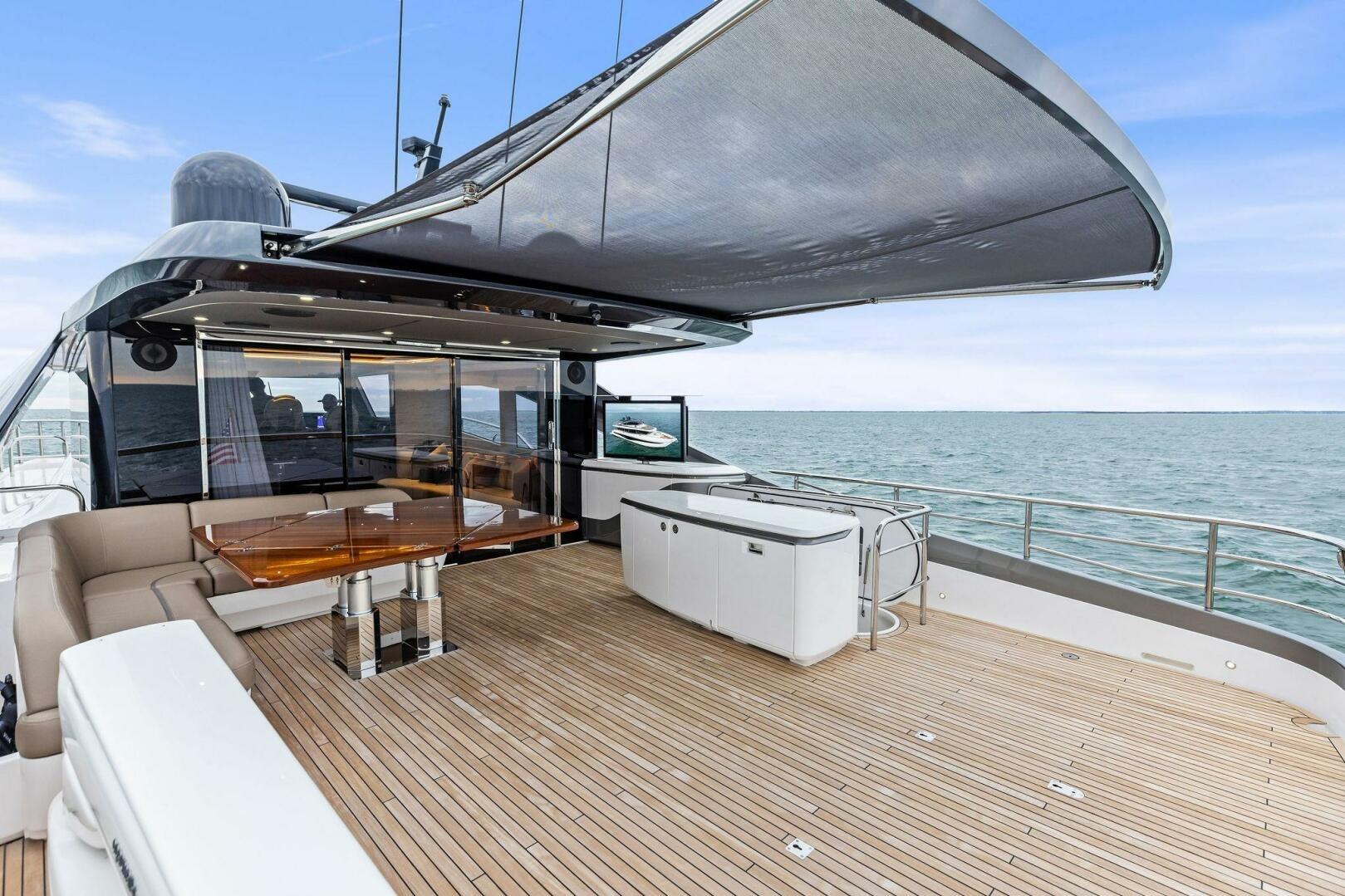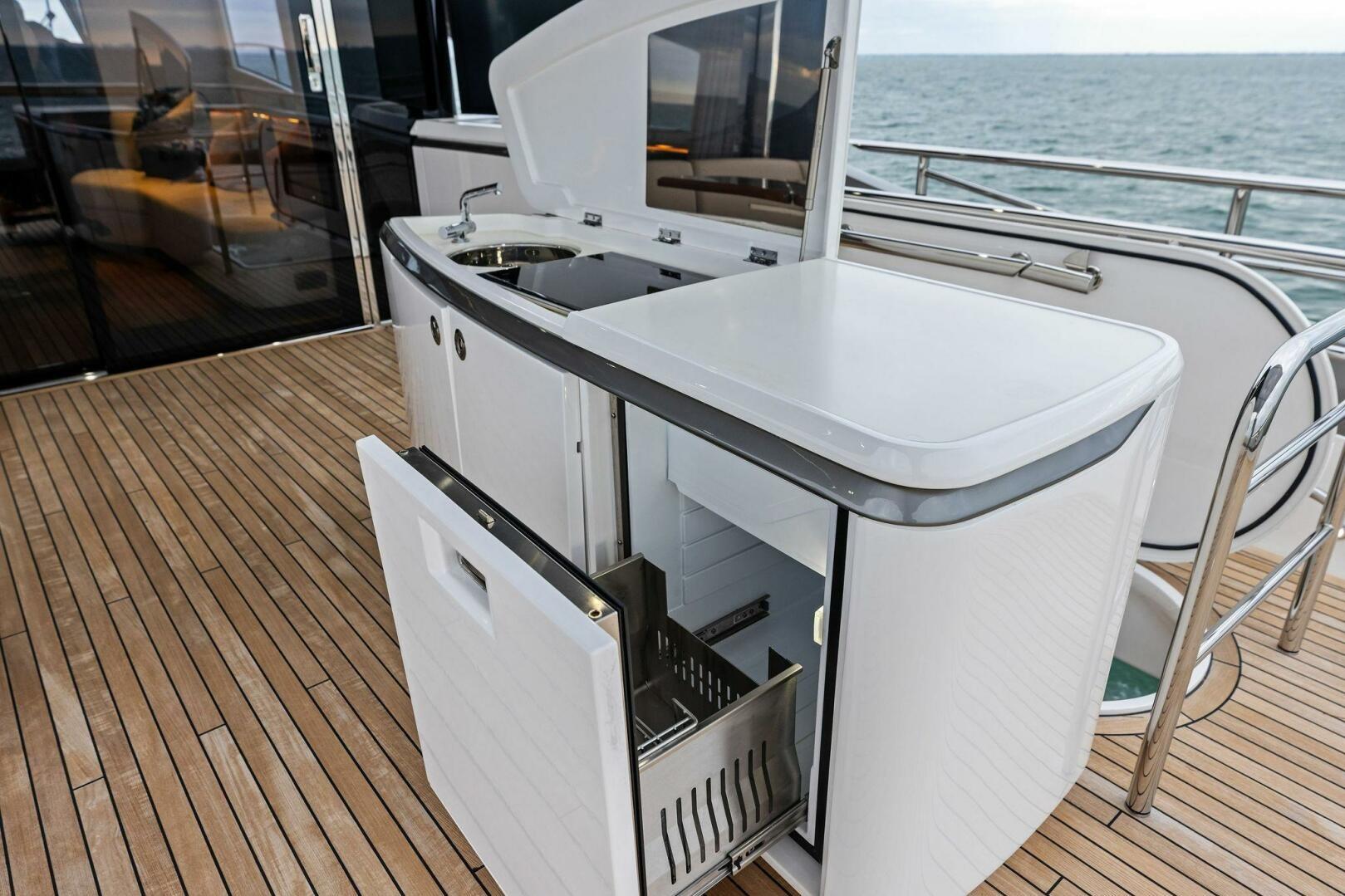 Outdoor living is equally well considered. A Jacuzzi / hot tub adds a true luxury element at anchor, while the sky deck davit enhances functionality for storing and deploying equipment without sacrificing deck space. A hydraulic transom platform improves water access and simplifies boarding, swimming, and time spent dockside.
