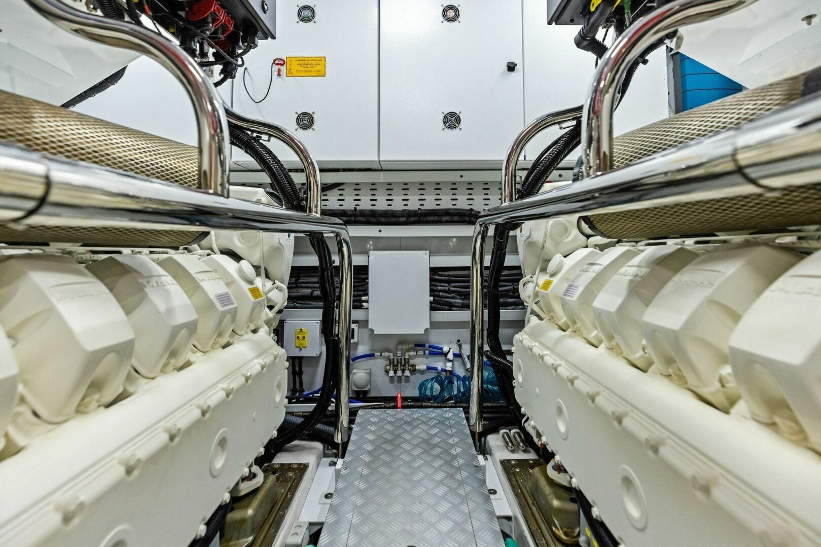 Powered by twin MAN V12-2000 engines producing a combined 4,000 horsepower and supported by a 2,325-gallon fuel capacity, the X80 is built for smooth, long-range cruising and extended time on the water. Handling is supported by a dual stabilization setup combining a Seakeeper 35 with zero-speed stabilizer fins, enhancing control and composure across a wide range of sea conditions. Redundant mechanical systems further reinforce reliability, offering added peace of mind for longer passages and extended stays onboard.