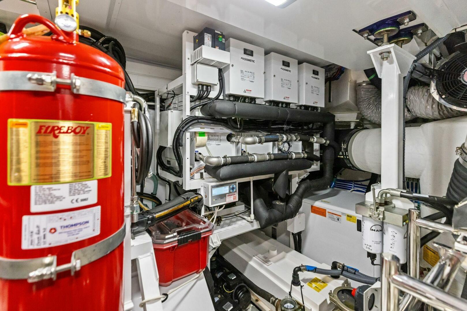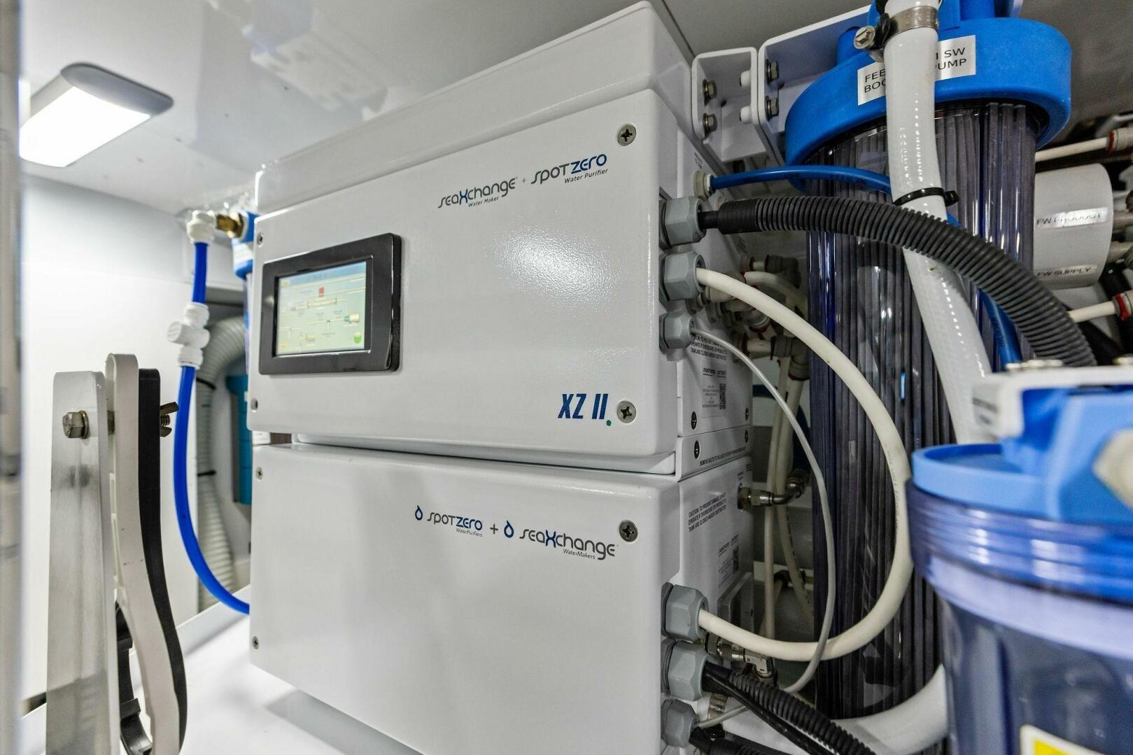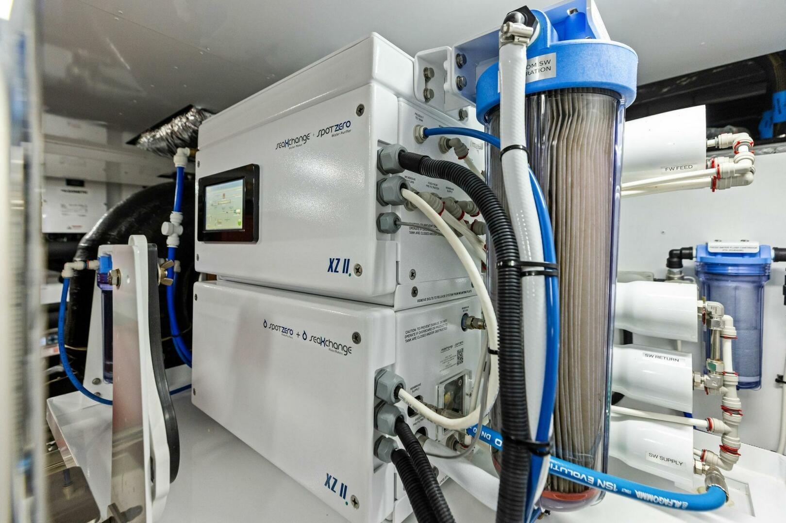 - Equipped with a powerful Sleipner hydraulic system, featuring engine-driven pumps (PTO) on both engines with cross-connections, enabling any system to draw power from either engine. This setup supports roll control at speed, zero-speed stabilization, and includes a hydraulic anchor winch, 750 lbf bow thruster and 530 lbf stern thruster — all with 3 control stations- Bridge, Starboard wing, and main deck port side.