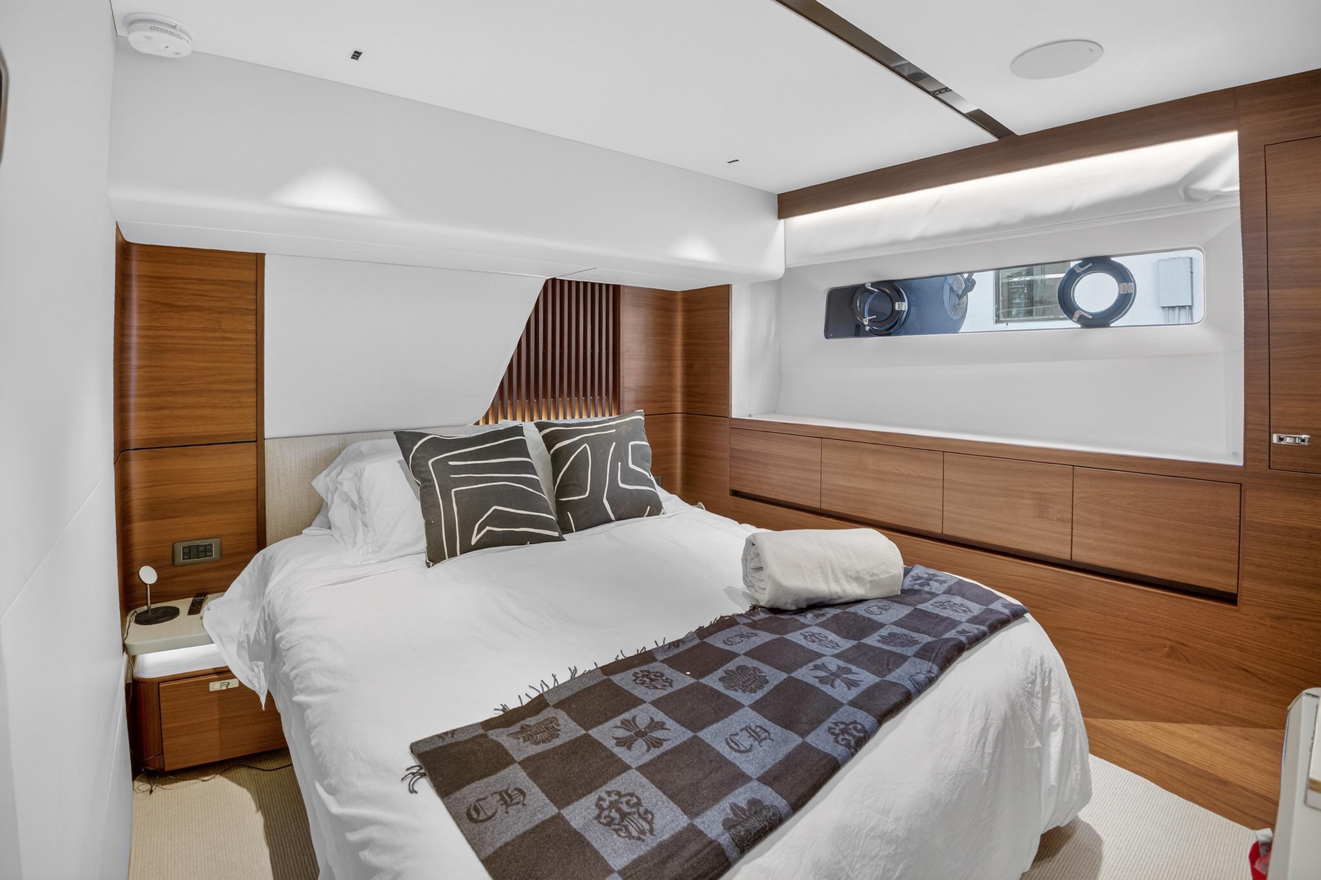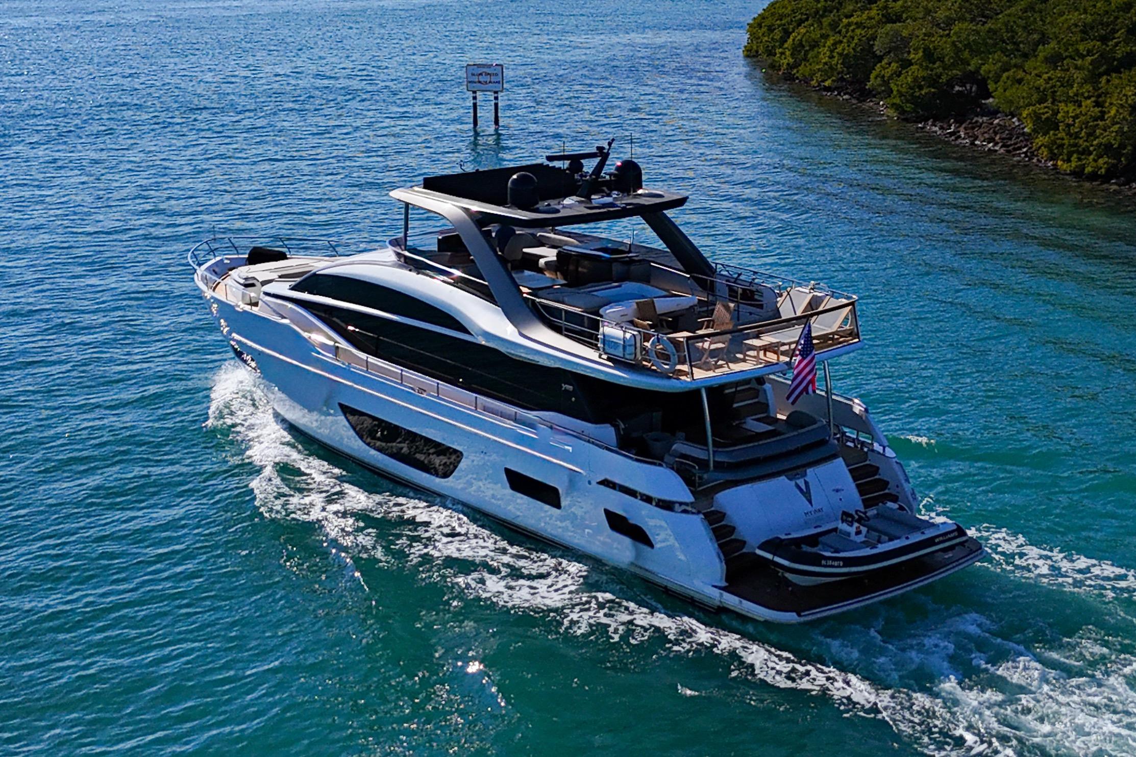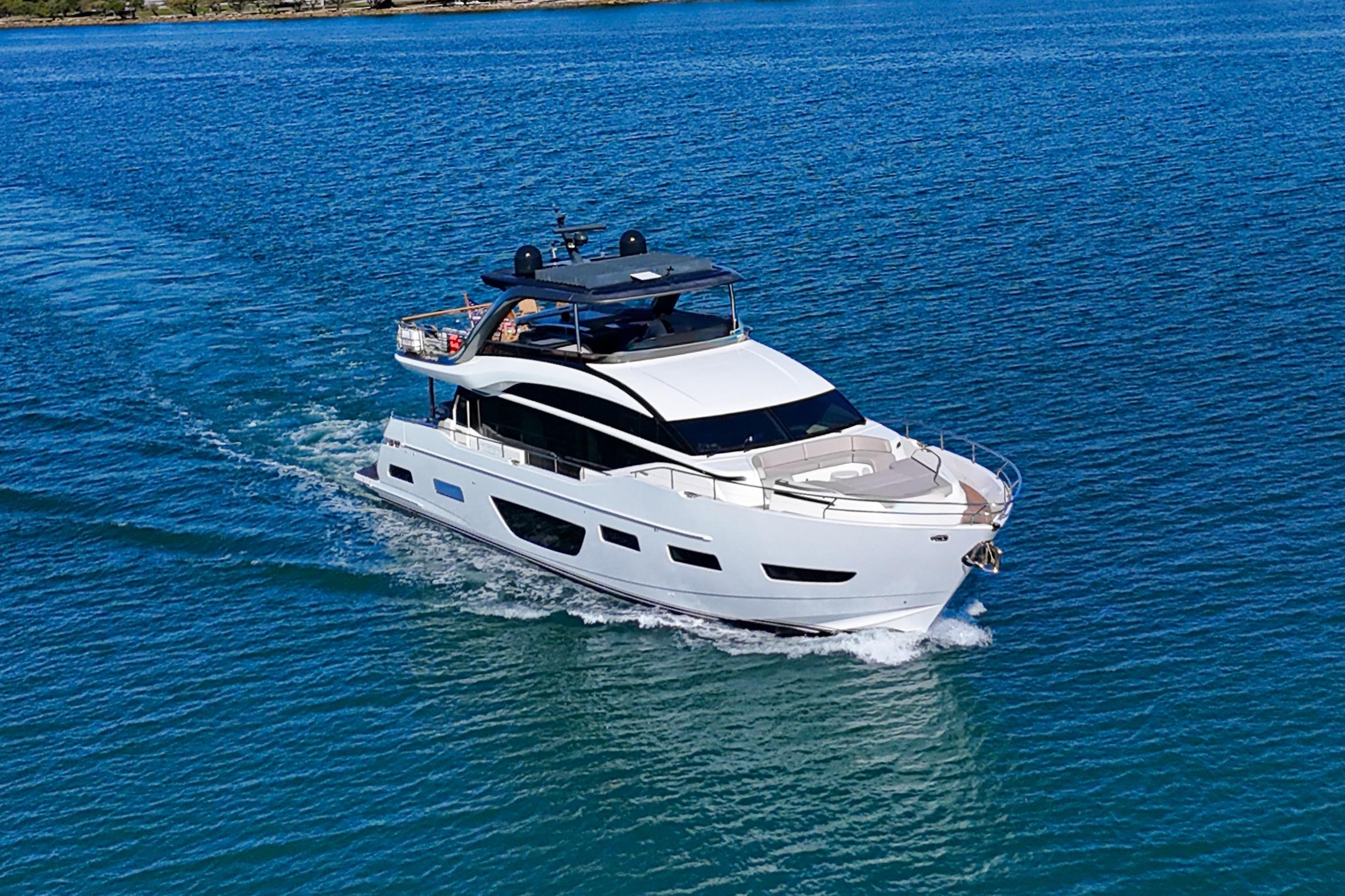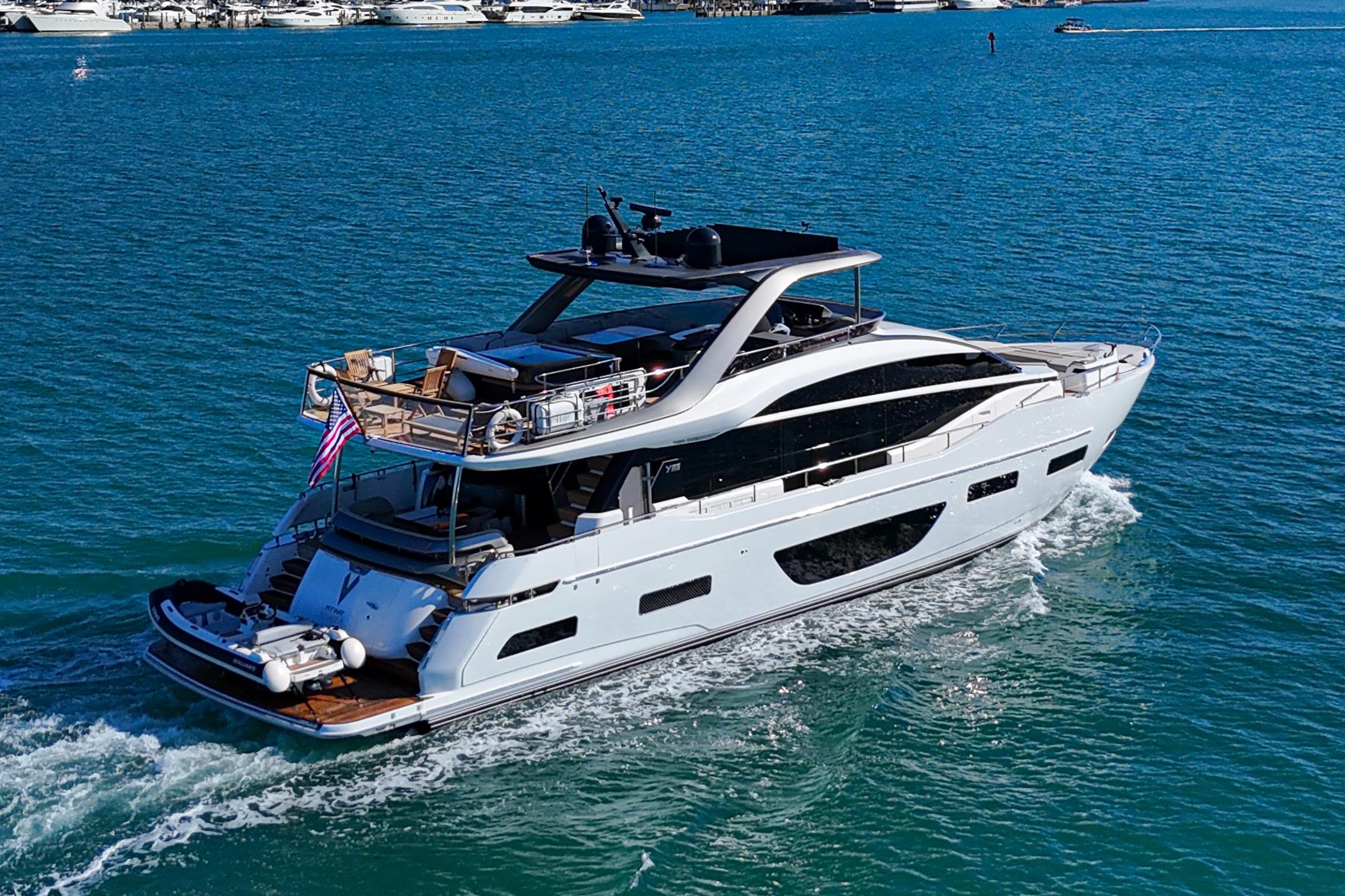 The all-new Y85 is a triumph of contemporary design. Her elegant sweeping profile houses an interior sanctuary that resets the benchmark for modern living. Her flybridge is an irresistible invitation to al fresco entertainment with a large dining area opposite a well-equipped wet bar further complemented by a large aft sunpad. With twin MAN V12 engines propelling her to a top speed of 33 knots, she flies past her contemporaries without looking back. An expansive single-level main deck provides ample entertaining space with a flexible galley arrangement. Three separate seating areas ensure the utmost privacy for guests with the crew able to move discretely around the yacht. Below deck, up to eight guests are accommodated across four beautifully appointed en suite cabins. Amidships, the full beam master suite is a champion of spacial design, whilst the en suite VIP cabin, forward, boasts a large double bed and walk-in-wardrobe. Furthermore, one double and one twin cabin (convertible into a double) complete her spacious accommodation. Unmissable, the all-new Y85 is unmistakably Princess.