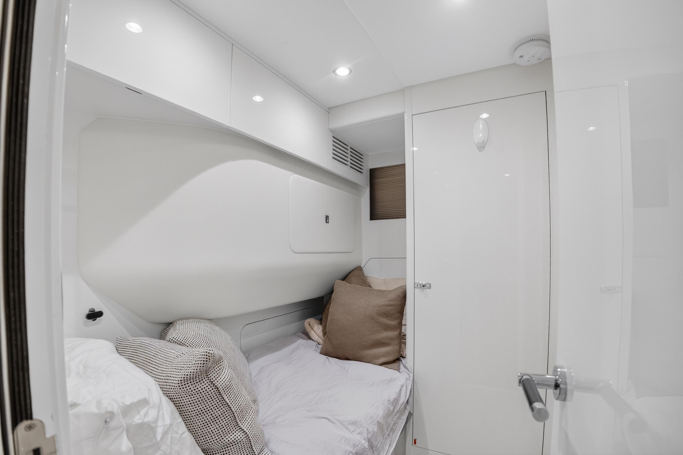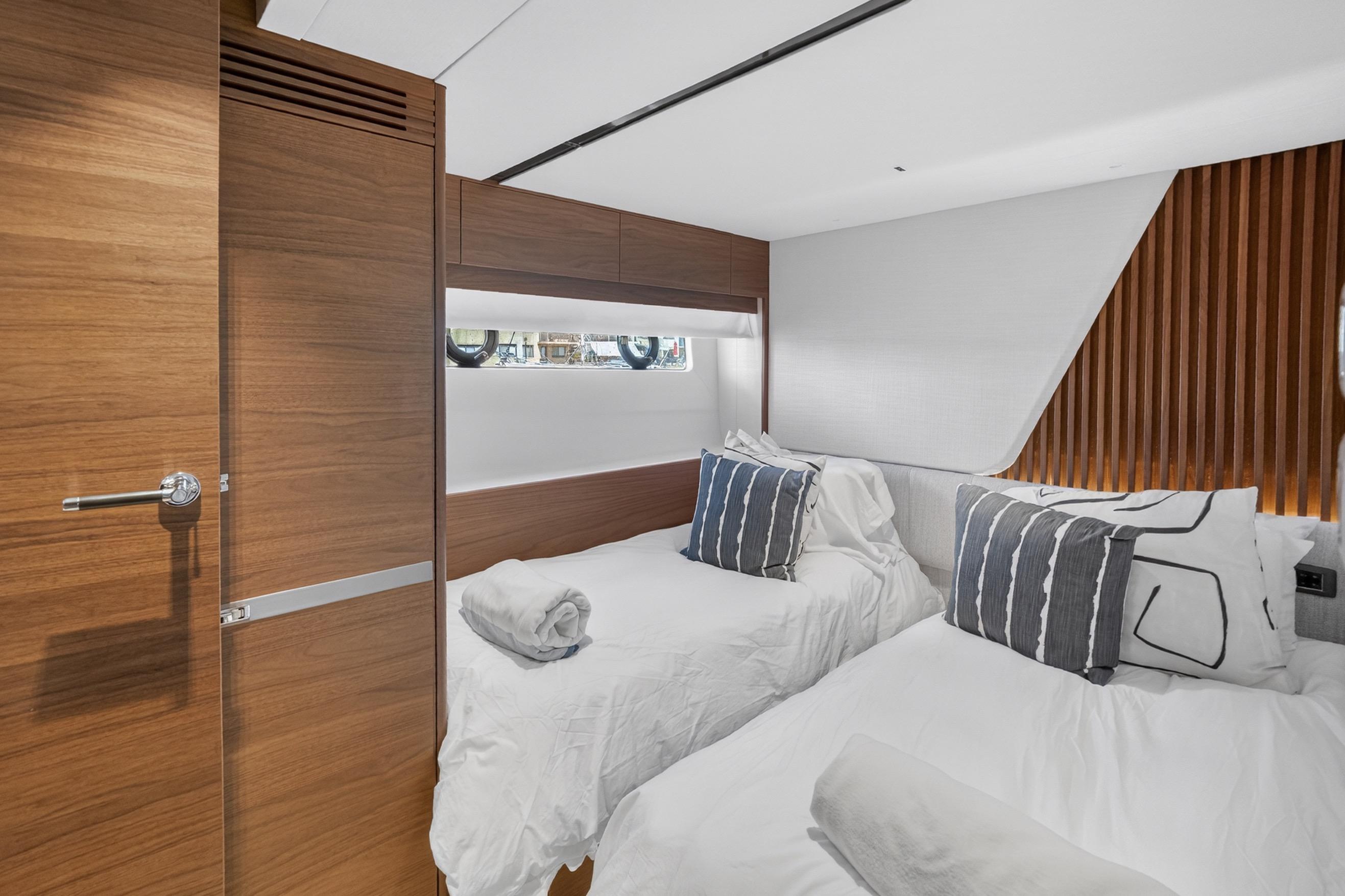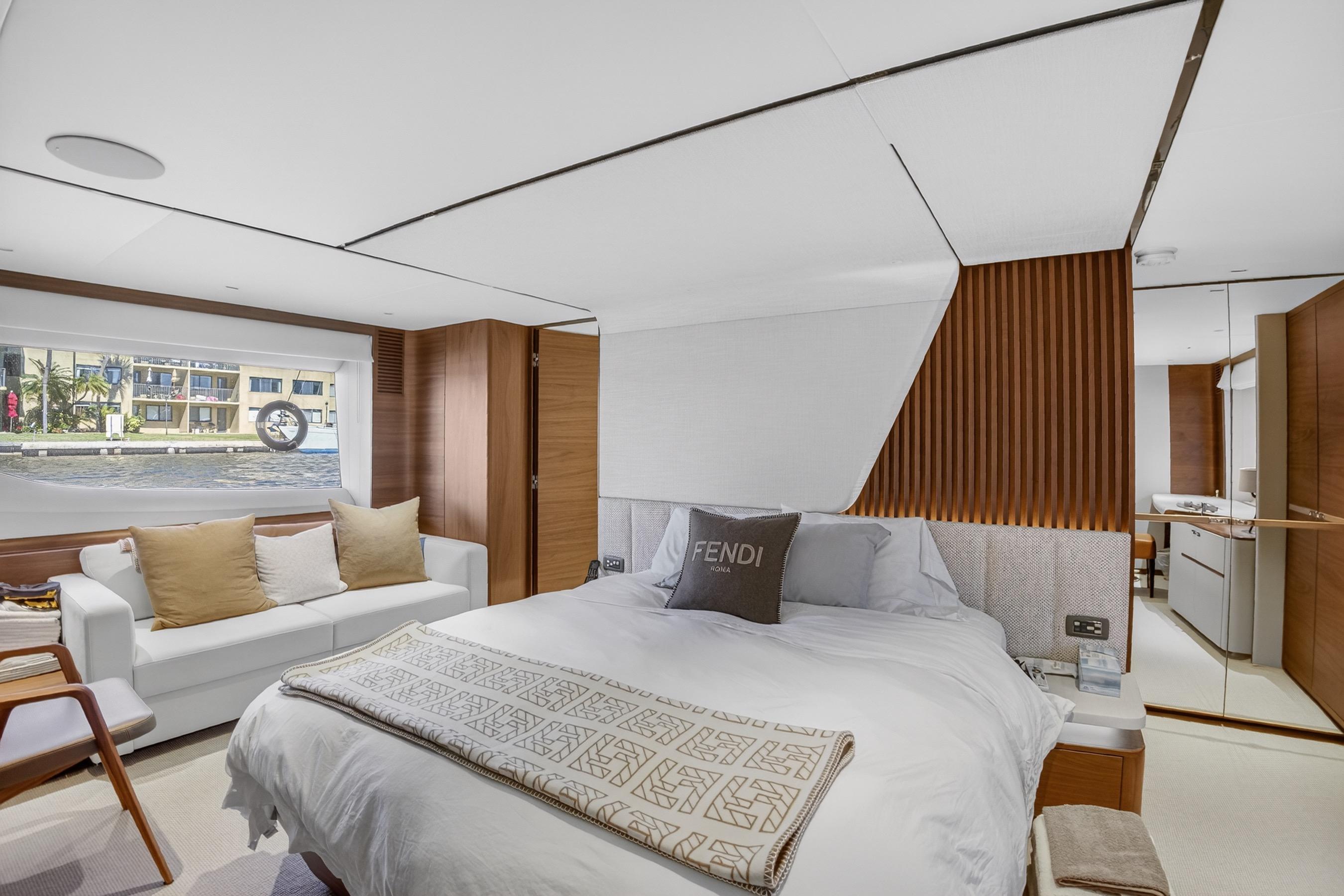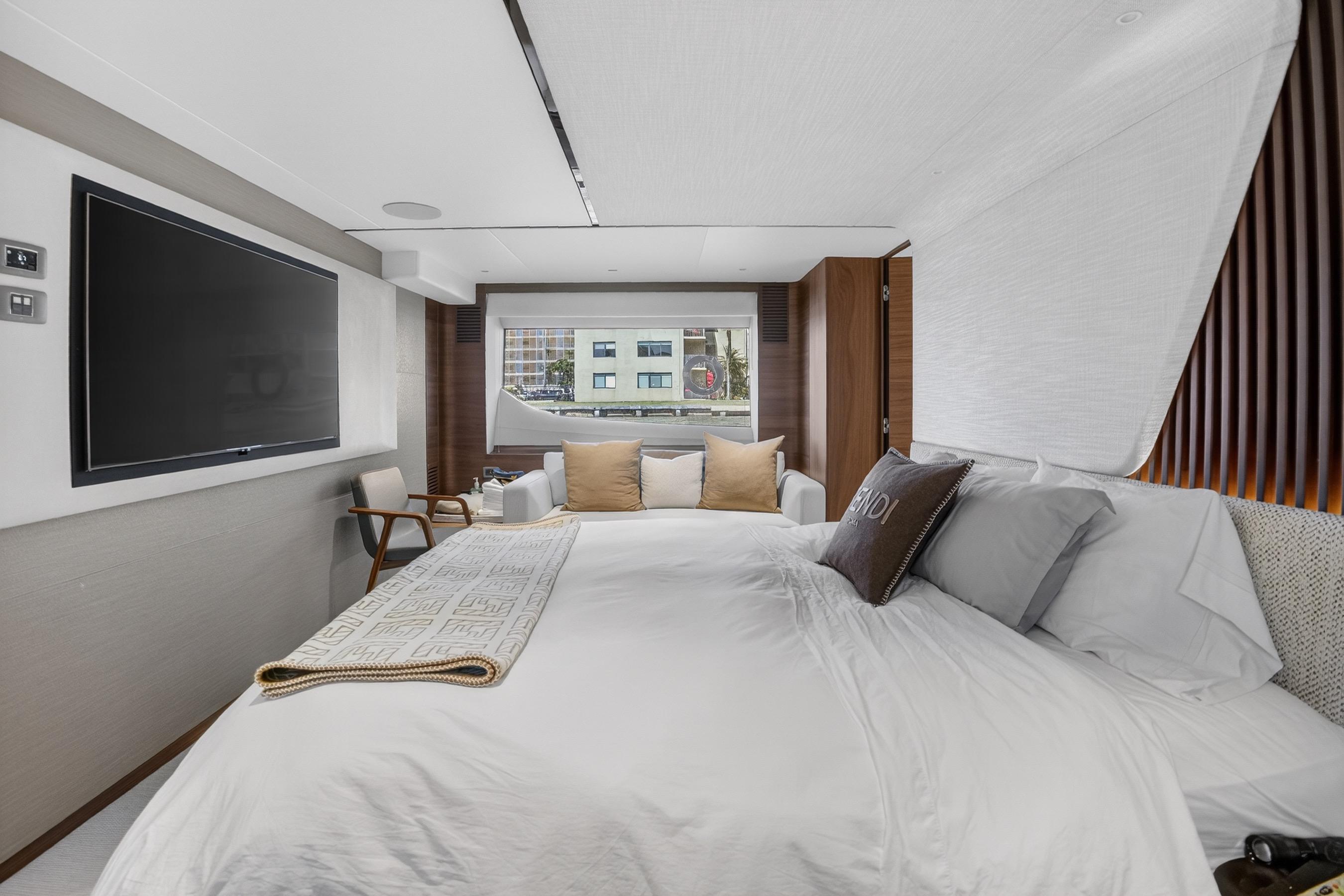 The all-new Y85 is a triumph of contemporary design. Her elegant sweeping profile houses an interior sanctuary that resets the benchmark for modern living. Her flybridge is an irresistible invitation to al fresco entertainment with a large dining area opposite a well-equipped wet bar further complemented by a large aft sunpad. With twin MAN V12 engines propelling her to a top speed of 33 knots, she flies past her contemporaries without looking back. An expansive single-level main deck provides ample entertaining space with a flexible galley arrangement. Three separate seating areas ensure the utmost privacy for guests with the crew able to move discretely around the yacht. Below deck, up to eight guests are accommodated across four beautifully appointed en suite cabins. Amidships, the full beam master suite is a champion of spacial design, whilst the en suite VIP cabin, forward, boasts a large double bed and walk-in-wardrobe. Furthermore, one double and one twin cabin (convertible into a double) complete her spacious accommodation. Unmissable, the all-new Y85 is unmistakably Princess.
