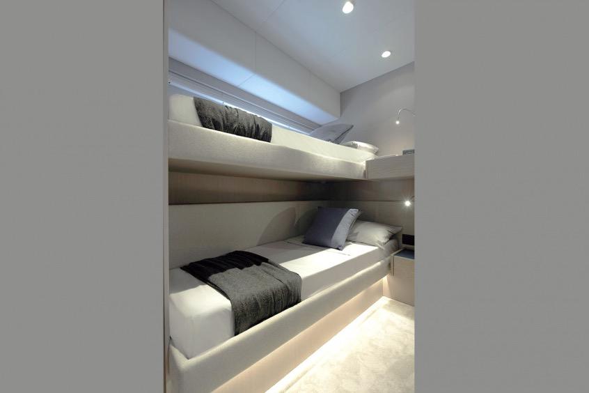 The cozy master cabin is located between the two sides of the central part of the lower deck; the yacht’s owner has a private bathroom, two spacious wardrobes for personal belongings, a Queen-sized bed, and a home cinema.