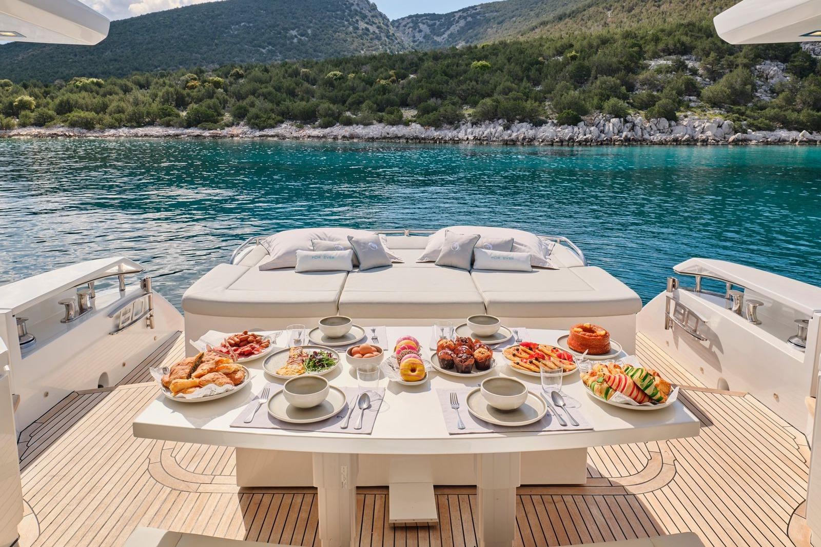 With a shallow draft of just 1.40m (4' 8"), she is perfectlysuited for exploring shallow waters and cruising nearthe coast. The main deck features expansive,comfortable outdoor areas for relaxation, with a biminisun top at the bow and an extendable roof over thecockpit for adjustable shading. The salon seamlesslyconnects to the cockpit, with retractable doors thatcreate a spacious, open environment. A professionaland experienced crew of four ensures a luxurious andstress-free yachting experience.