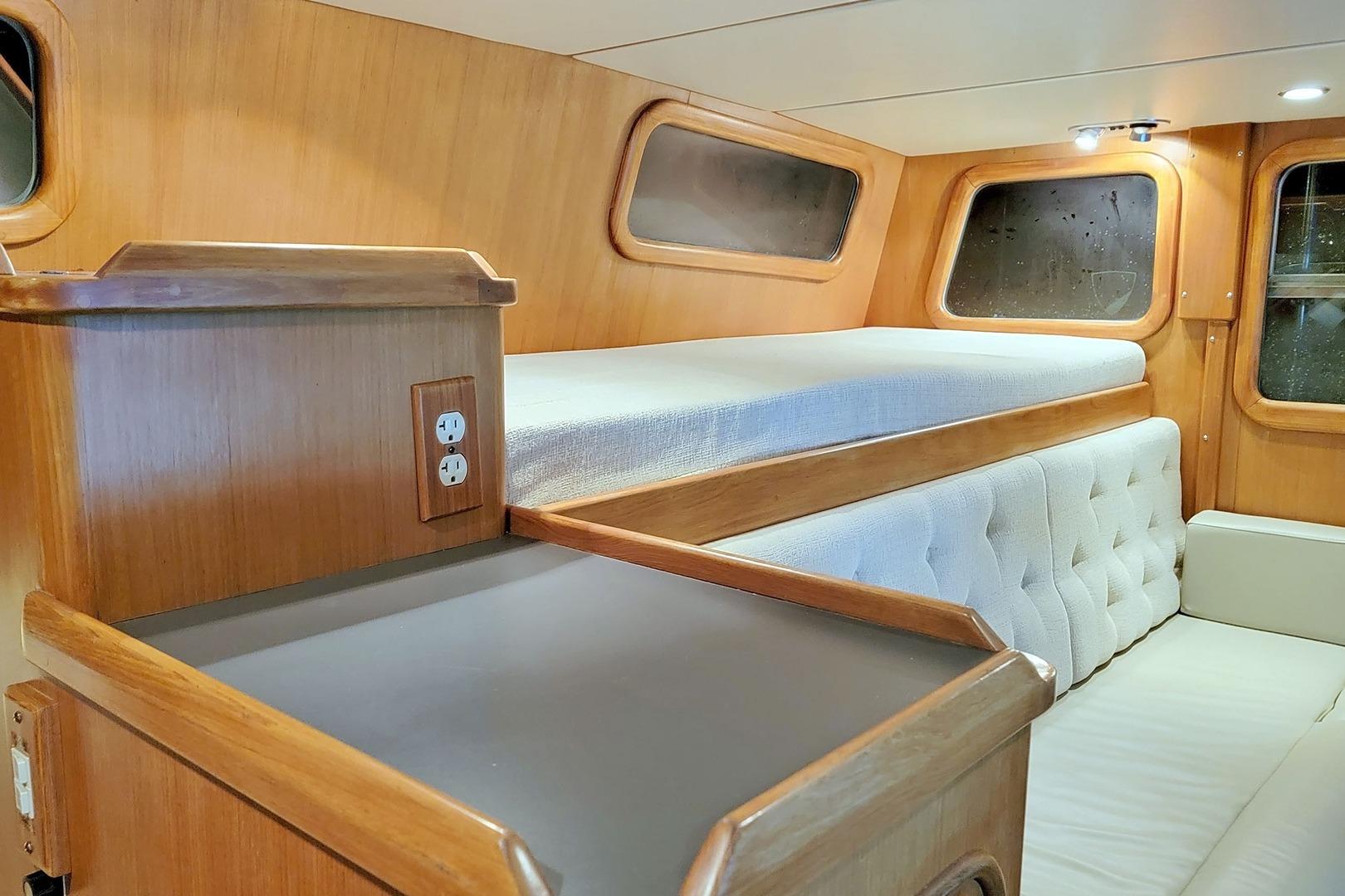 Berths Centerline queen forward (owner) with custom innerspring mattress and custom-fitted linens |(2) bunks in guest stateroom | Pilothouse watch berth