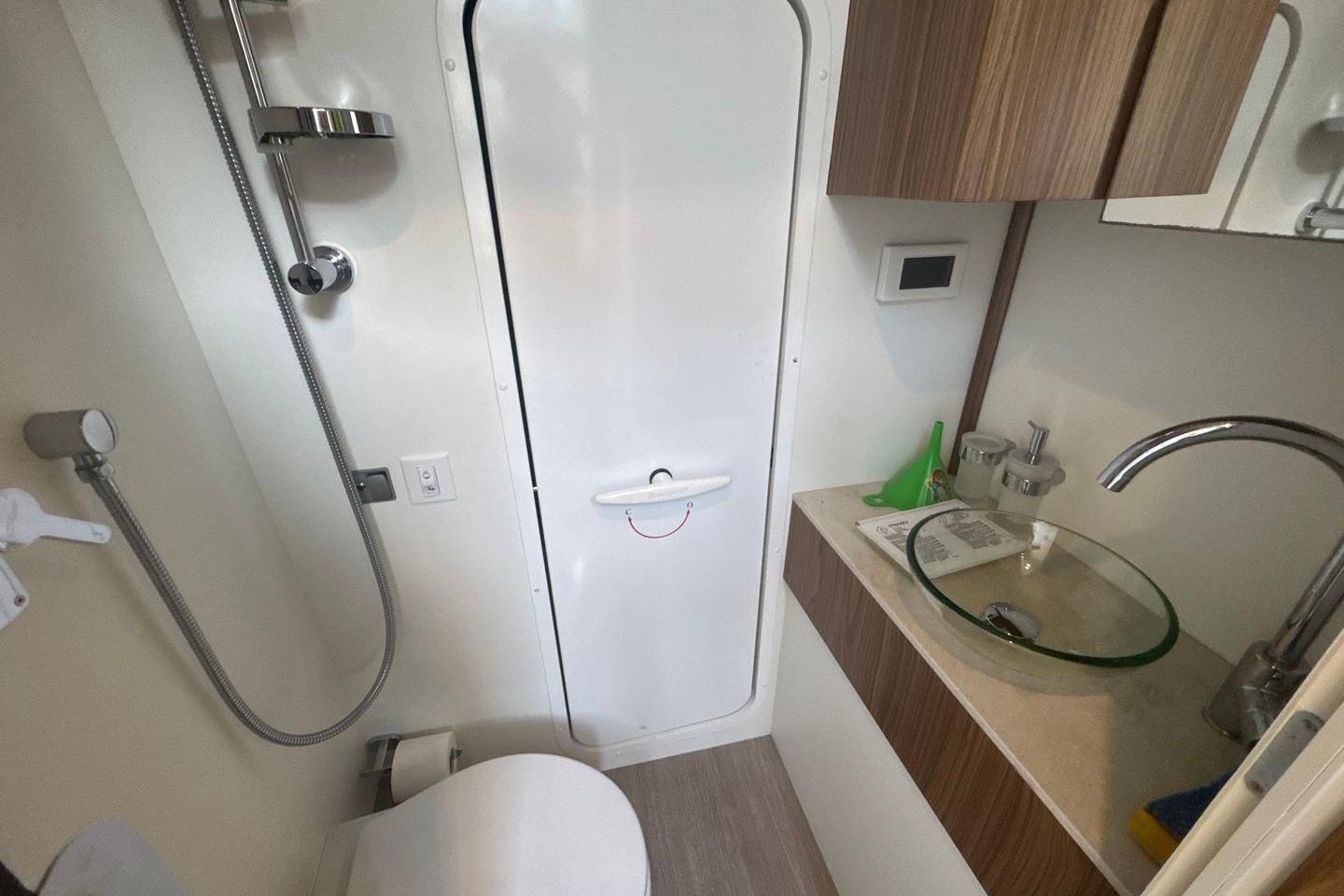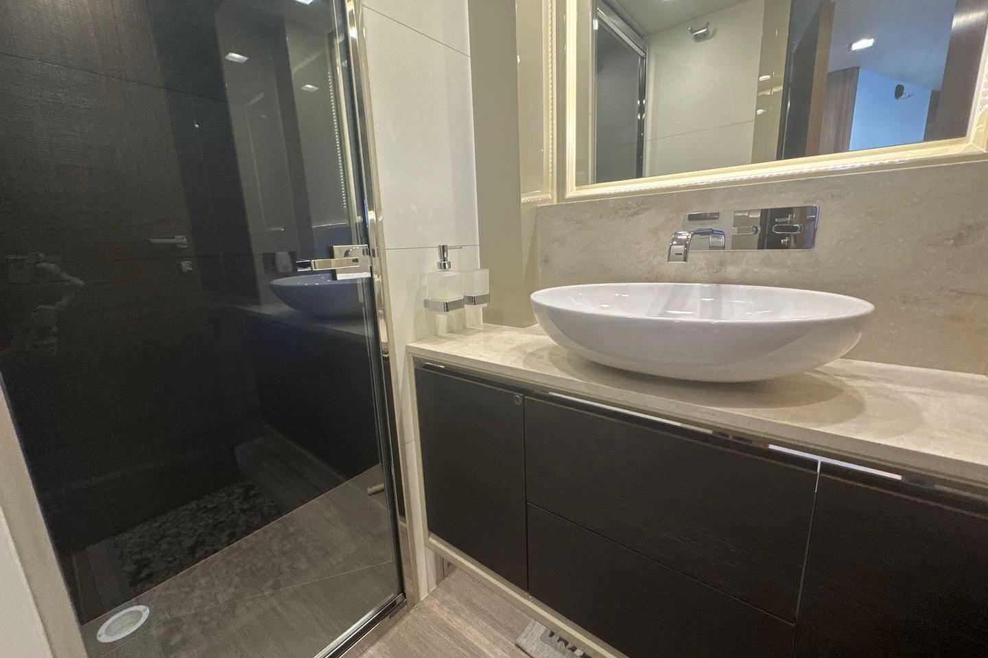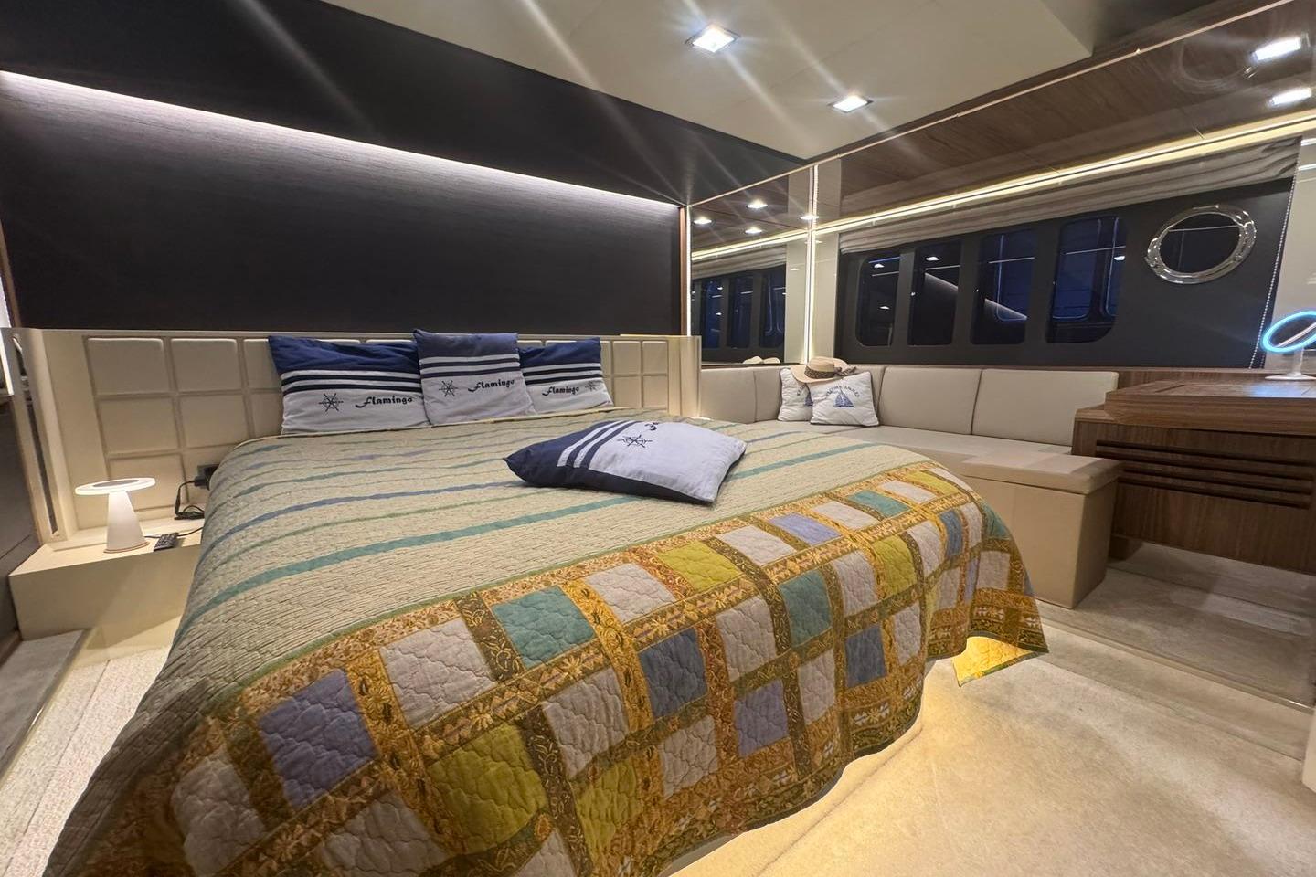 La cabine propriétaire se distingue par son aménagement raffiné et sa salle de bain privative avec un comptoir en marbre sur lequel repose une double vasque en céramique. Les cabines VIP et invités bénéficient, elles aussi, d'un confort exceptionnel, tandis qu'une quatrième cabine avec accès indépendant et salle d'eau, offre la possibilité d'accueillir deux membres d'équipage.