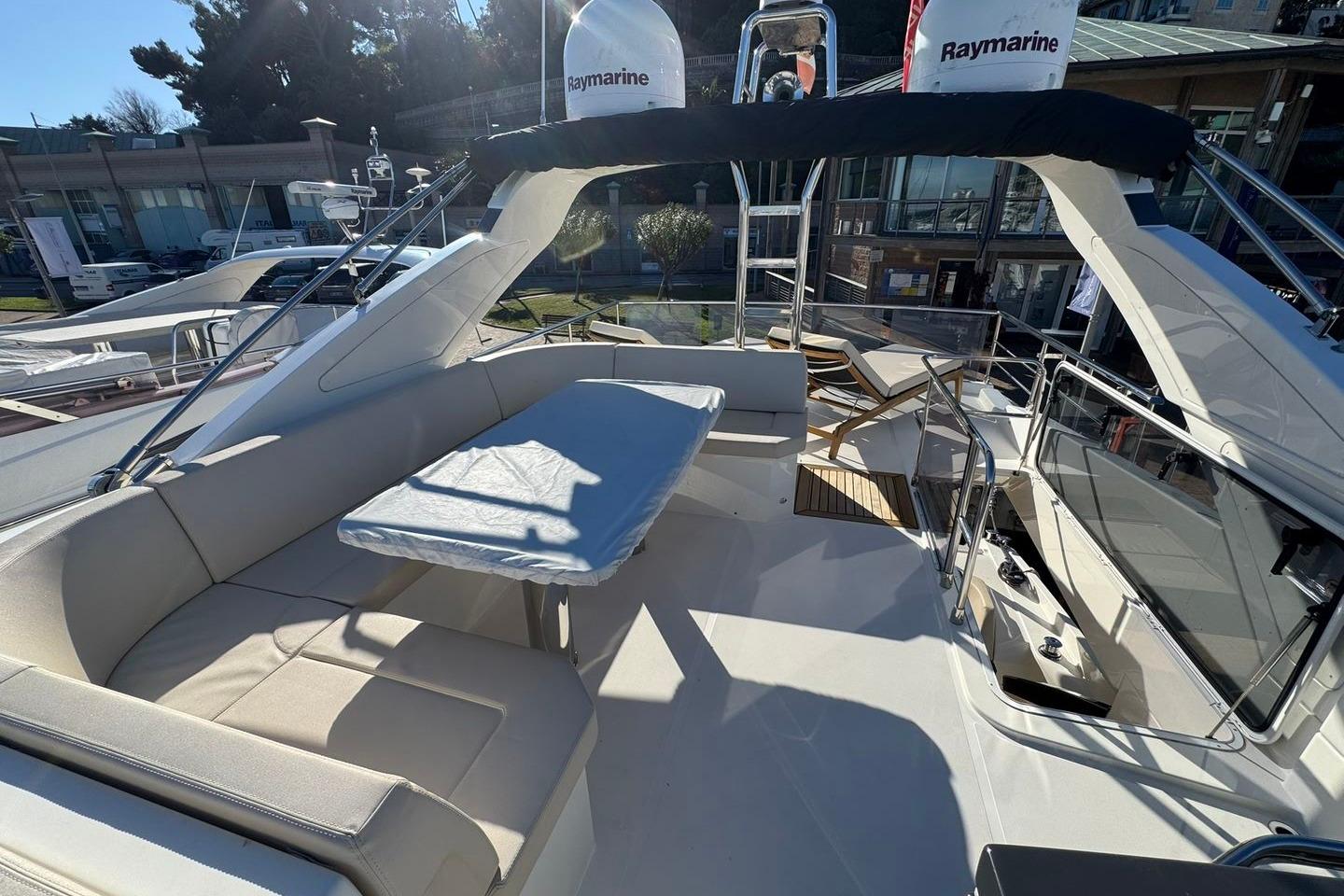 A bord, chaque détail a été pensé pour offrir une belle expérience de croisière et de partage. Le flybridge accueille un espace repas convivial, un vaste bain de soleil, complété par une cuisine extérieure entièrement équipée. Le tout est protégé par un bimini éléctro-hydraulique, permettant de profiter de chaque moment en mer, que ce soit sous le soleil ou à l'ombre. Le capitaine pourra être accompagné grâce au second siège pilote installé sur le flybridge. De quoi profiter pleinement de la vie en plein air.