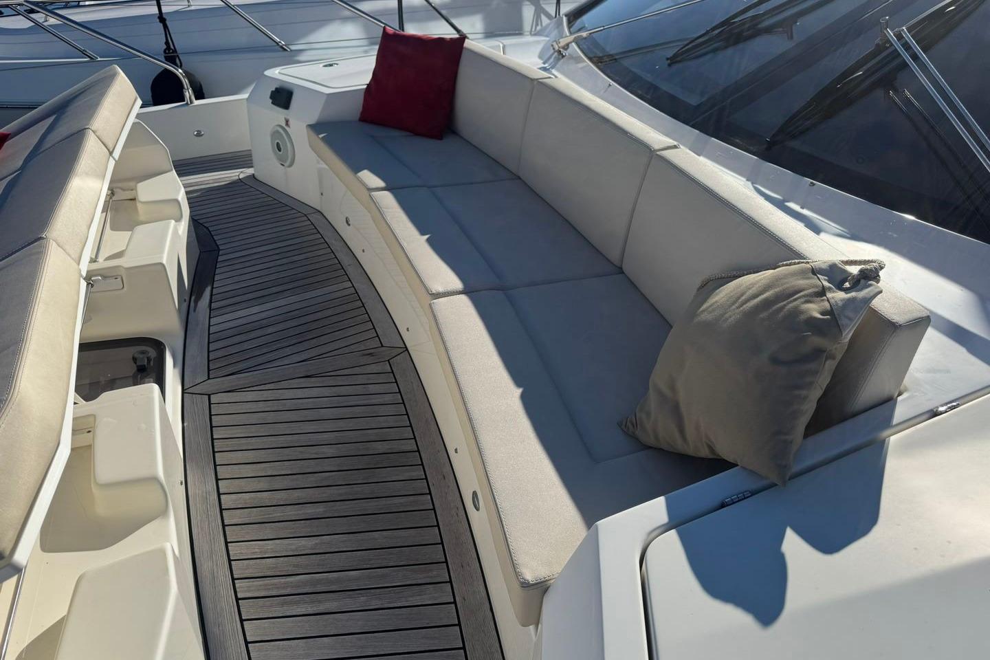 Le cockpit, quant à lui, fait office d'espace lounge que l'on peut rendre plus intime grâce à son rideau électrique pare-soleil, ou de vastes solariums, parfaits pour profiter au mouillage. Ce bateau est réellement pensé pour vos détentes ensoleillées grâce à son troisième bain de soleil situé sur le pont avant, invitant à profiter du paysage et du farniente.