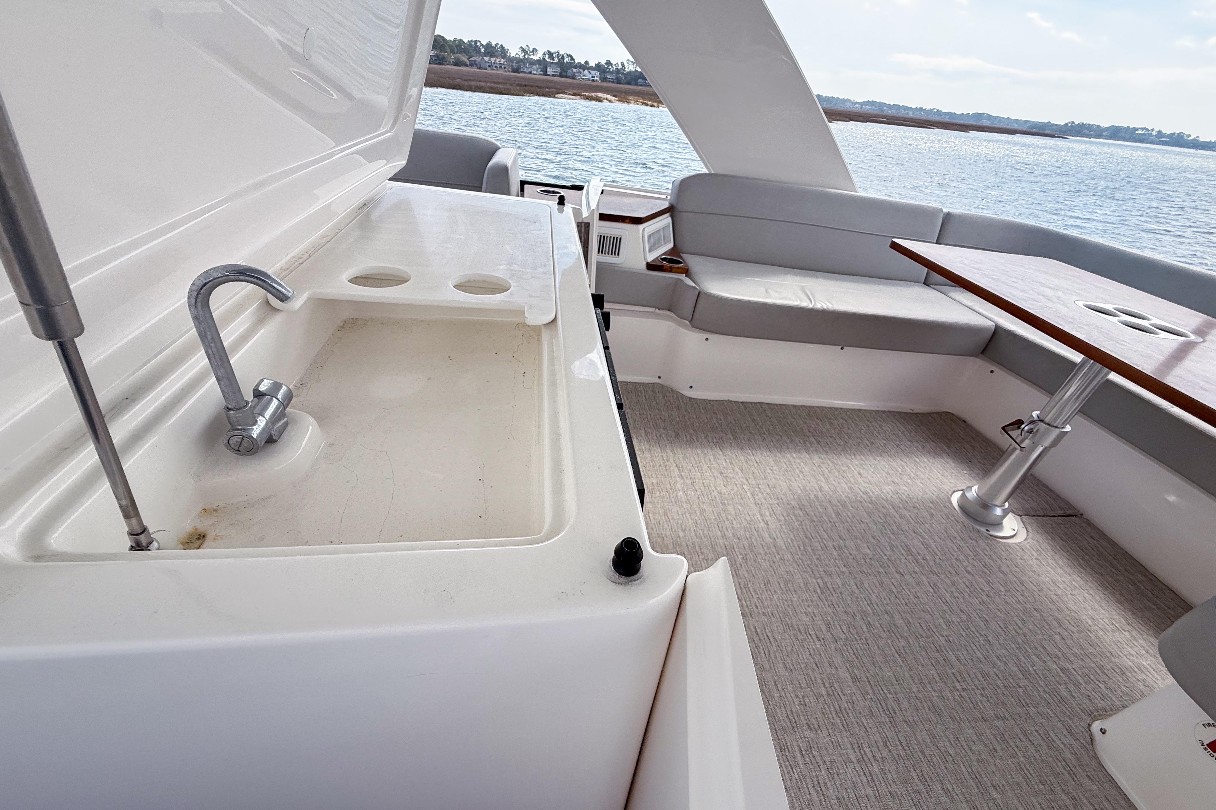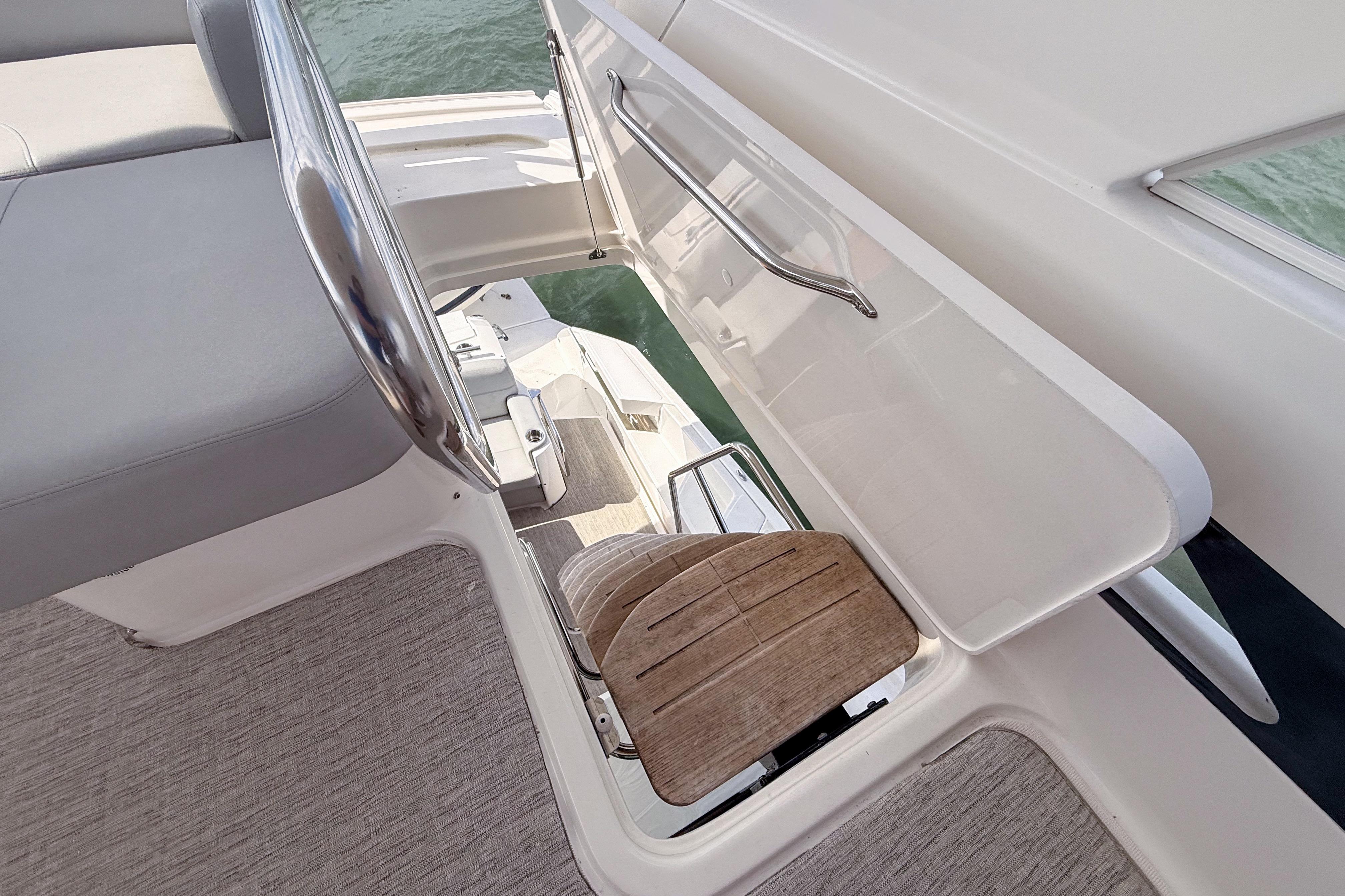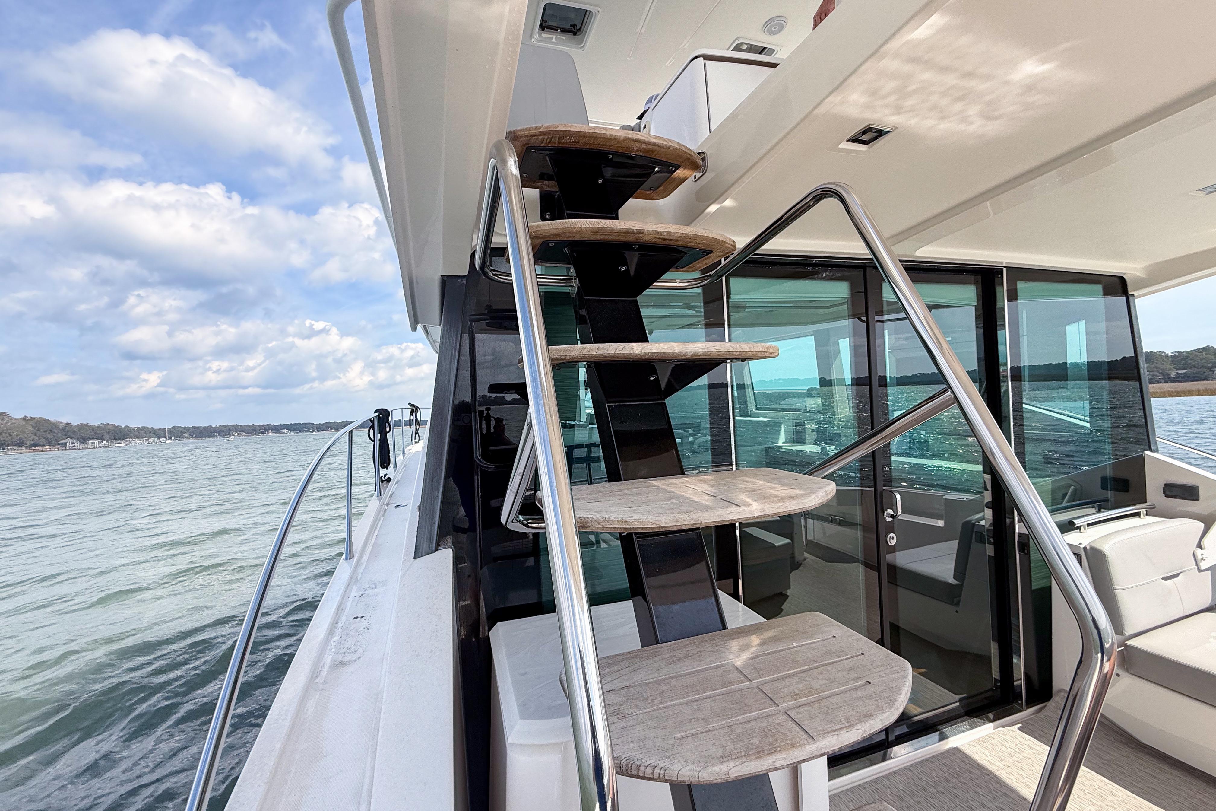 The layout offers seamless indoor-outdoor flow from cockpit to salon.