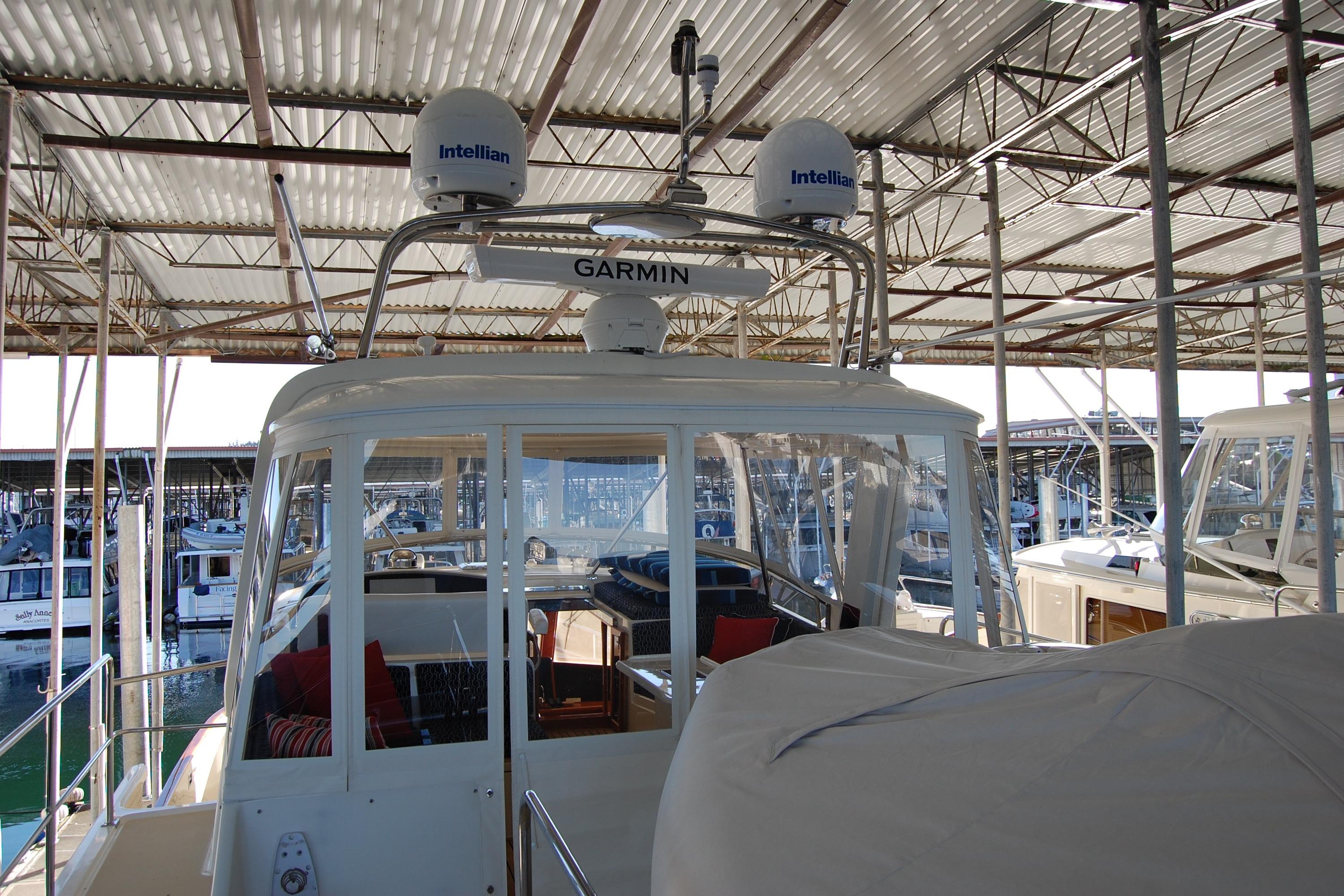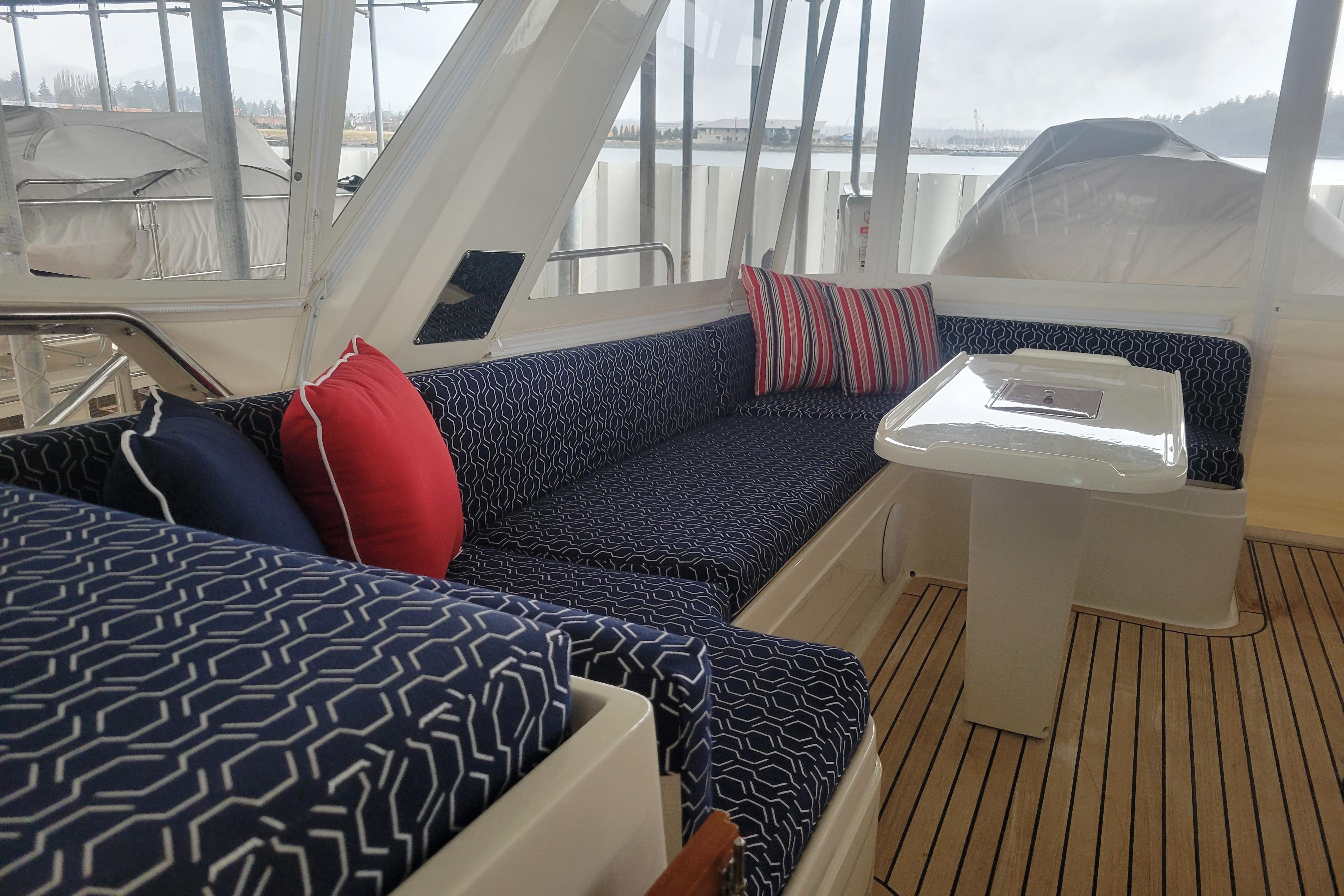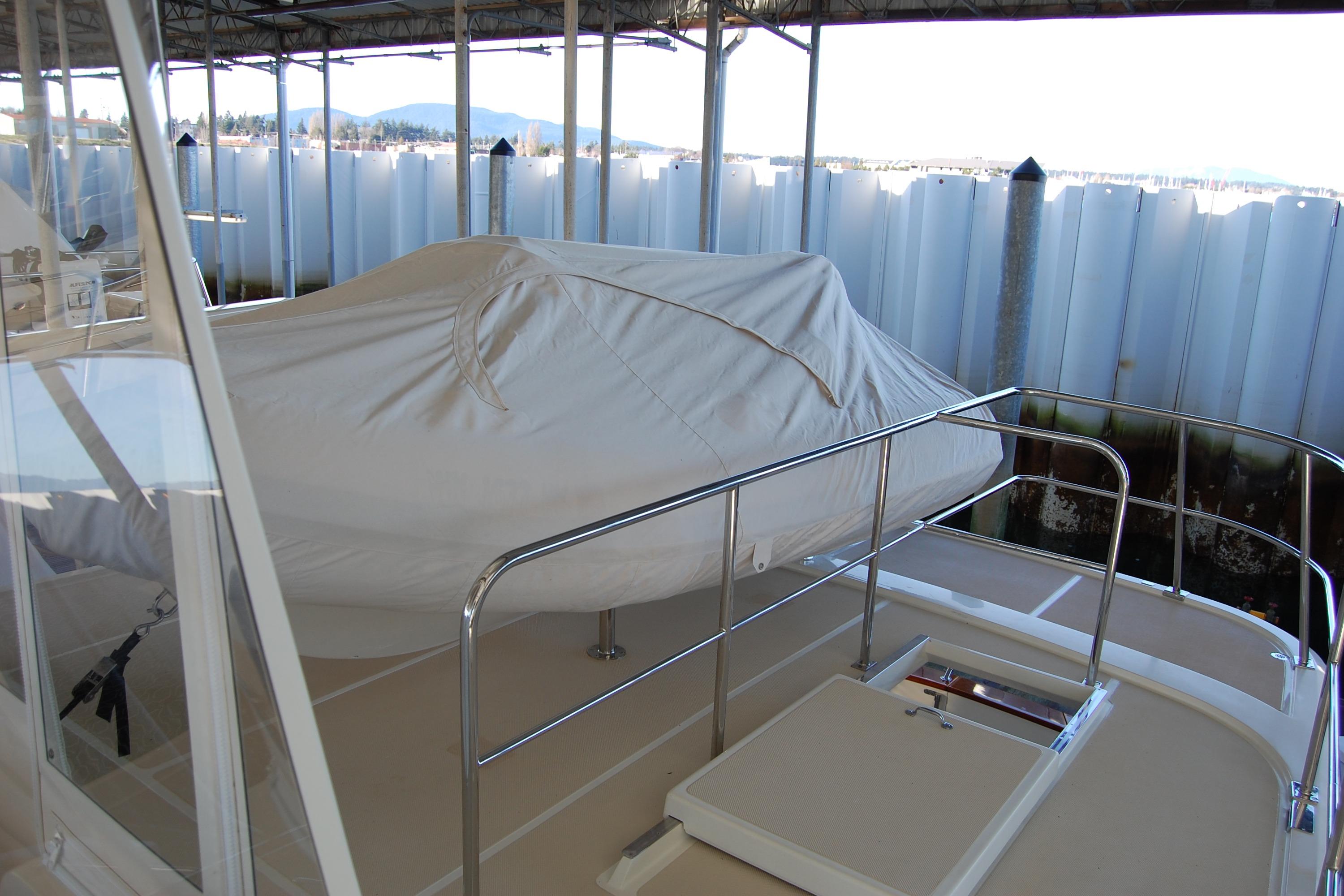 The flybridge is easily accessed from the interior steps in the pilothouse or by the ladder from the cockpit. It features a two-seat upper helm station located to port that provides excellent visibility particularly in close quarters with its 360 degree visibility. The electronics console is large enough to house an array of equipment with easy access to the rear of the console available by hinging open the bookshelf behind the pilothouse settee below. The starboard side of the flybridge features a U-shaped settee with a table. Aft of the helm on the port side consists of an additional settee and the hatch for the galley. The following aft boat deck features a starboard side mounted steelhead fully hydraulic davit, 12ft Walker Bay Tender with 40 Yamaha
