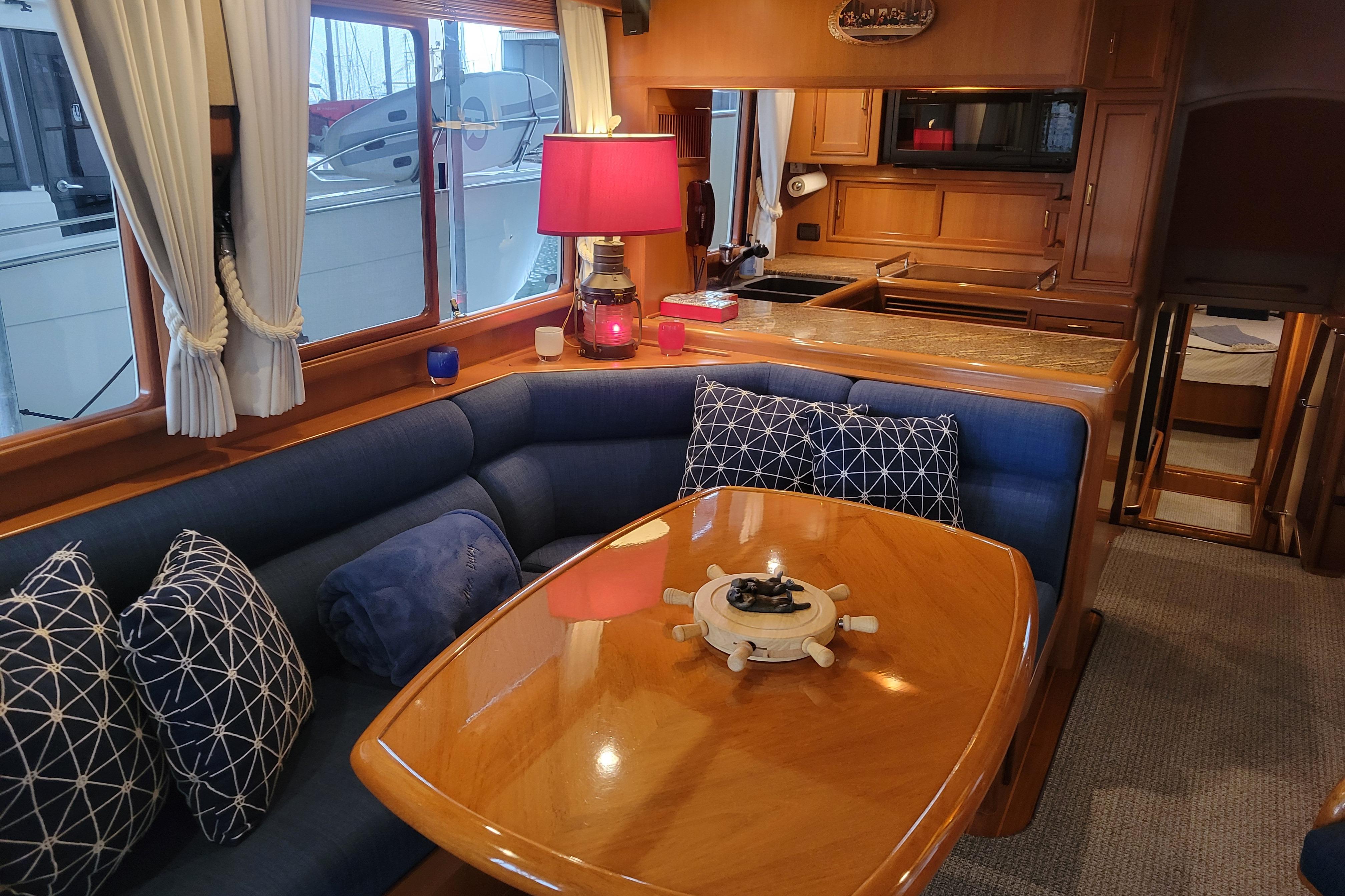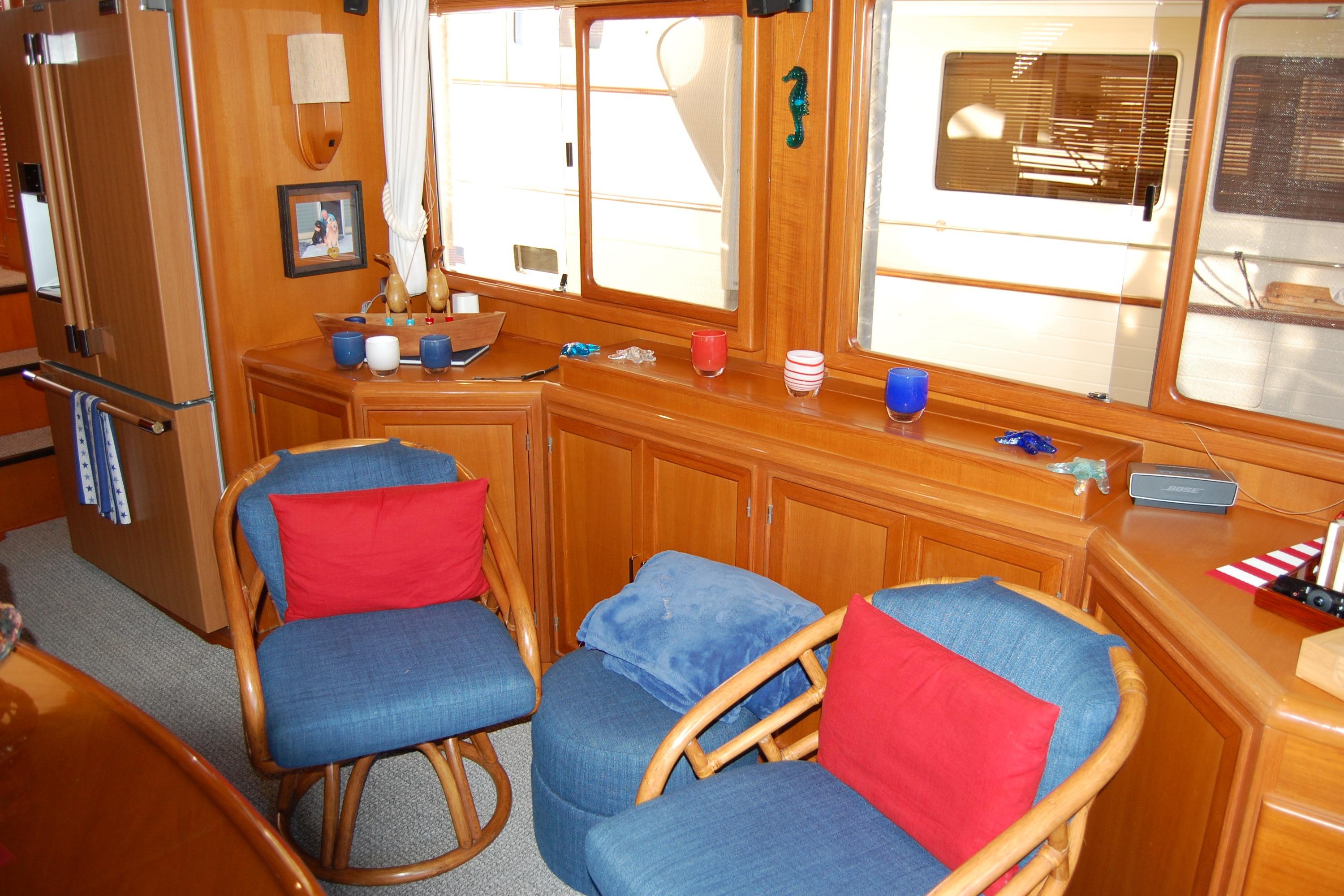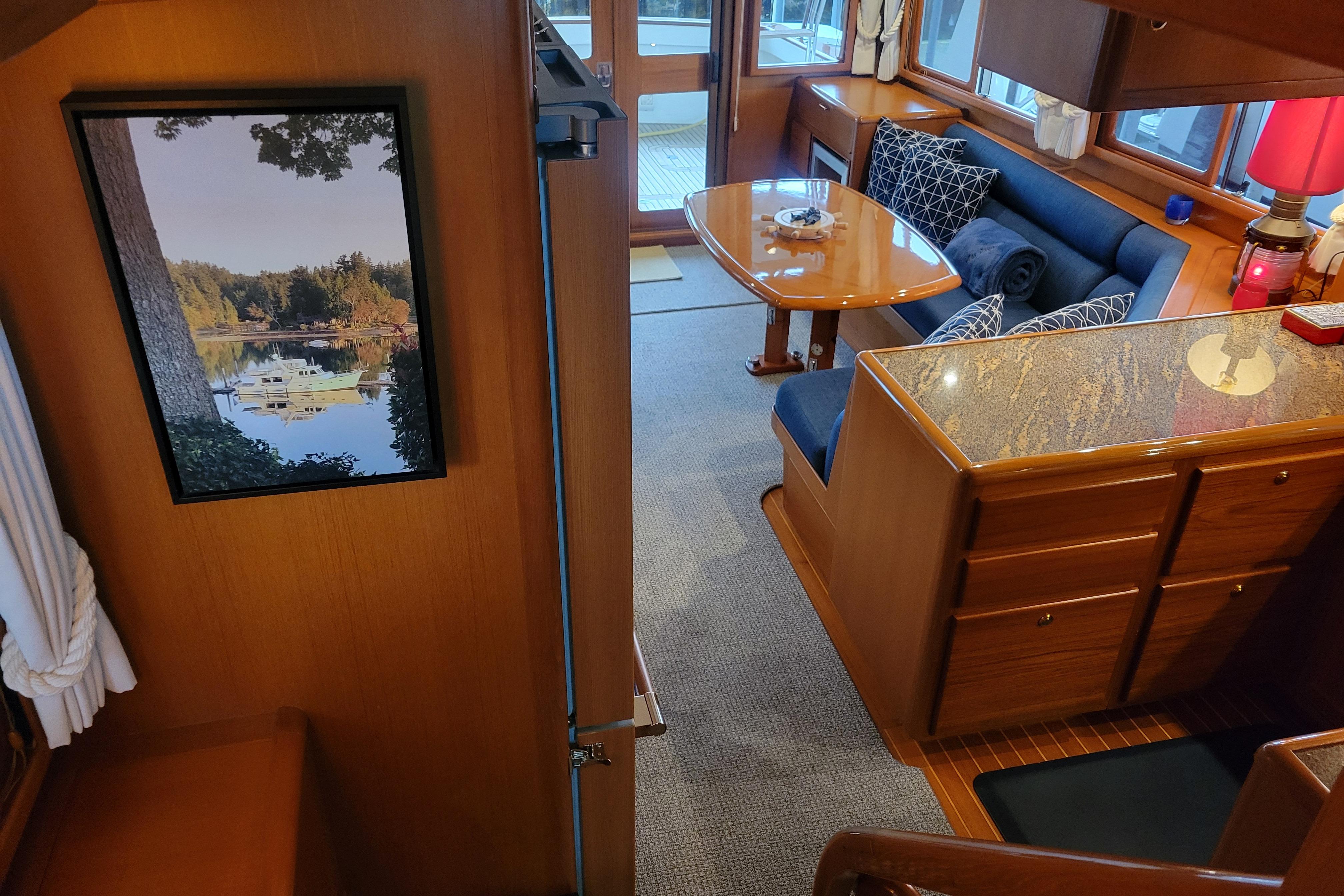 Entering from the aft cockpit deck you are immediately greeted with a capacious salon. Featuring the timeless appeal of satin teak cabinetry, surrounding opening windows, and ultimately, an interior layout that balances form with function.This layout allows for an open social environment between salon and galley while keeping the function of the galley separated from the dedicated pilothouse. With a 16’ beam, this open floor plan makes entertaining guests an effortless endeavor. Starting at the port side of the salon is a large L-shaped settee anchored by a cabinet and storage. At the starboard side is a built in storage with additional storage space found beneath the port side settee. An entertainment center to the forward corner of the starboard settee features audio-video equipment fit behind a teak cabinet and a 40” HD TV is situated on a retractable hydraulic lift at the starboard side.