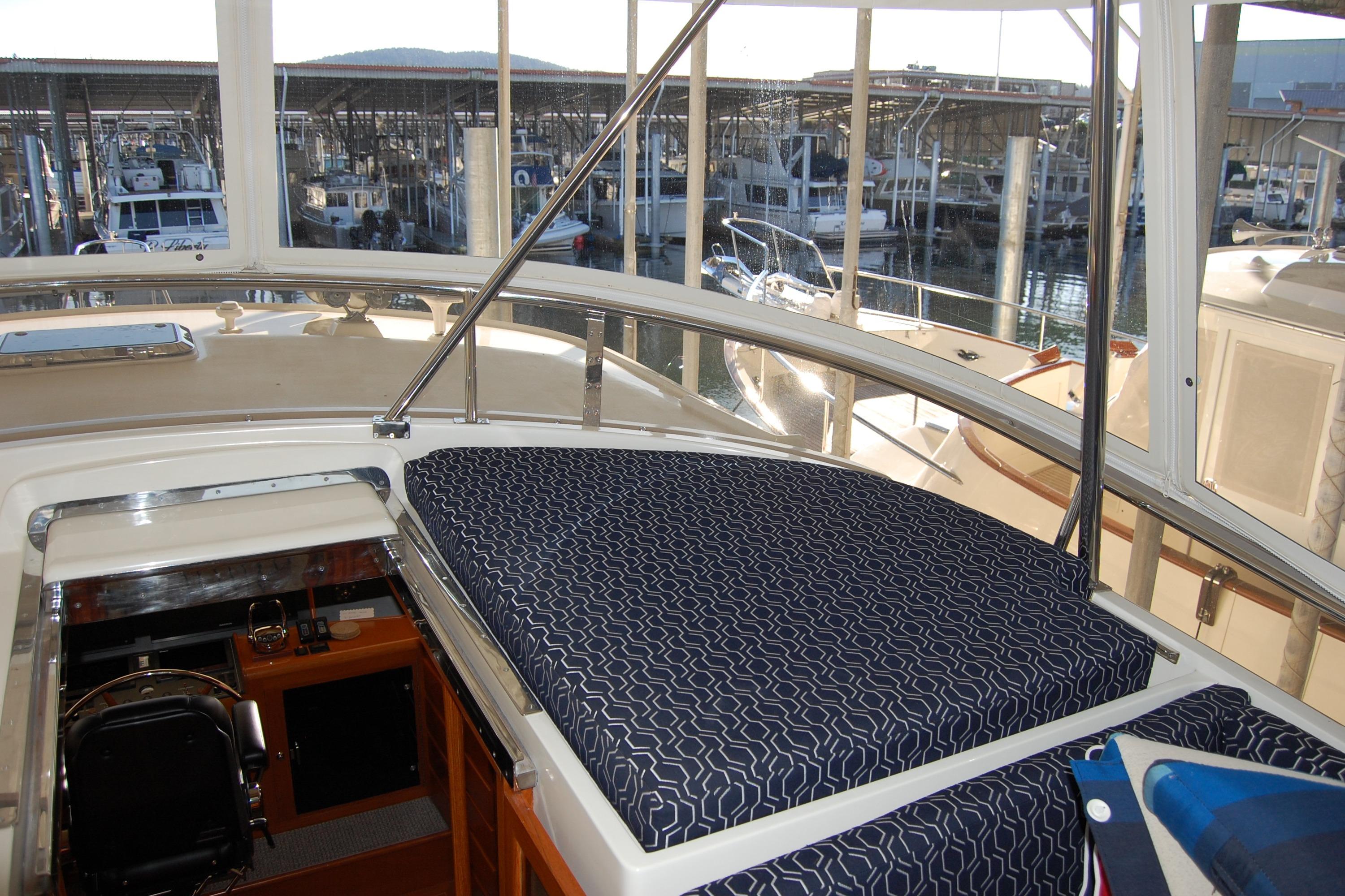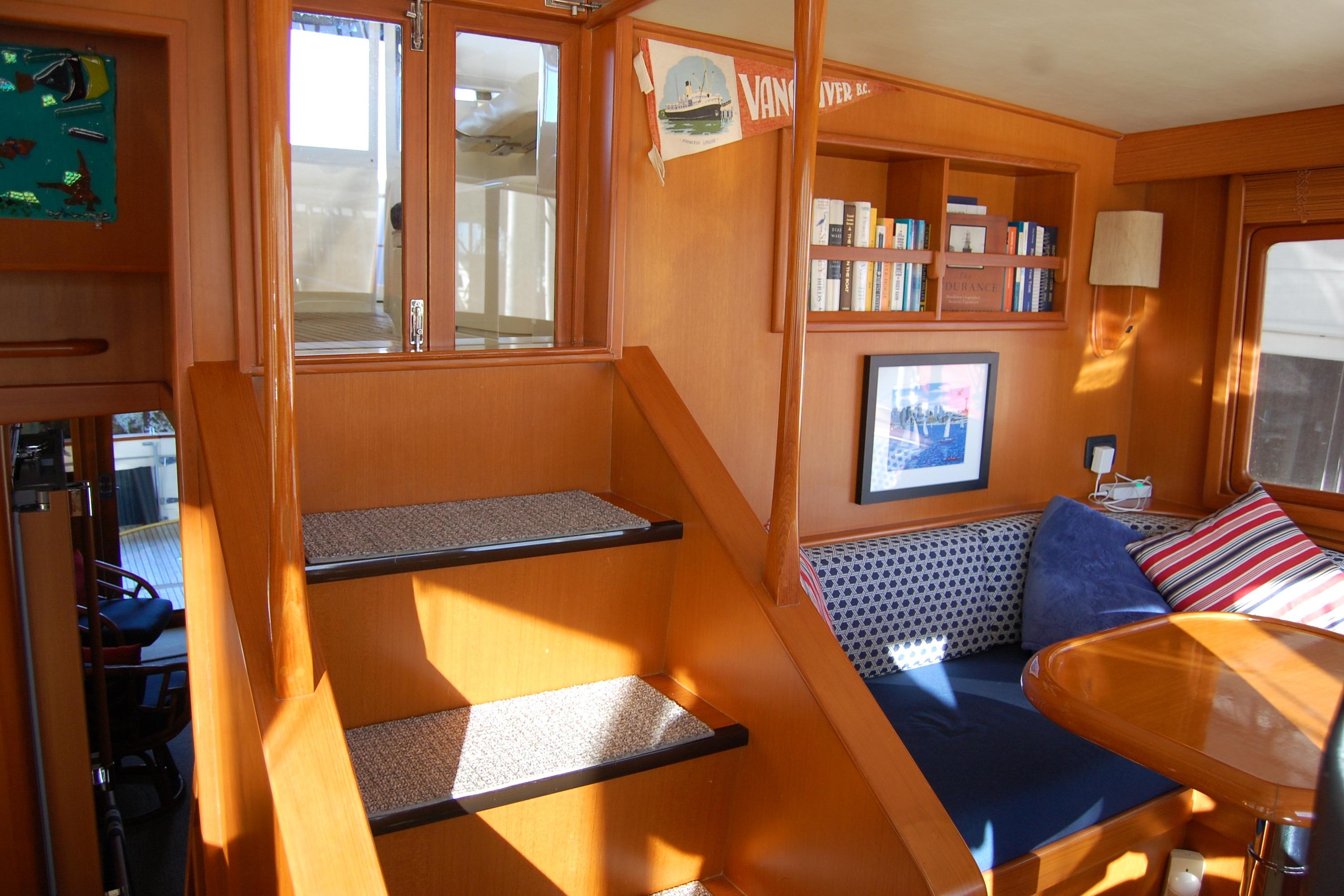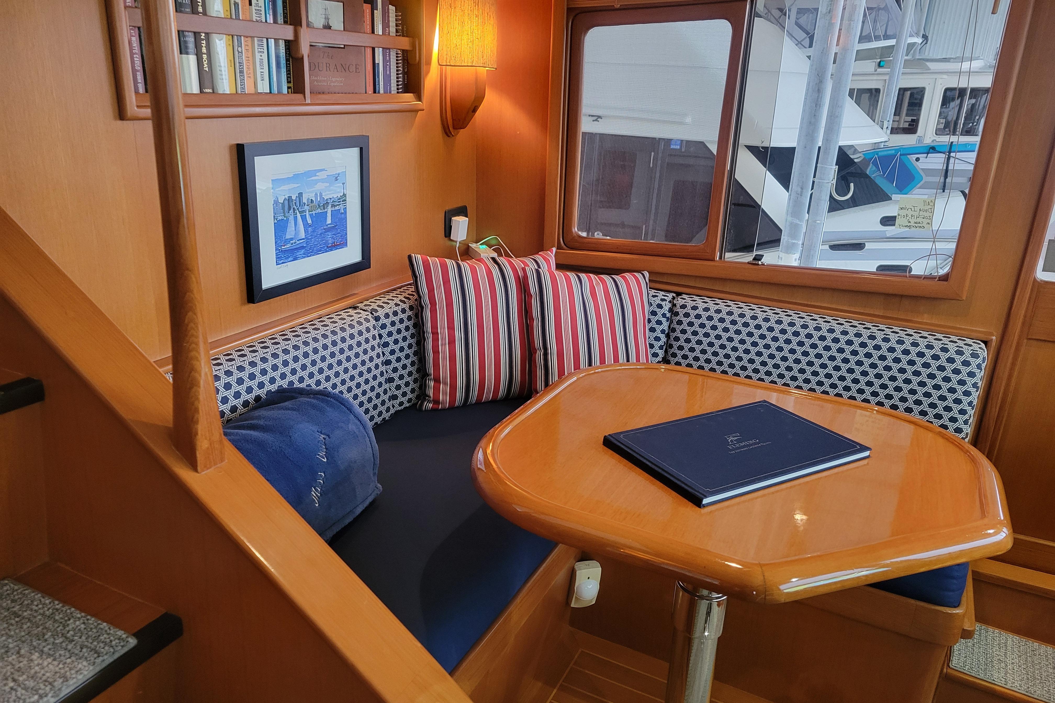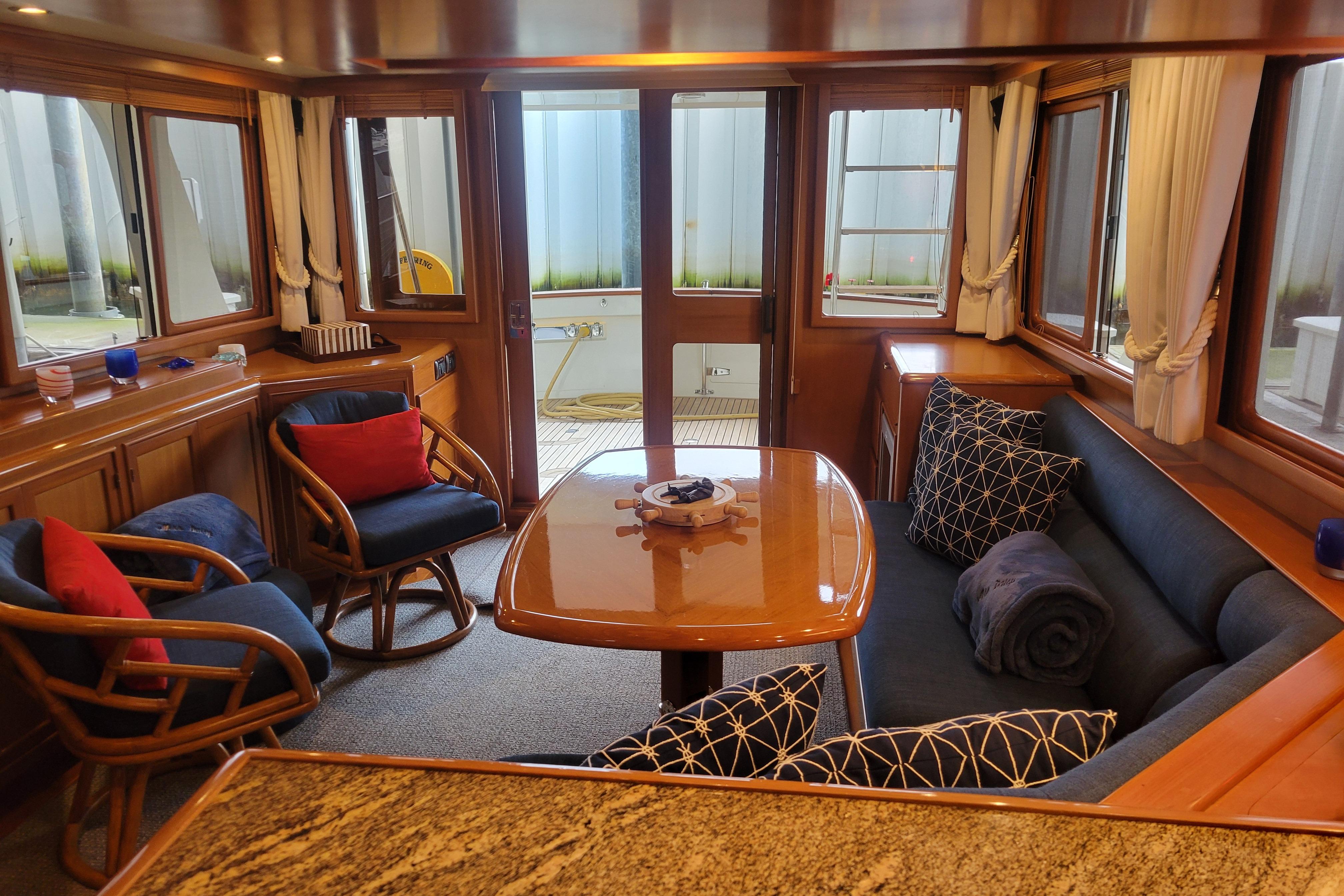Visibility forward and wrapping around to port and starboard windows is excellent. Below the expansive windshield are consoles which provide ample room for a full range of modern electronics and equipment without intruding on the engine instrumentation. Overhead consoles provide additional space for equipment within easy reach. Both AC and DC electrical breaker panels are below the console to either side and can be swung open to provide complete access. There is a proper chart area to the starboard side with large drawers for charts, cruising guides, navigation instruments, binoculars, and other necessities. Centered along each port and starboard side of the pilothouse are sliding doors that lead out to the side Portuguese decks. Port and aft resides a raised L-shaped settee and table which provides a comfortable social area with phenomenal visibility while underway. Starboard and aft you will find additional storage through cabinets and drawers, as well as a wet locker for foul weather gear. A proper stainless steel and teak-trimmed destroyer wheel and a new STIDD helm chair completes the pilothouse and perfectly accent this ultimate cruising yacht.