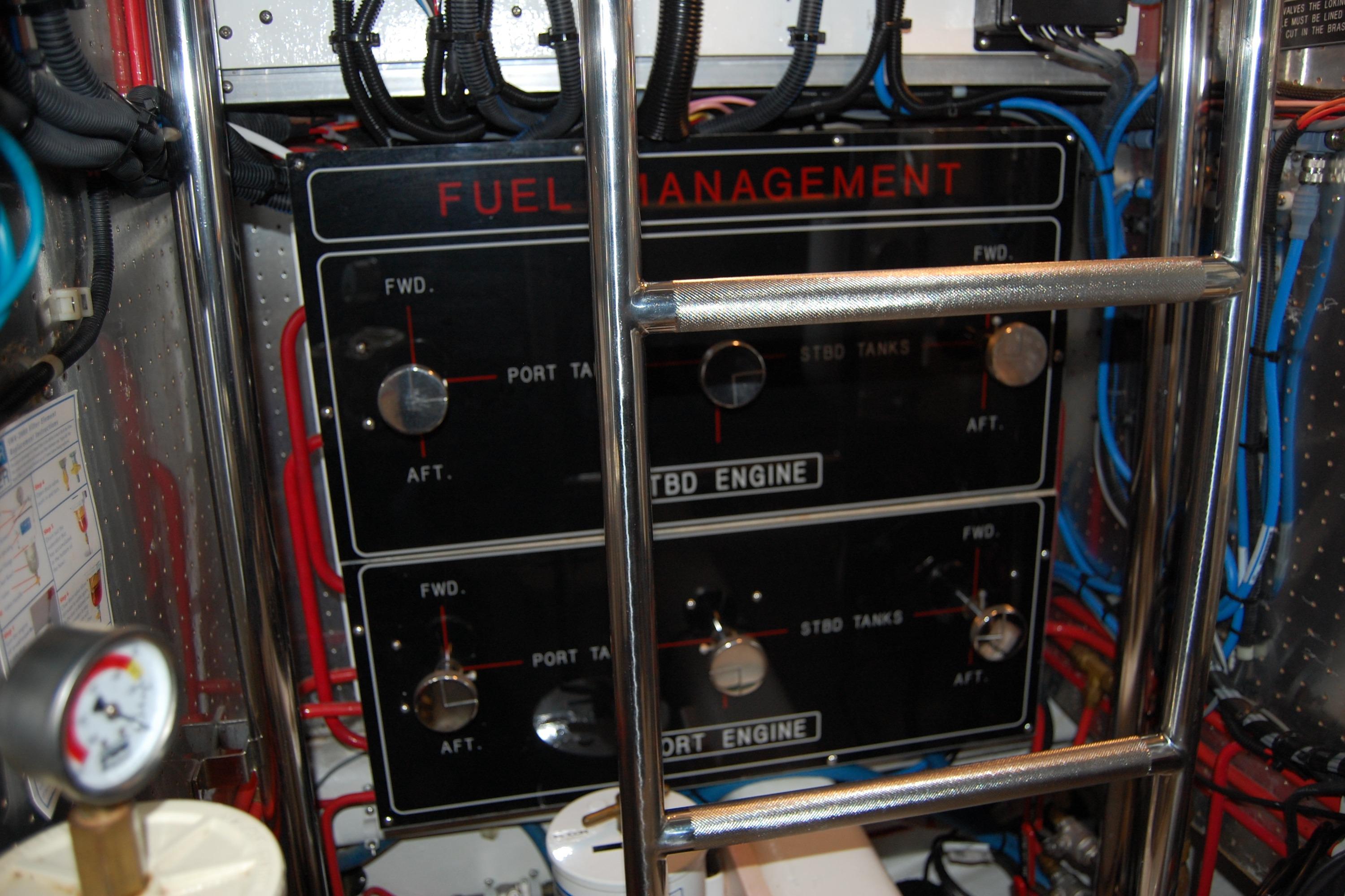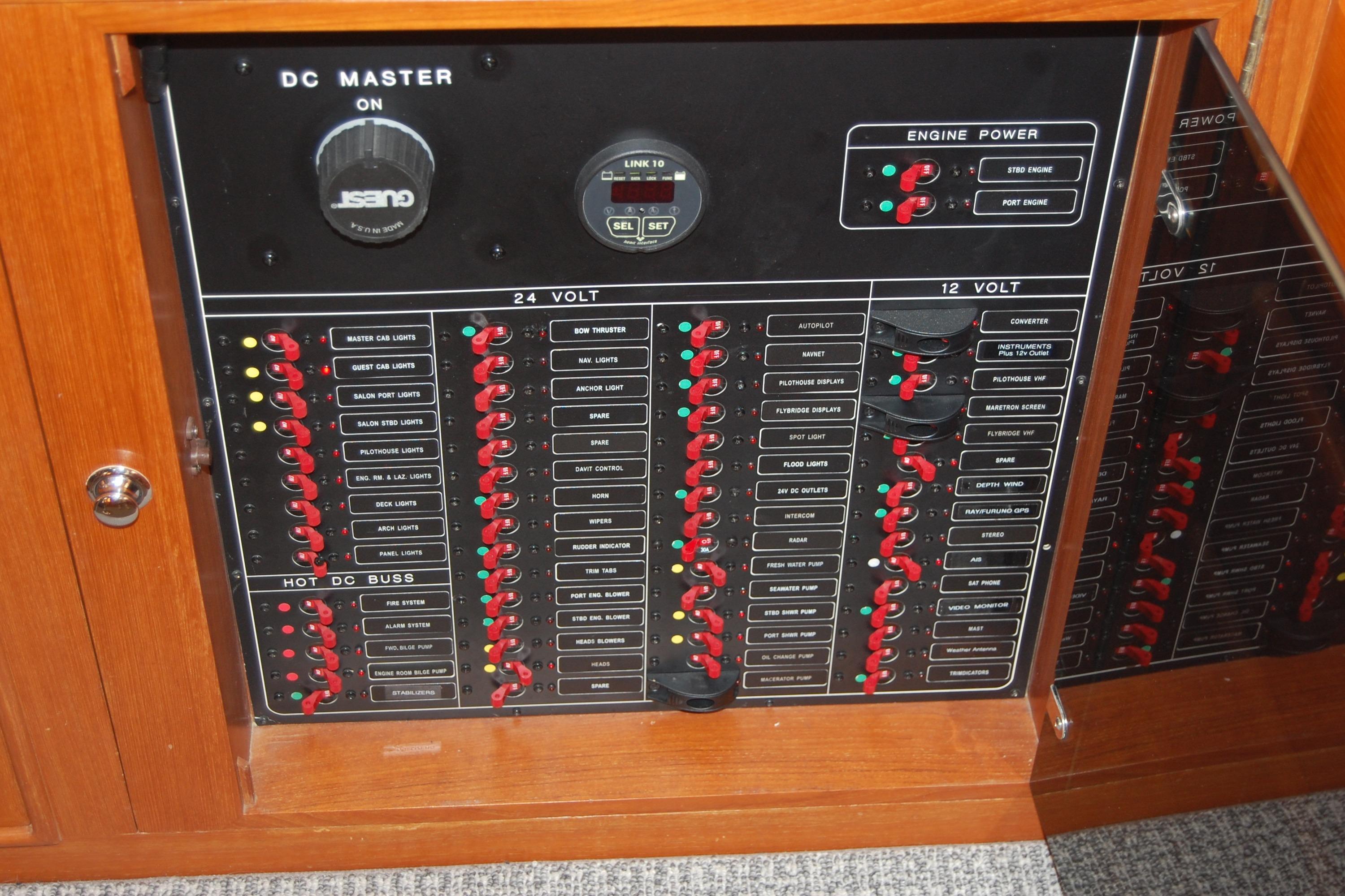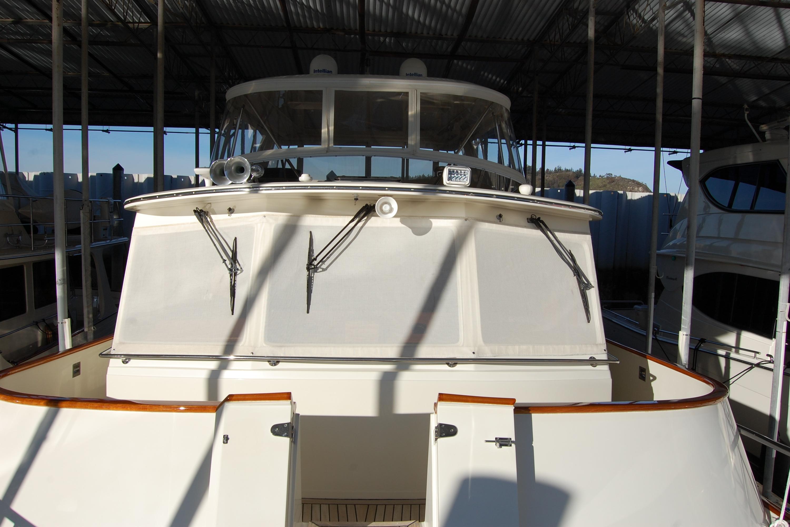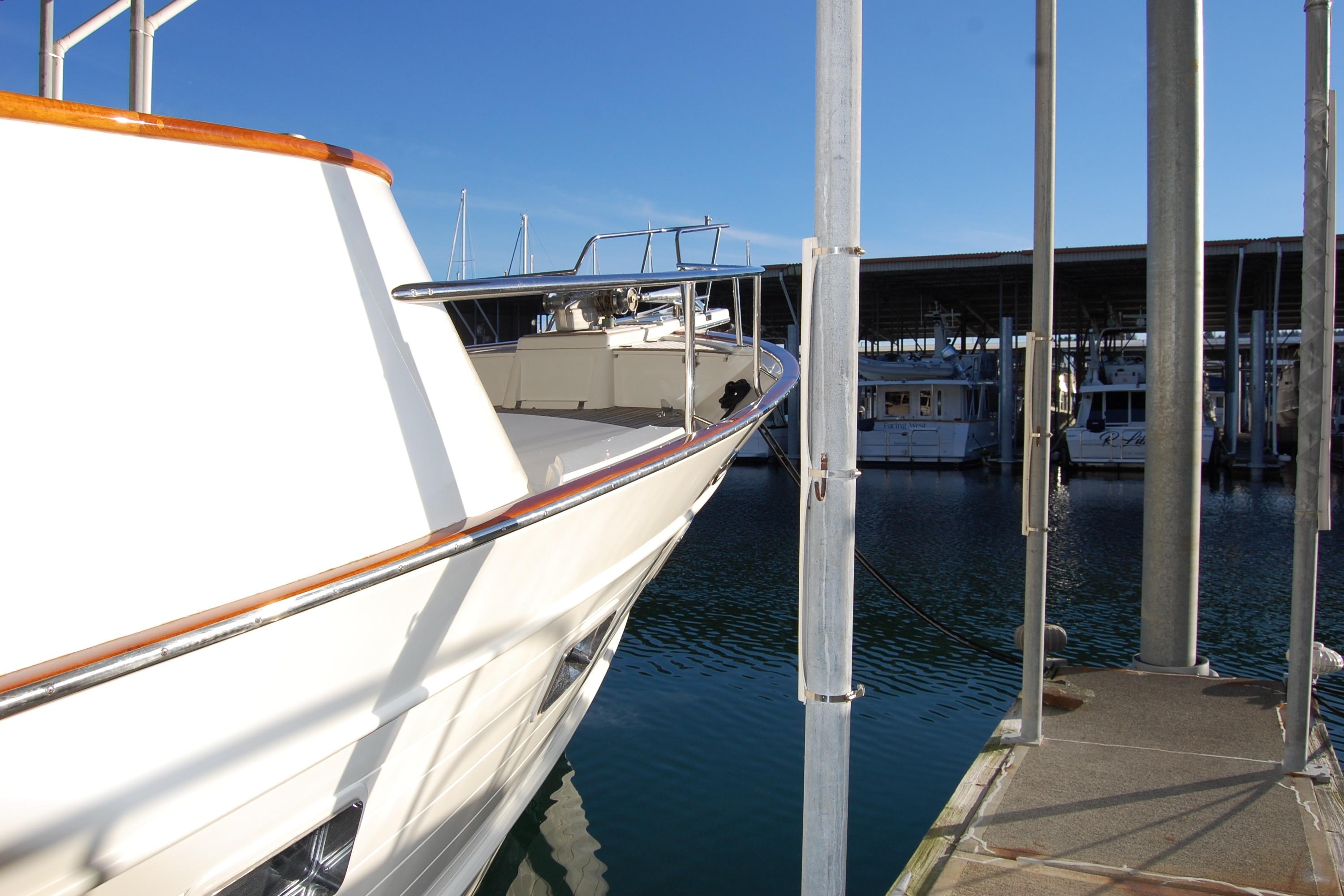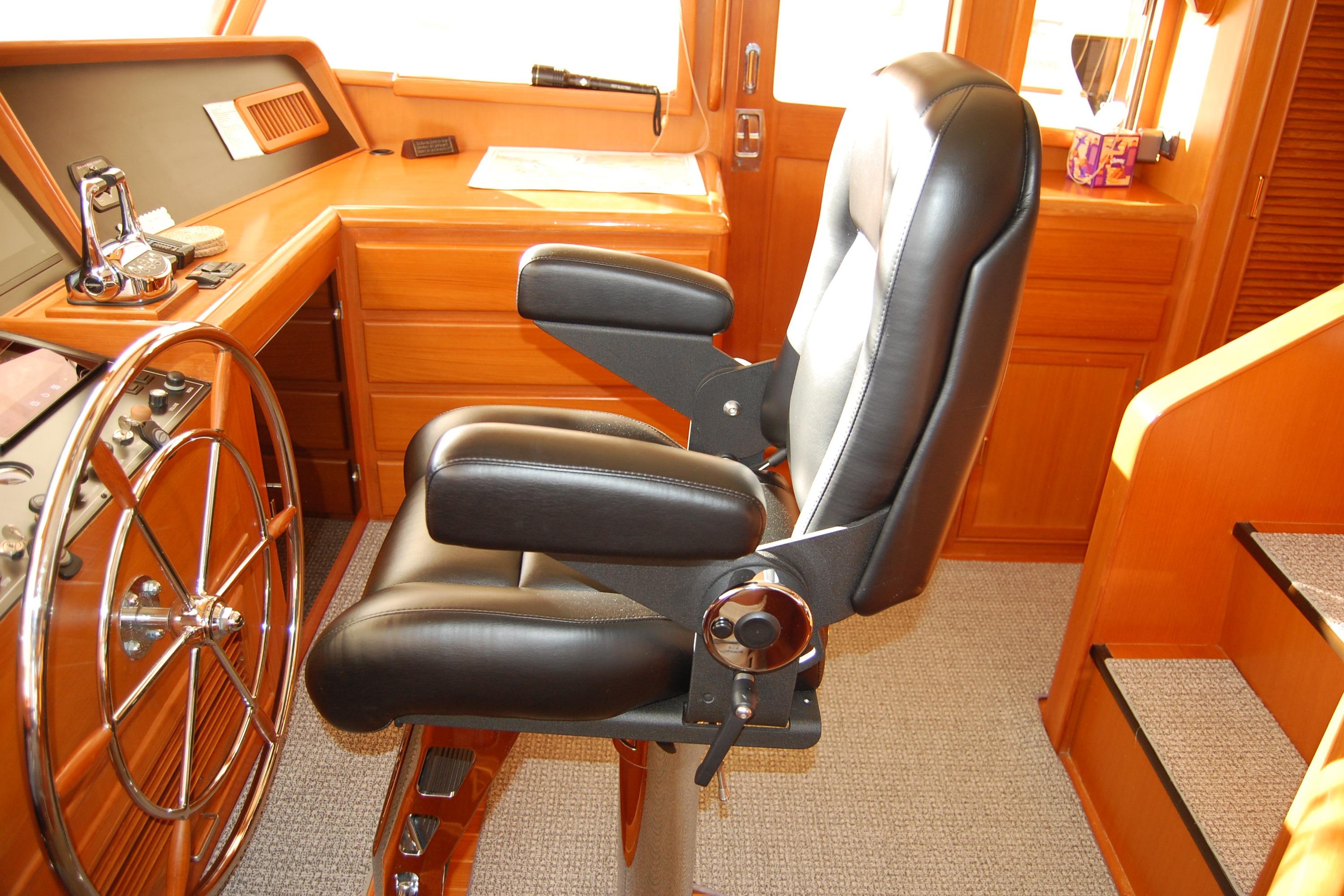Visibility forward and wrapping around to port and starboard windows is excellent. Below the expansive windshield are consoles which provide ample room for a full range of modern electronics and equipment without intruding on the engine instrumentation. Overhead consoles provide additional space for equipment within easy reach. Both AC and DC electrical breaker panels are below the console to either side and can be swung open to provide complete access. There is a proper chart area to the starboard side with large drawers for charts, cruising guides, navigation instruments, binoculars, and other necessities. Centered along each port and starboard side of the pilothouse are sliding doors that lead out to the side Portuguese decks. Port and aft resides a raised L-shaped settee and table which provides a comfortable social area with phenomenal visibility while underway. Starboard and aft you will find additional storage through cabinets and drawers, as well as a wet locker for foul weather gear. A proper stainless steel and teak-trimmed destroyer wheel and a new STIDD helm chair completes the pilothouse and perfectly accent this ultimate cruising yacht.