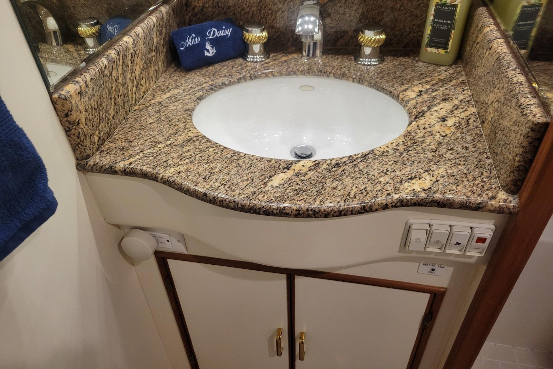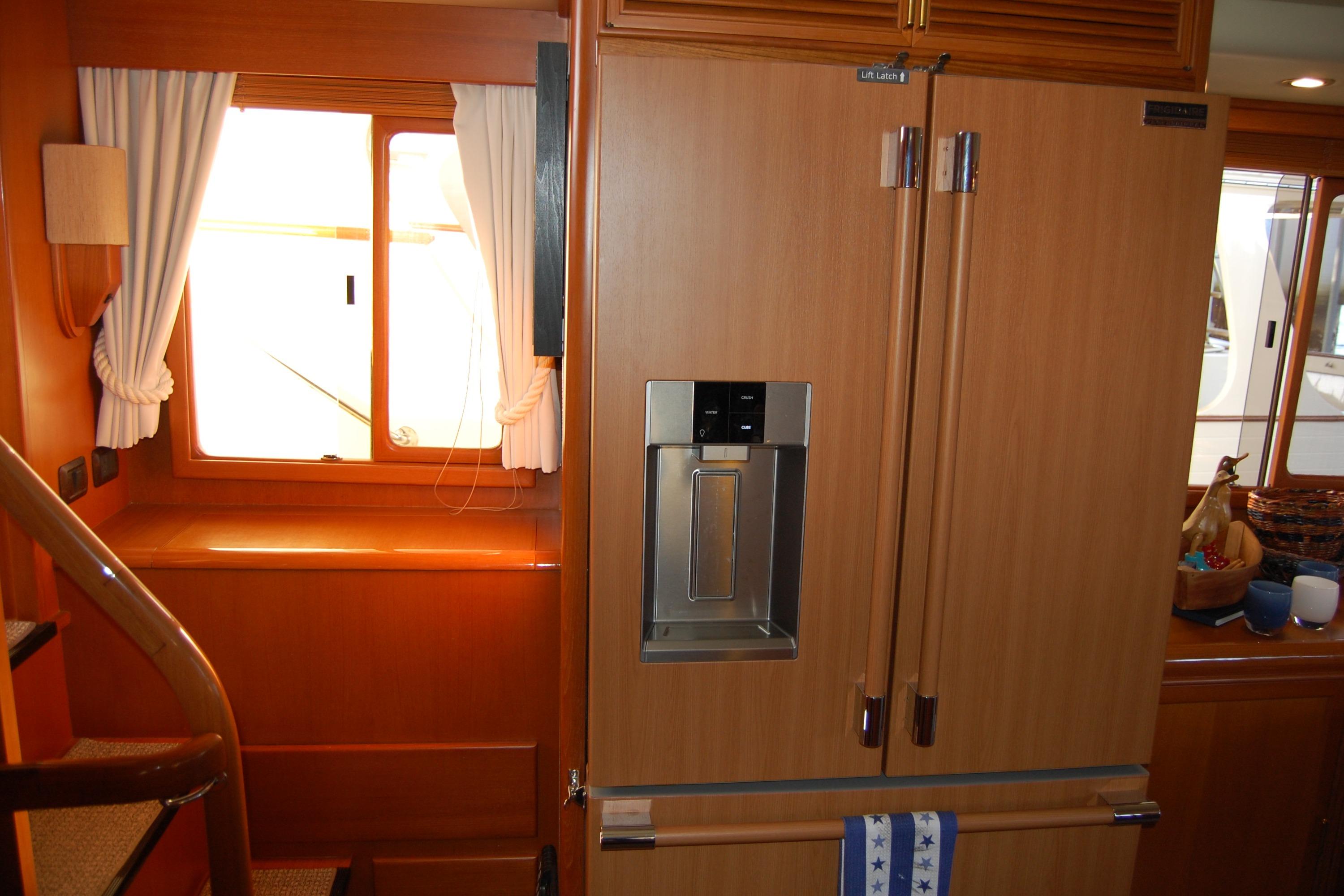 The galley is tucked to the port side just forward of the salon, which is separated by a large granite countertop peninsula and overhead galley cabinets . Wrapping around the U-shaped counter of the galley you will find a stainless-steel double[1]bowl sink, a ceramic three burner cooktop with custom potholders, a convection microwave overhead, and trash compactor. Teak cabinets fill in the rest of the galley including a storage compartment just forward of the cook top that can accommodate a full range of cookware. Across to the opposing starboard side is a dish storage compartment additional storage drawers, and a full-sized refrigerator/freezer.