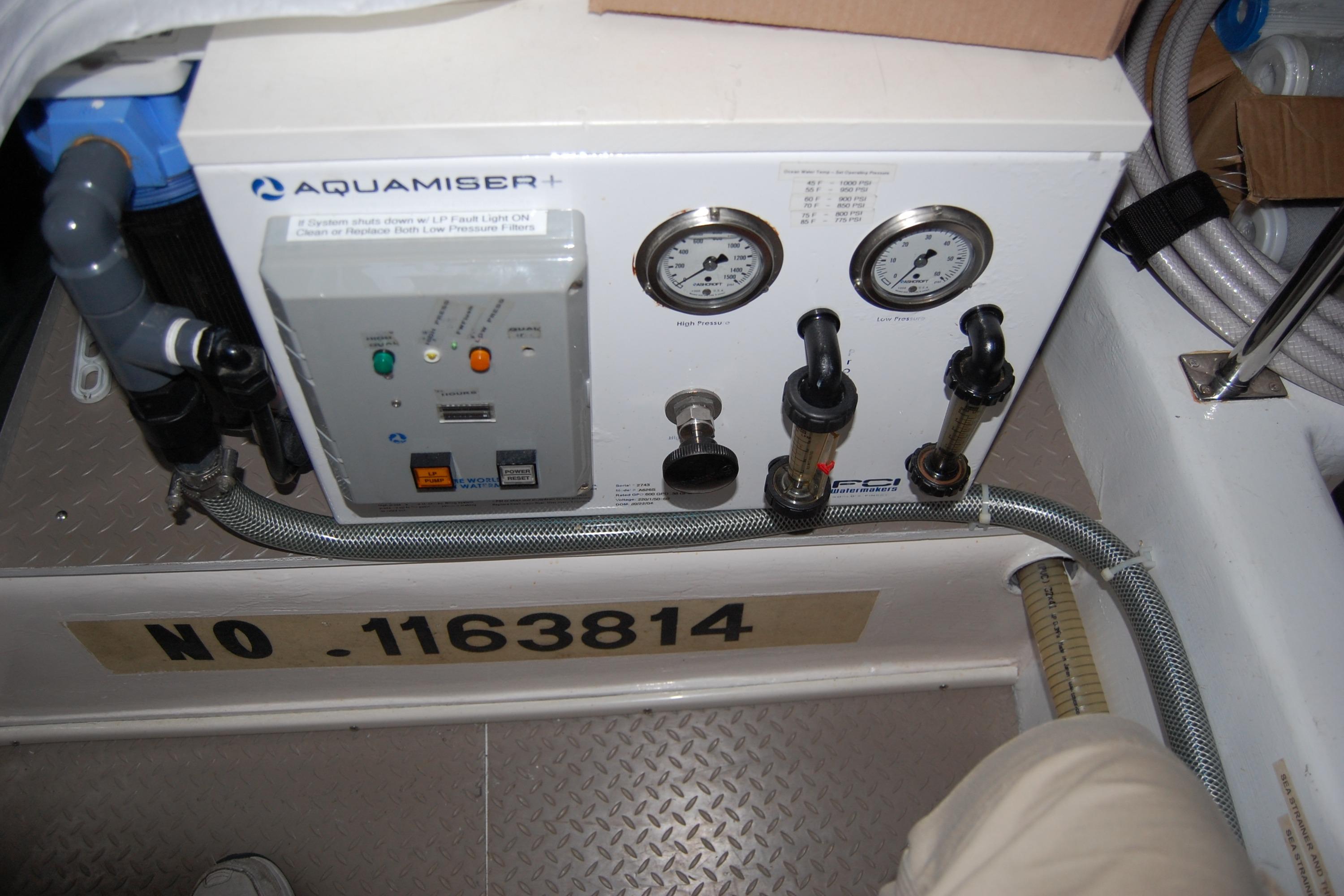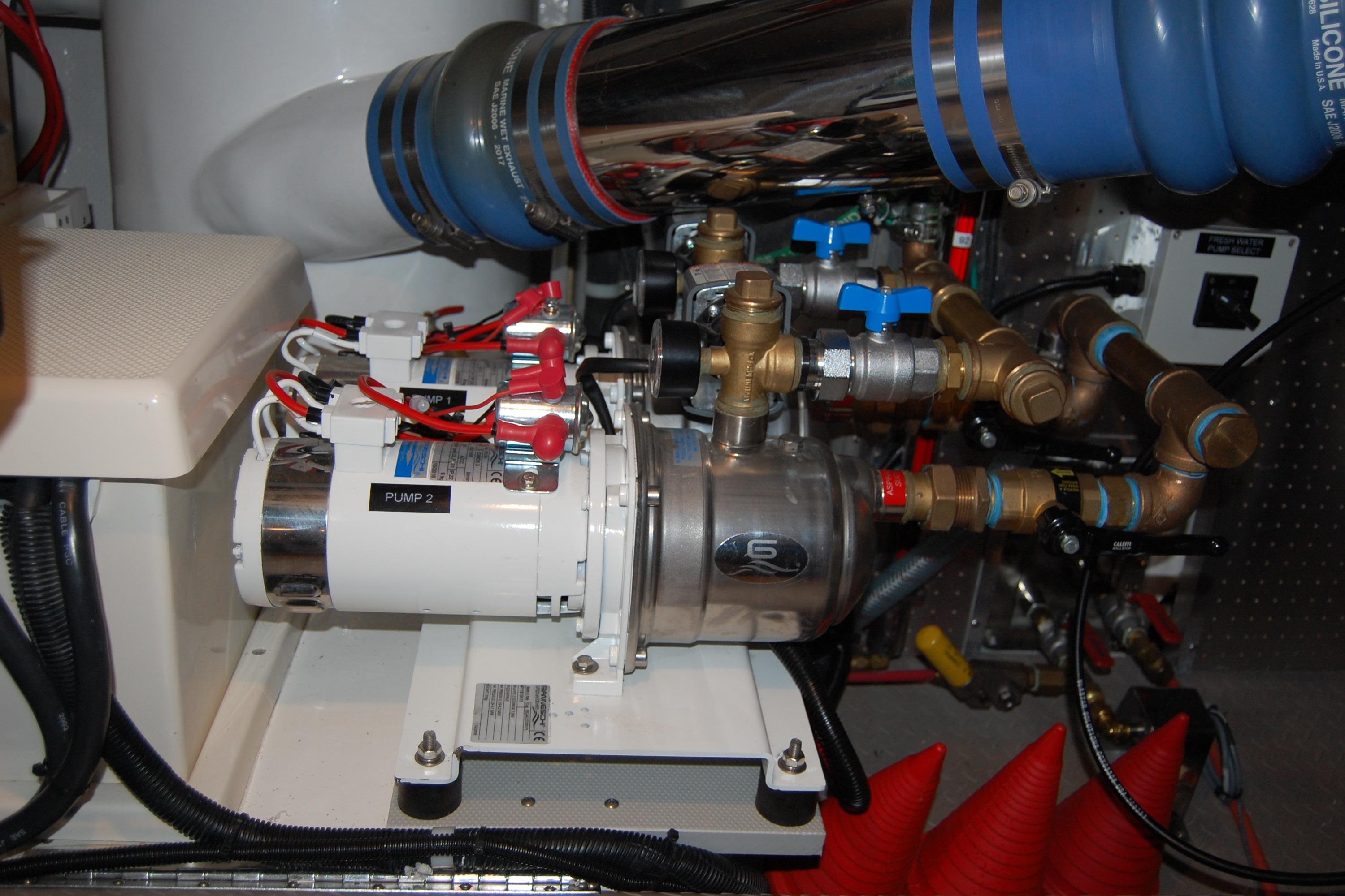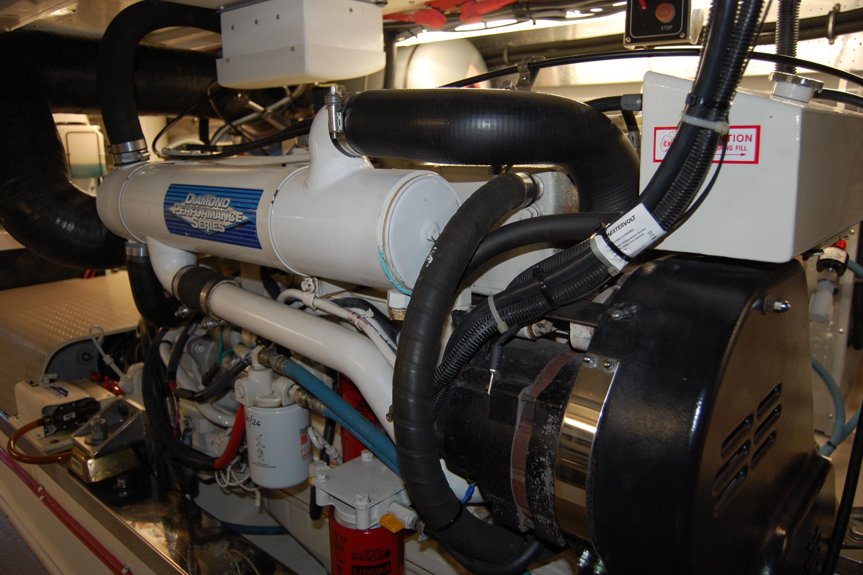 Superior systems and engineering are key elements for Fleming Yachts, whose philosophy has always been to choose only the best equipment available and have it be readily accessible for maintenance. The main engine room access is from two outside hatches just aft of the salon doors. Air intake for the engines is accomplished through openings underneath the cockpit combing boards which then travels through the lazarette and then to the engines thus eliminating salt and sea water interaction with mechanical components. To achieve the extremely low sound and vibration that Flemings are known for, Aquadrive systems transfer the thrust directly to the hull and the engine is isolated by using soft engine mounts. Aft of the engine room, the lazarette houses the water tanks, steering gear, Water maker, storage