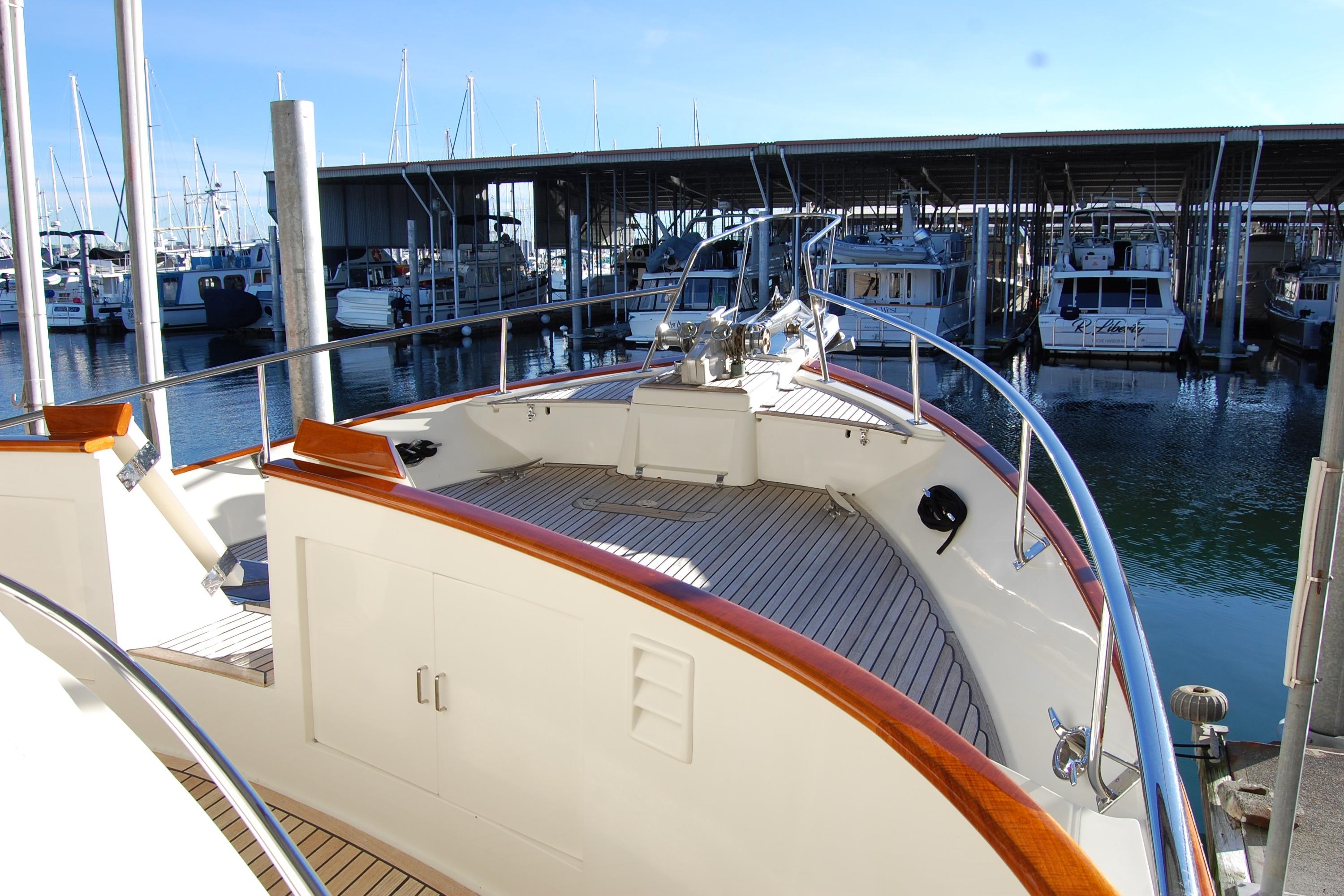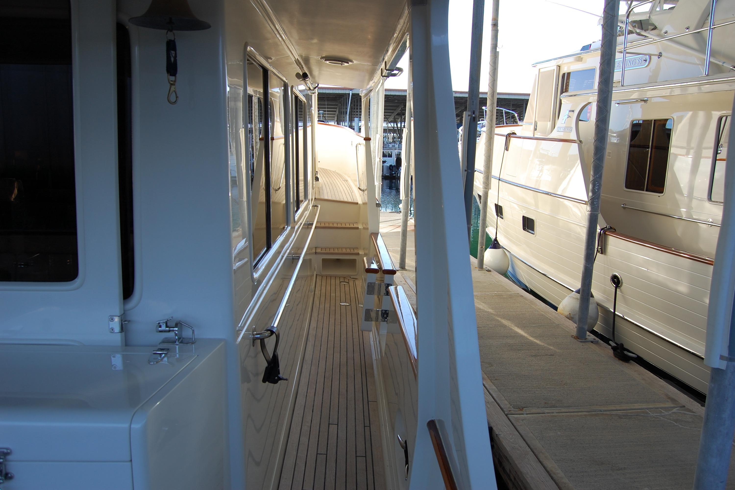 On deck she has walk-around decks in combination with high bulwarks and a Portuguese bridge, which ensures security for both children and pets. The decks themselves are natural teak, while all of the wood caprails, trim, and combing boards are varnished teak. The cockpit features a control station located starboard of the salon doors, while additional storage is to port behind the ladder that leads up to flybridge. On the cockpit deck are four gasketed hatches that provide access to the engine room and spacious lazarette. A large transom door swings in and allows safe access to swim platform.