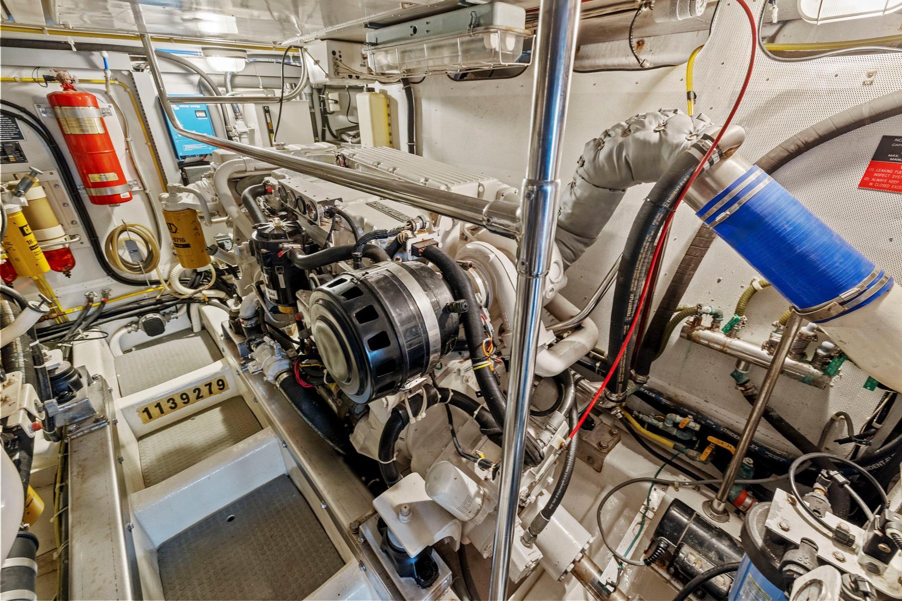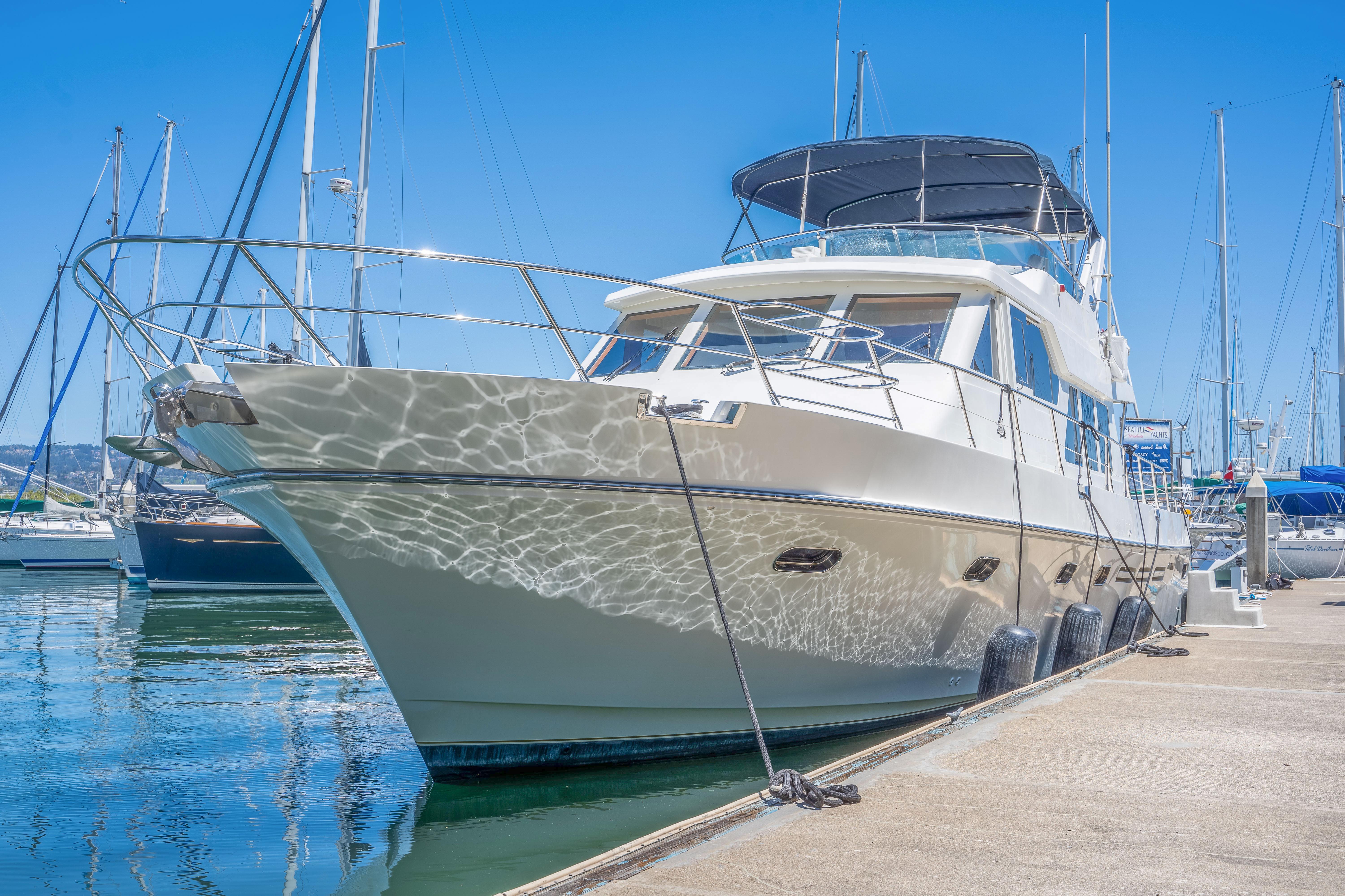 This sturdy well built pilothouse vessel has a well-proven cruising layout and features a beautiful teak interior with a roomy salon and pilothouse area, a great galley with stainless steel appliances and granite countertops. Below decks she features a large mid-ships master stateroom, as well as a forward guest stateroom with centerline queen and a third guest stateroom with twin berths and office space. Command bridge is accessible from the pilothouse or cockpit and the full walk around decks are easily accessed from the cockpit or pilothouse. She has bow thruster and three stations with electronic engine controls, and has reliable Caterpillar 3196 660HP mains, an ONAN 17KW genset, 4000 watt Inverter with large battery bank, reverse cycle heat and air conditioning, HRO watermaker, full Garmin electronics package, Wesmar hydraulic stabilizers and a center console dinghy with outboard motor.