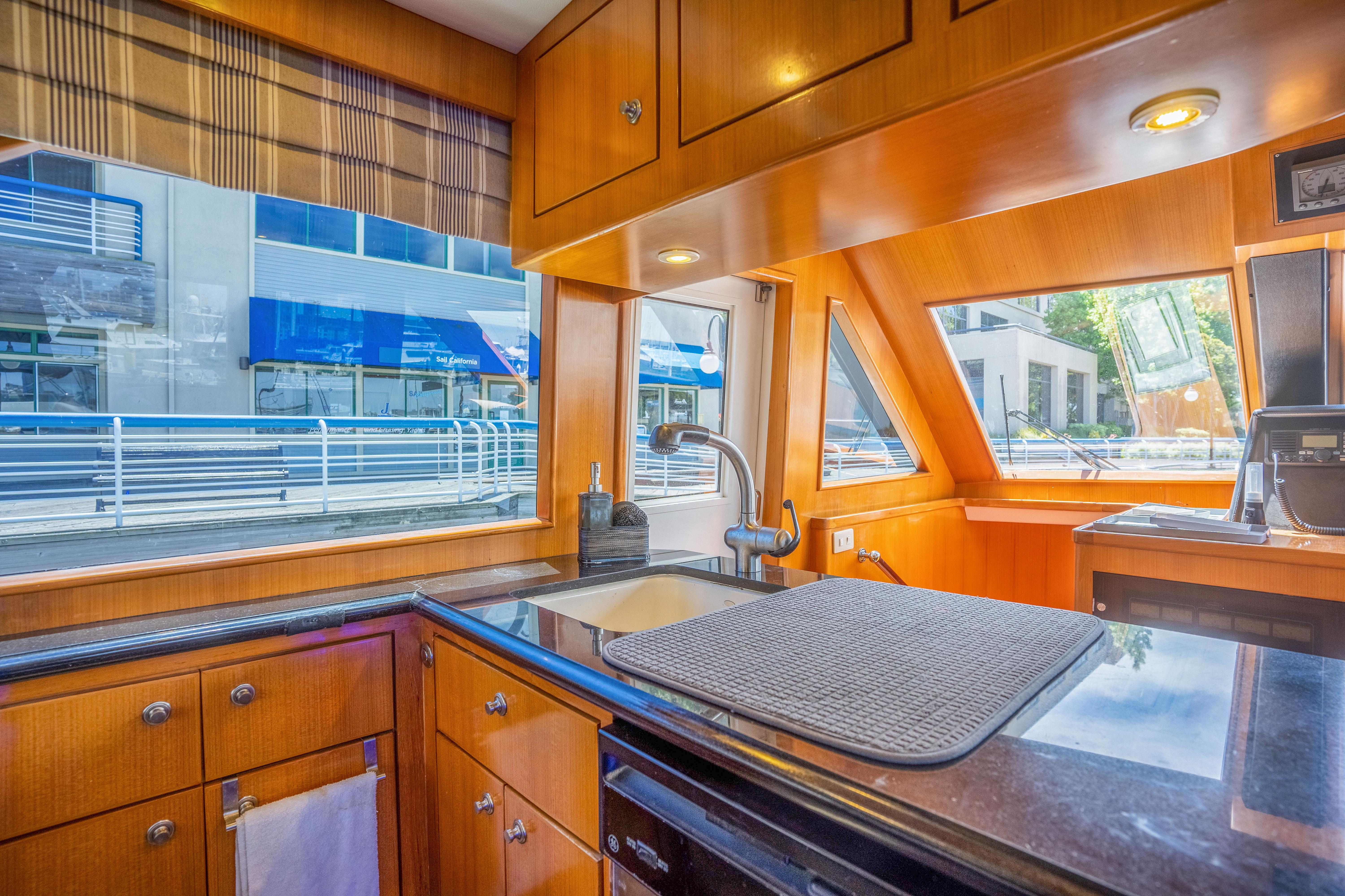 The U-shape galley opens to the pilothouse area and features stainless steel appliances, granite countertops