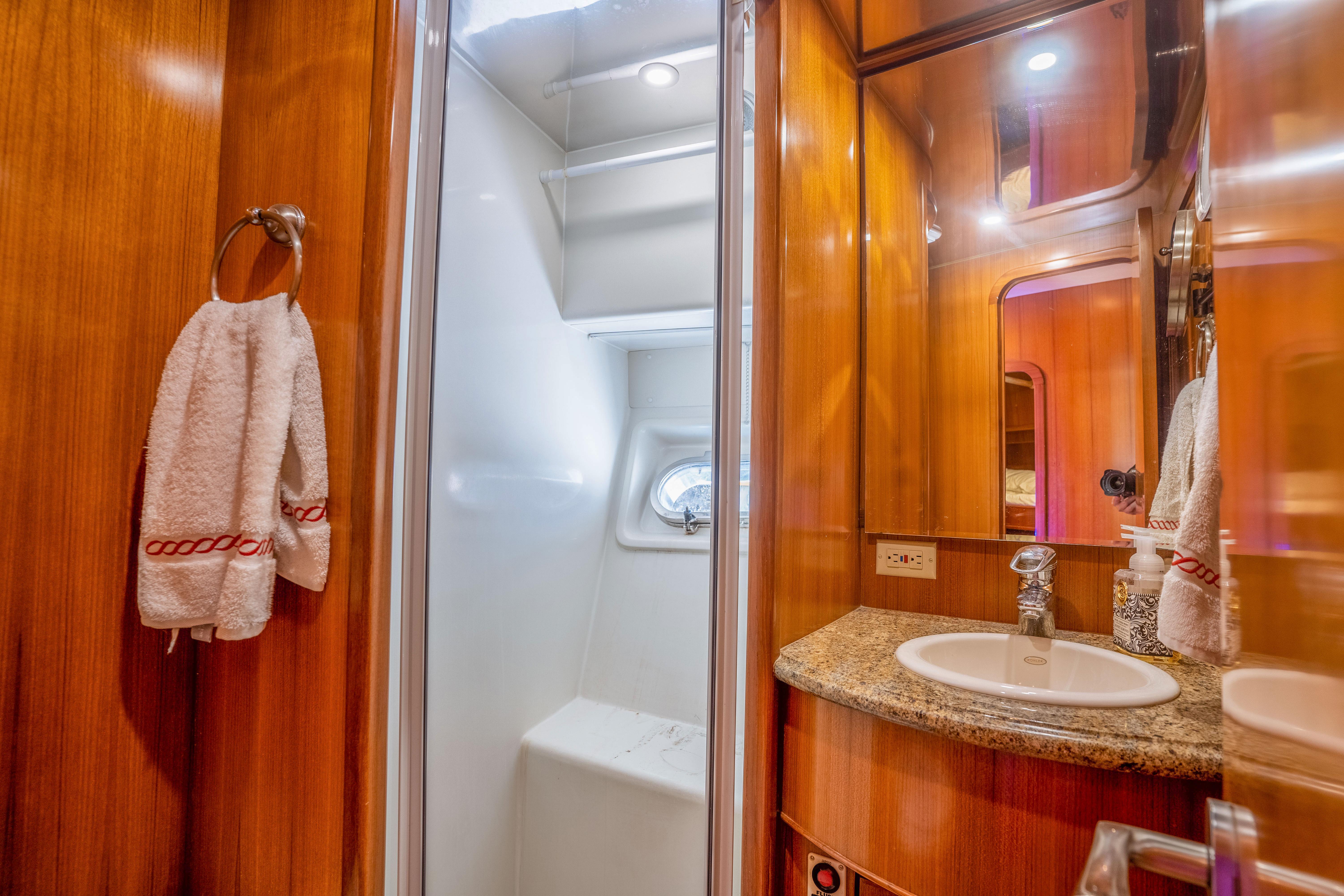 Moving forward through a hallway/landing you'll find a washer/dryer and two more staterooms. The guest stateroom to starboard features twin berths with office space and the forward stateroom has a centerline queen. These two staterooms share a generous head with two access doors and a separate stall shower.