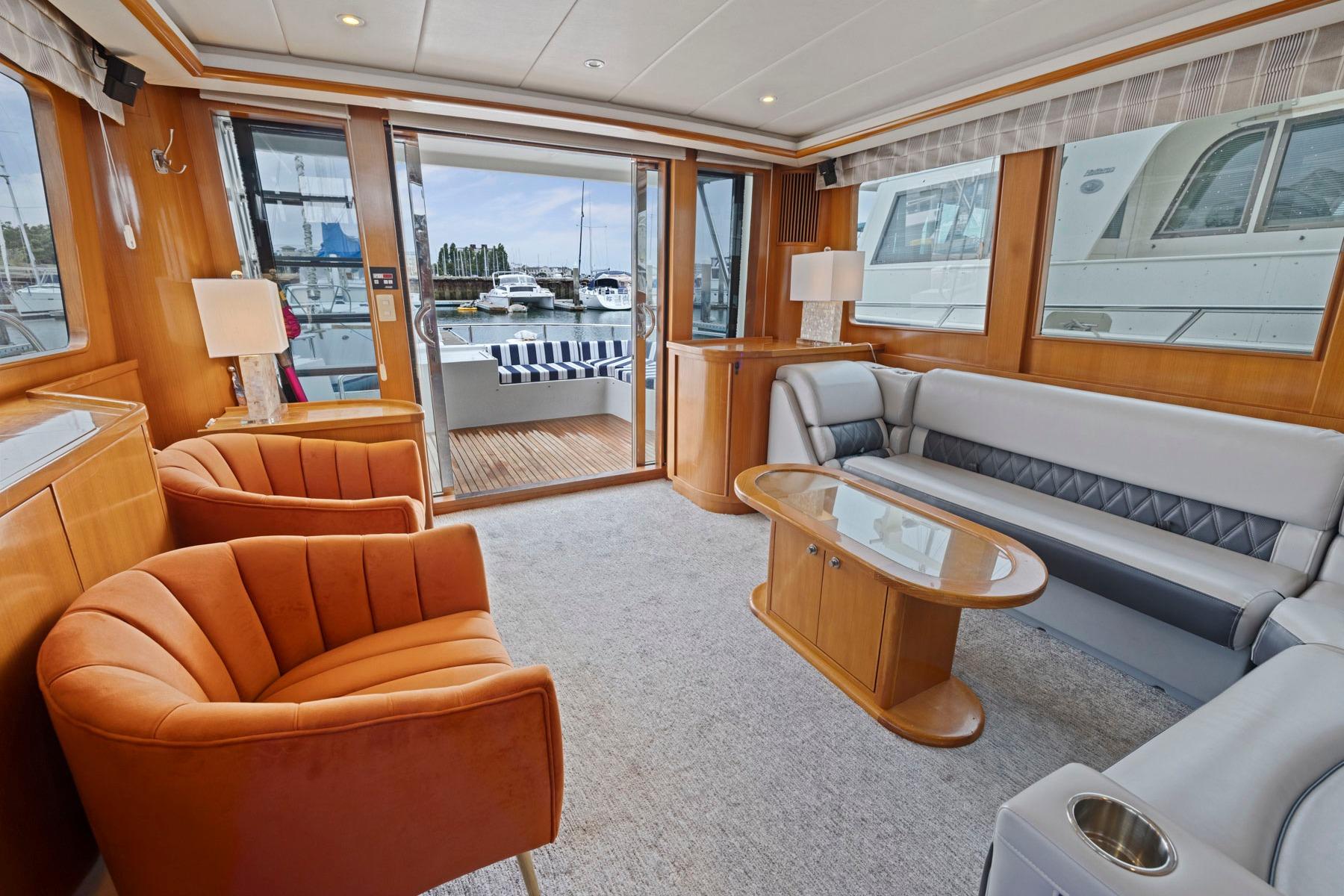 This vessel features beautiful satin finished teakwood interior with burled accents throughout. The finely crafted cabinetry, window trim and curved doors is truly amazing. The spacious salon with teak & holly sole features a comfortable couch, casual chair, coffee table and a pop up TV with surround sound.