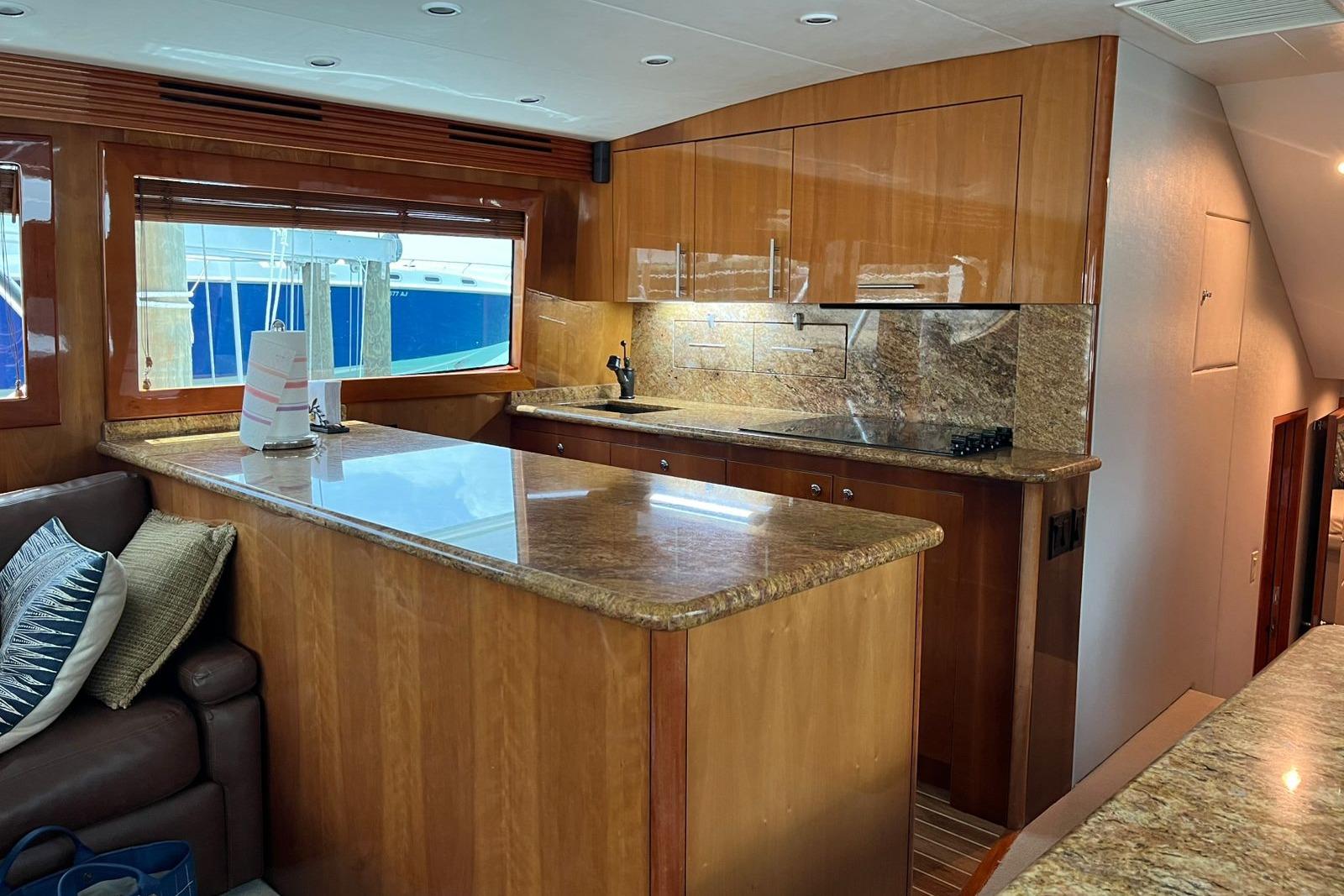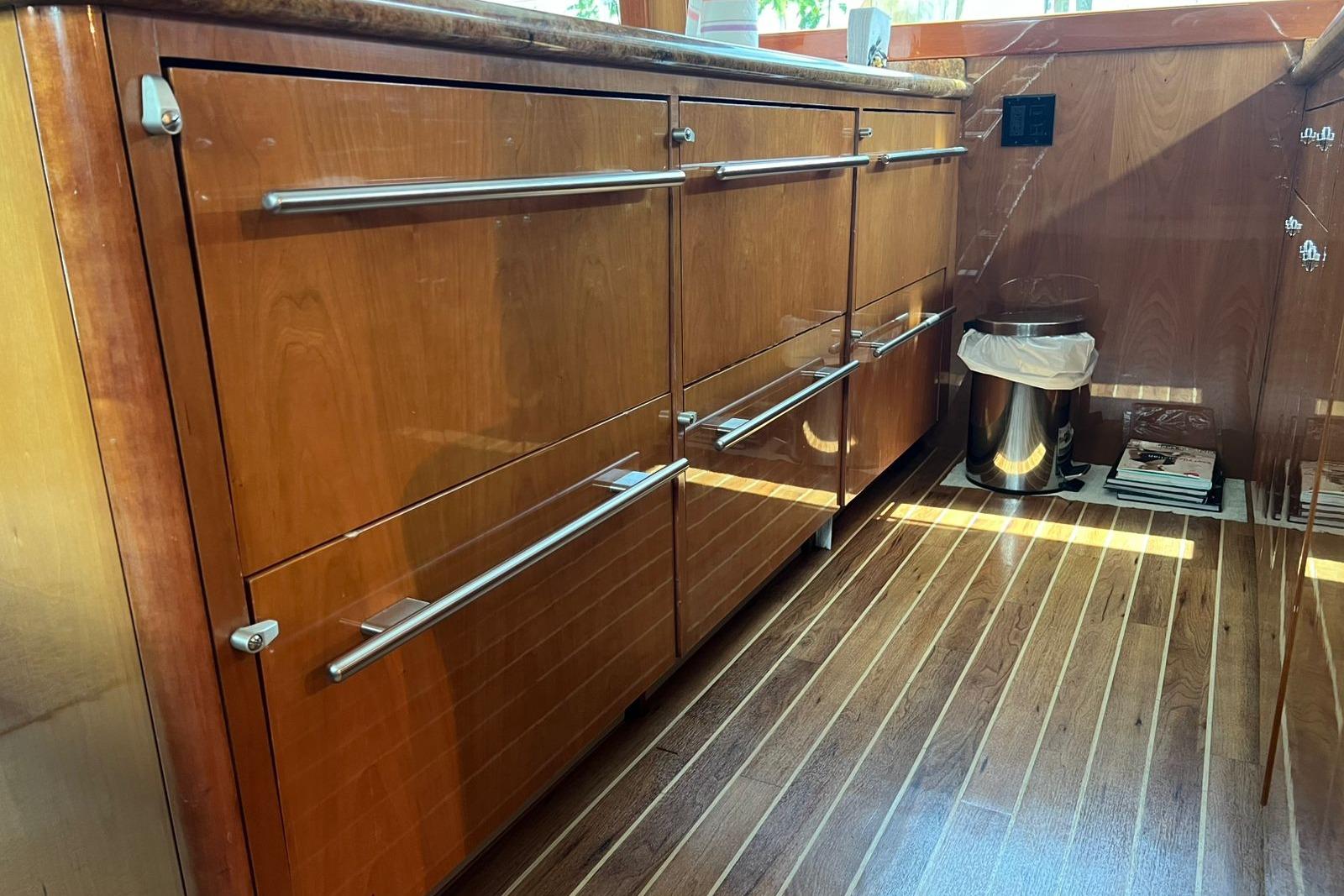 This cockpit also features awesome storage. Note the cleverly designed chill box under the steps and the insulated storage bin below the flybridge ladder. In addition, storage lockers with hinged doors are located below the port and starboard cockpit coamings. Other standard features include full-length toe kicks with foot pedal access to the cabinets and seawater and freshwater washdowns.