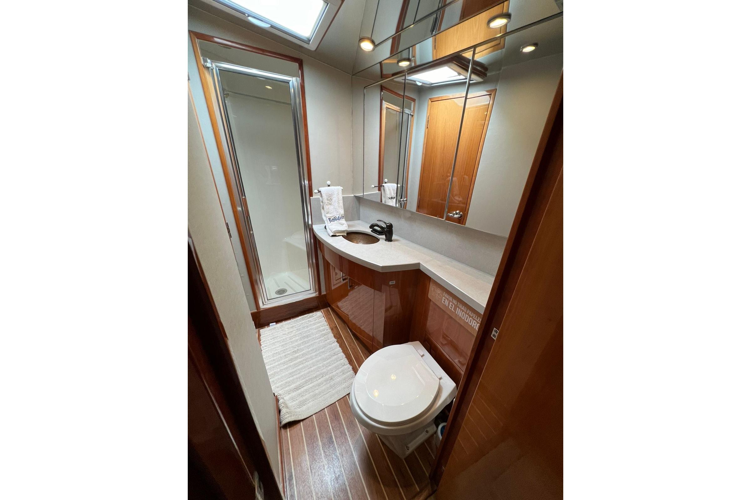 The 54 is designed for serious sportfishing. The cockpit boasts 149 square feet of open space where every element and dimension has a purpose. Fishing amenities include a bait and tackle center with sink, cutting board and tackle drawers; a bait freezer; storage console with drawers, four rod holders; a removable, full sized (80-inch) in-deck fish box with macerator and an amply proportioned transom door.