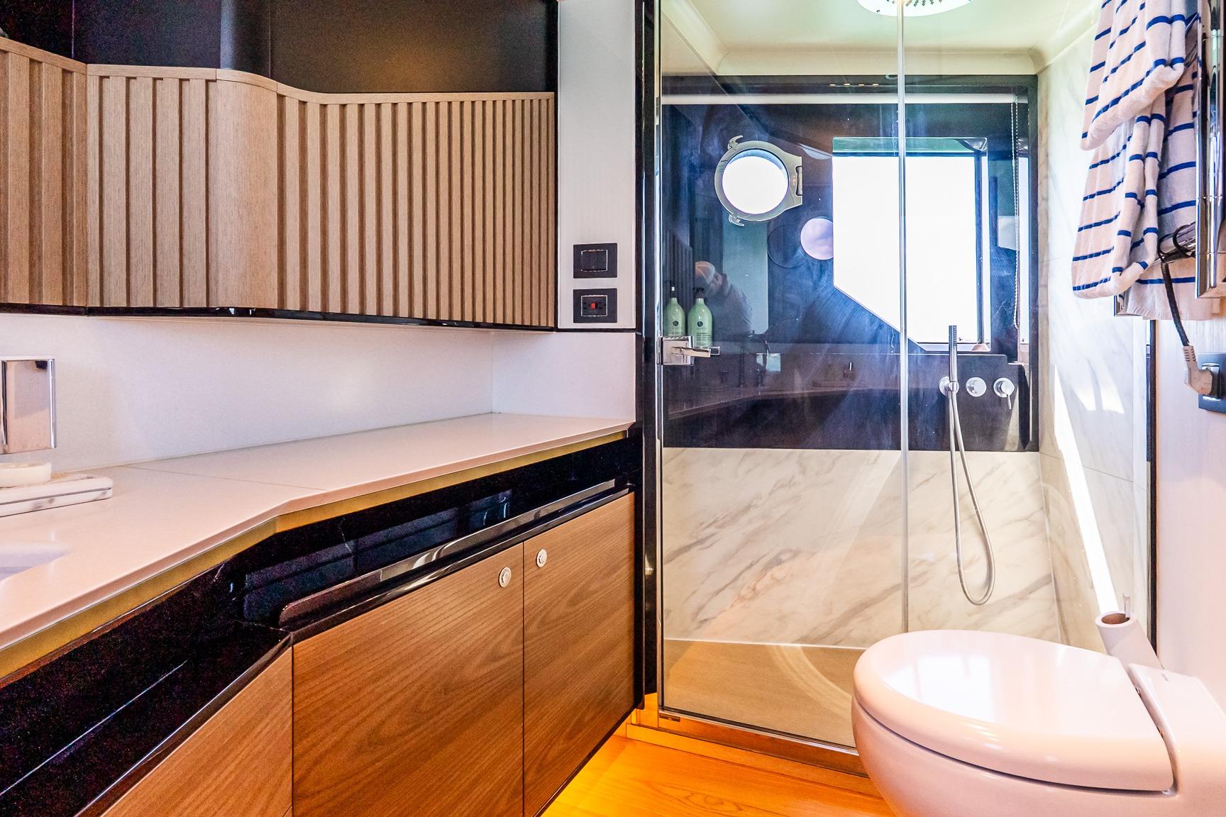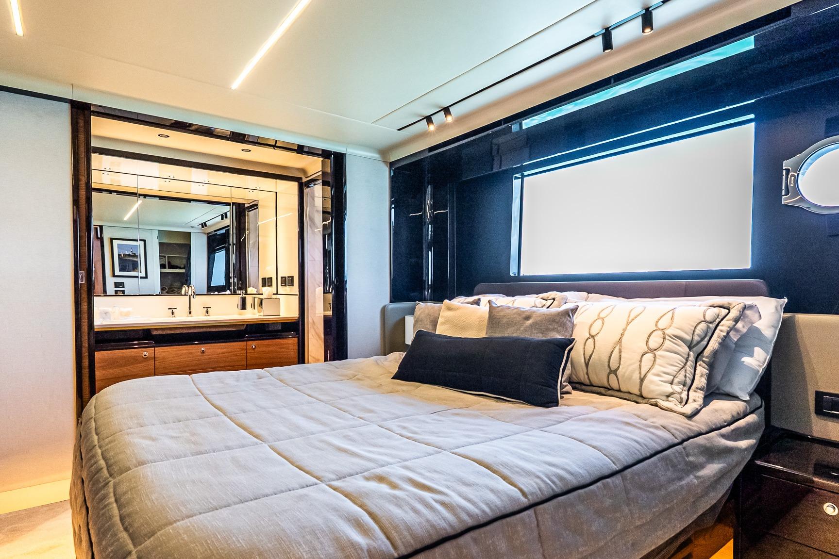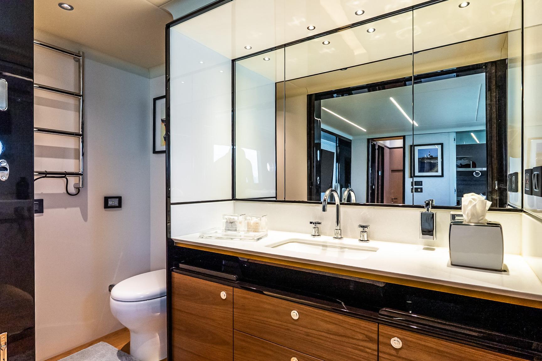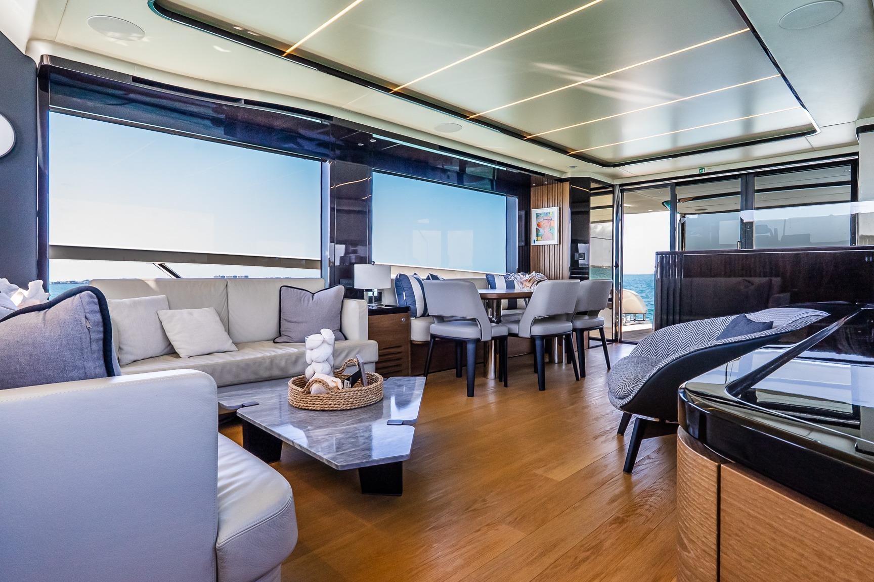Inside, the atmosphere reflects understated luxury. Minotti leather salon sofas, dining chairs, and armchair pair with a marble salon table for a sophisticated entertaining space. Electric and roller blinds, heated towel racks, washer and dryer units, premium audio packages, KVH TV7 satellite television with multiple receivers, and WiFi 4G connectivity ensure modern convenience throughout. Tropical air conditioning rated at 110,000 BTU maintains comfort in warm climates, supporting extended cruising in total ease.