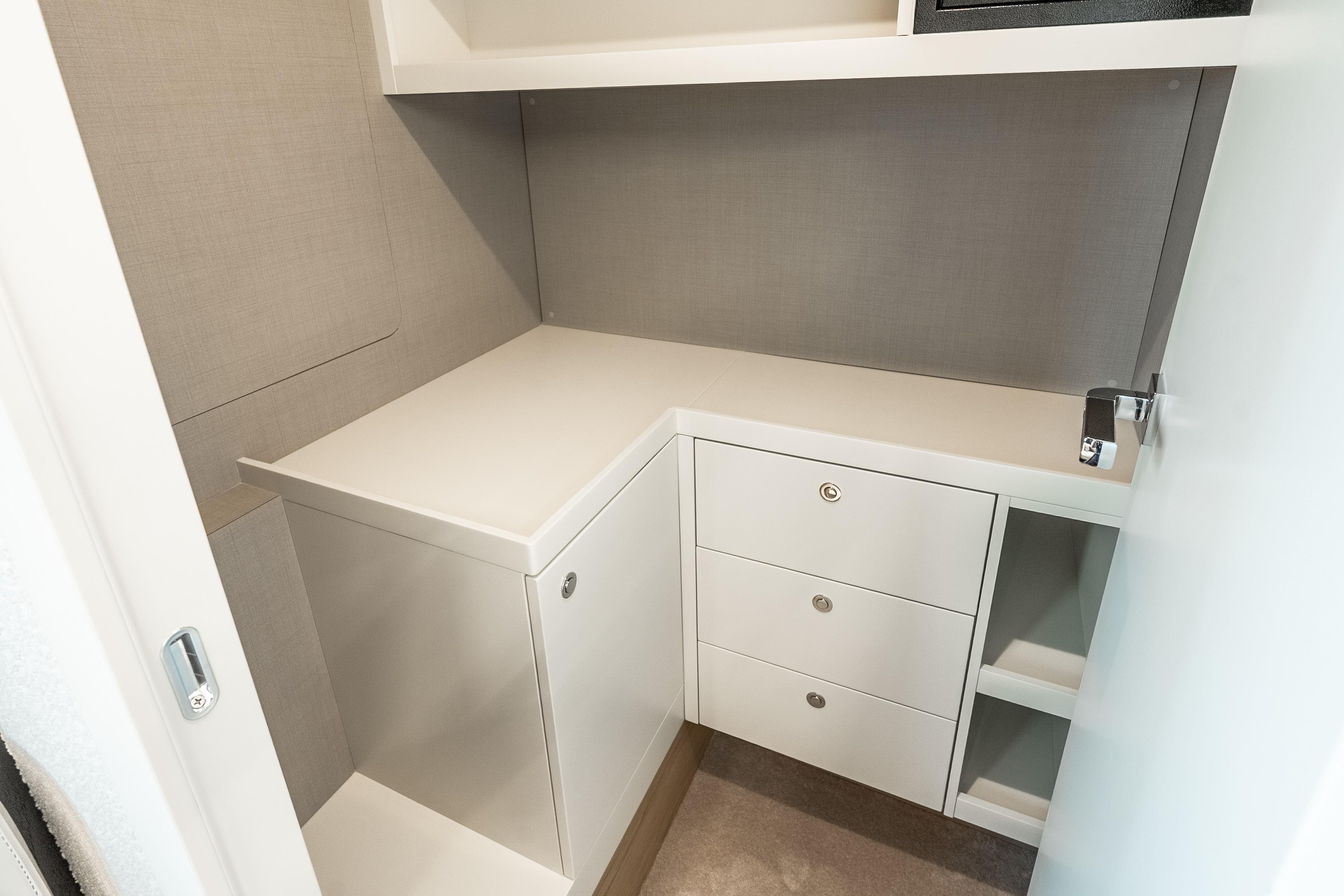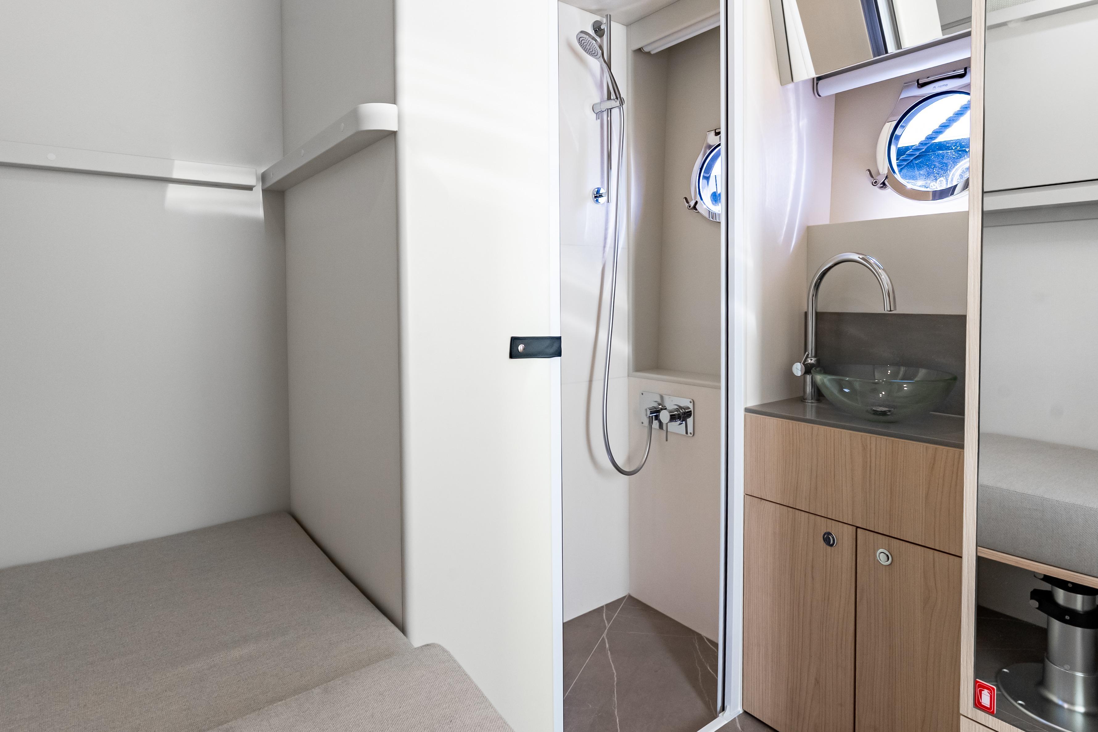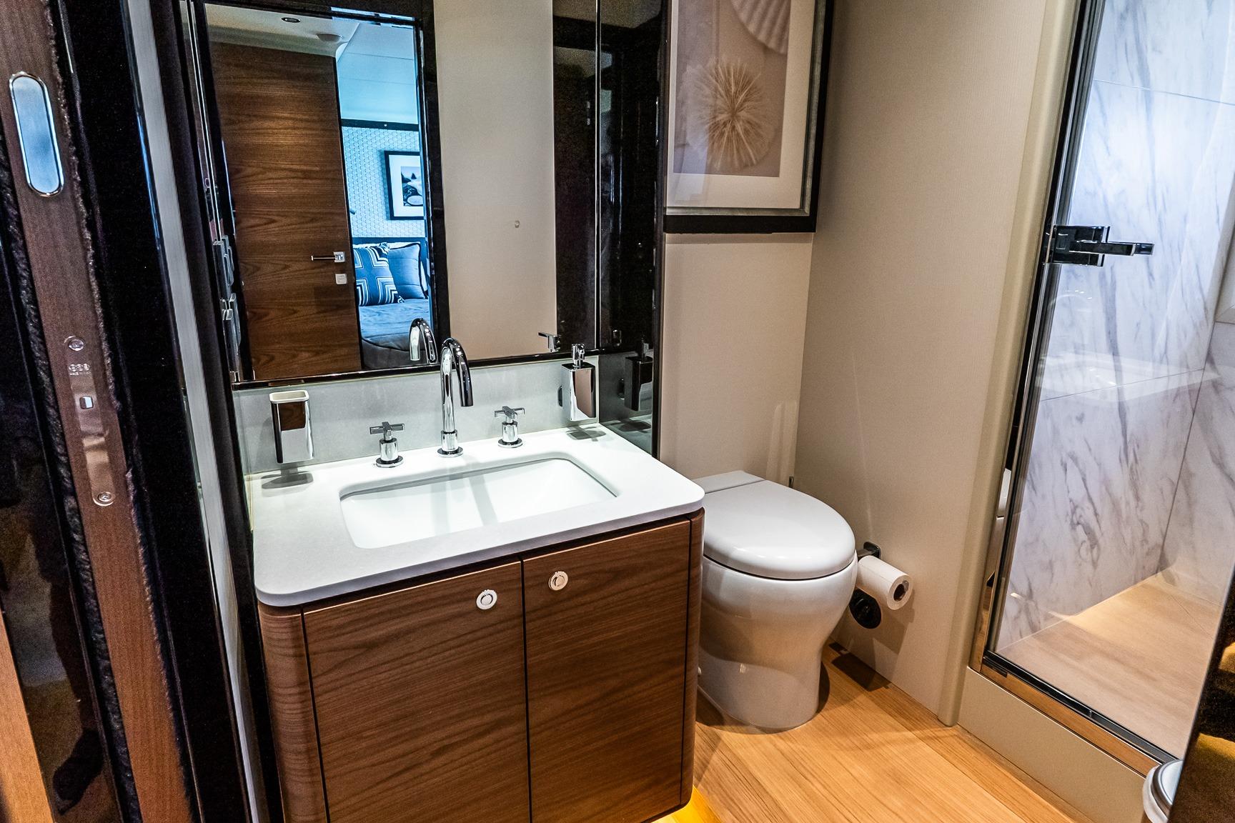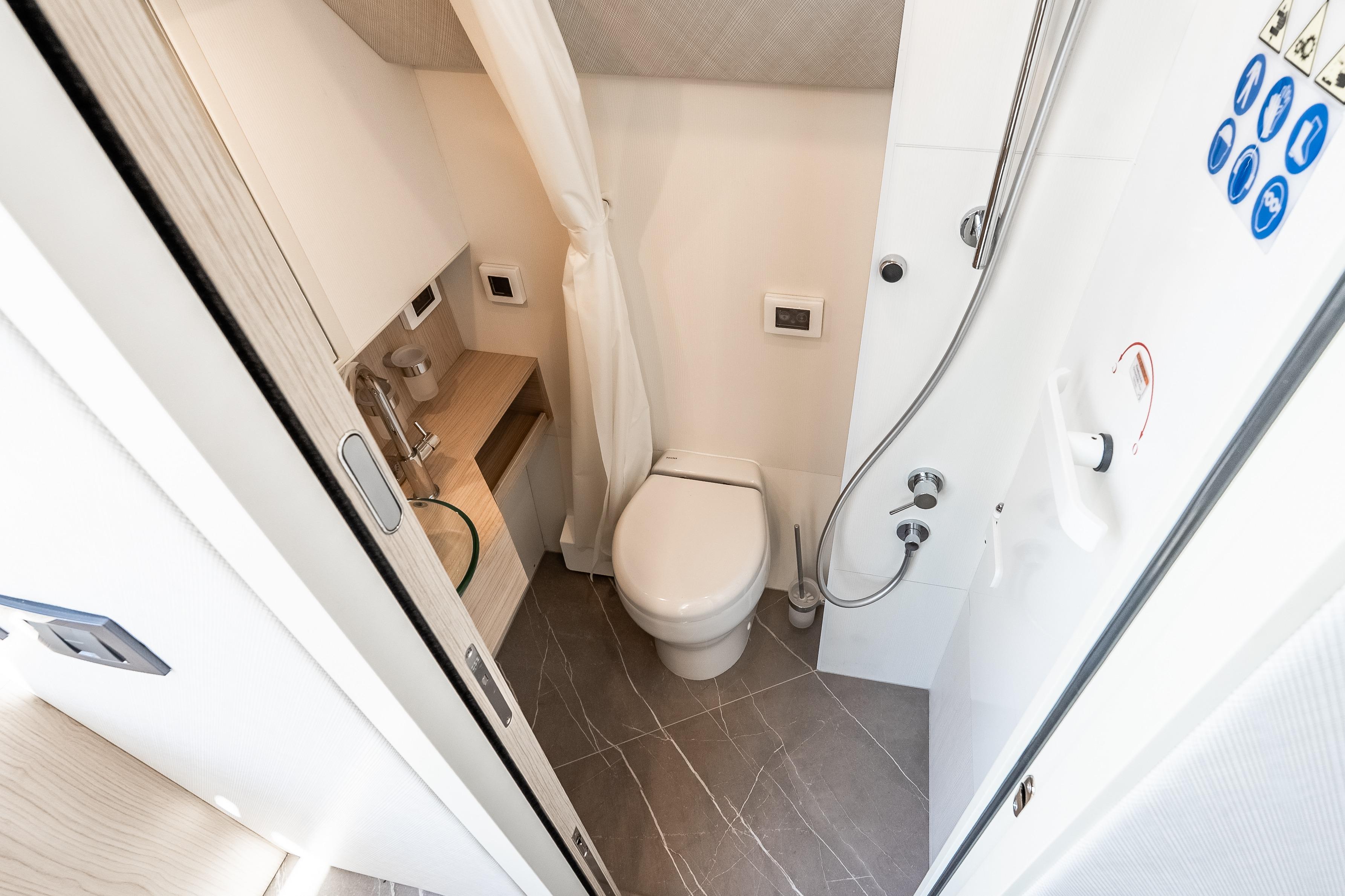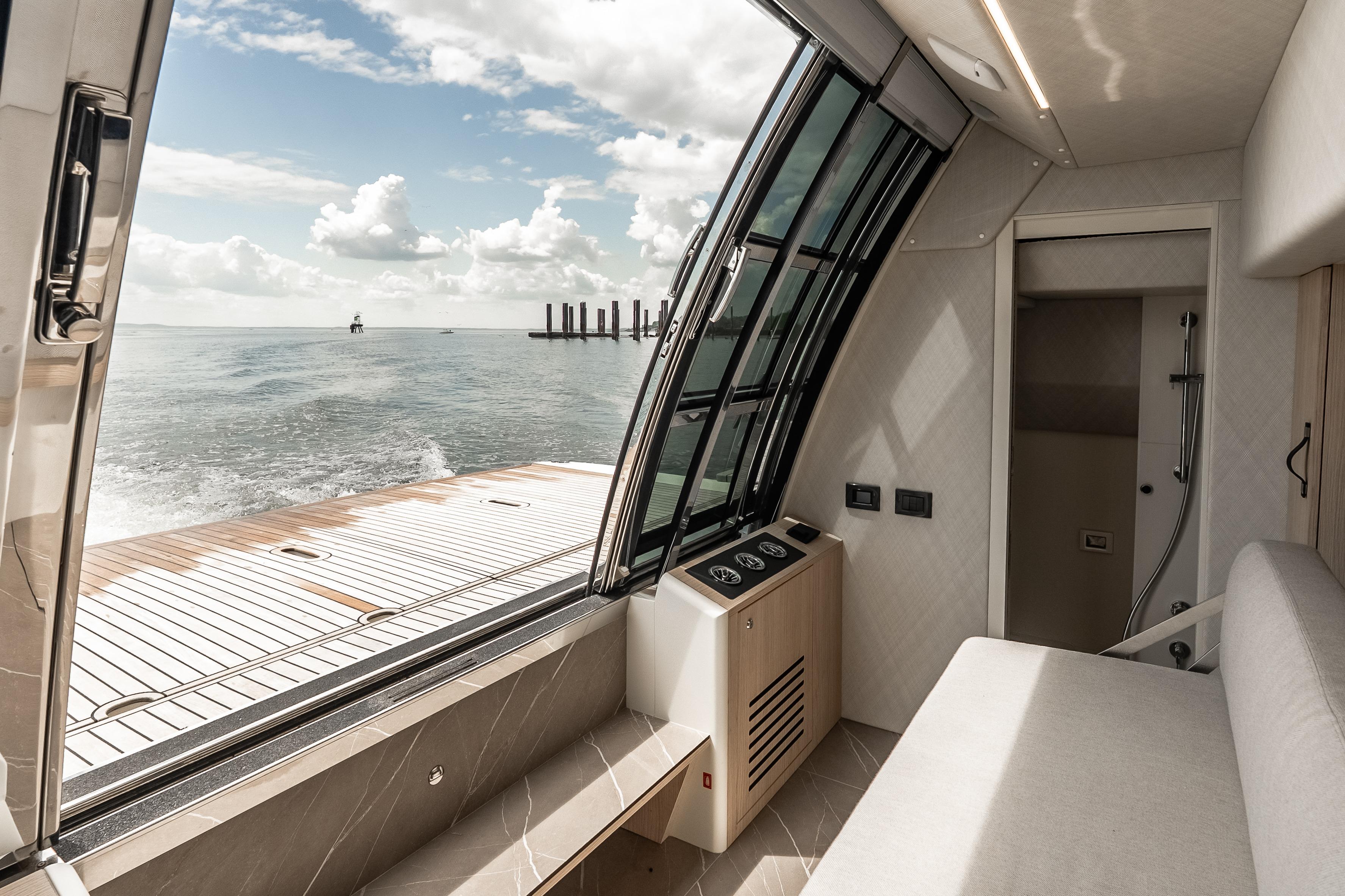 Inside, the atmosphere reflects understated luxury. Minotti leather salon sofas, dining chairs, and armchair pair with a marble salon table for a sophisticated entertaining space. Electric and roller blinds, heated towel racks, washer and dryer units, premium audio packages, KVH TV7 satellite television with multiple receivers, and WiFi 4G connectivity ensure modern convenience throughout. Tropical air conditioning rated at 110,000 BTU maintains comfort in warm climates, supporting extended cruising in total ease.