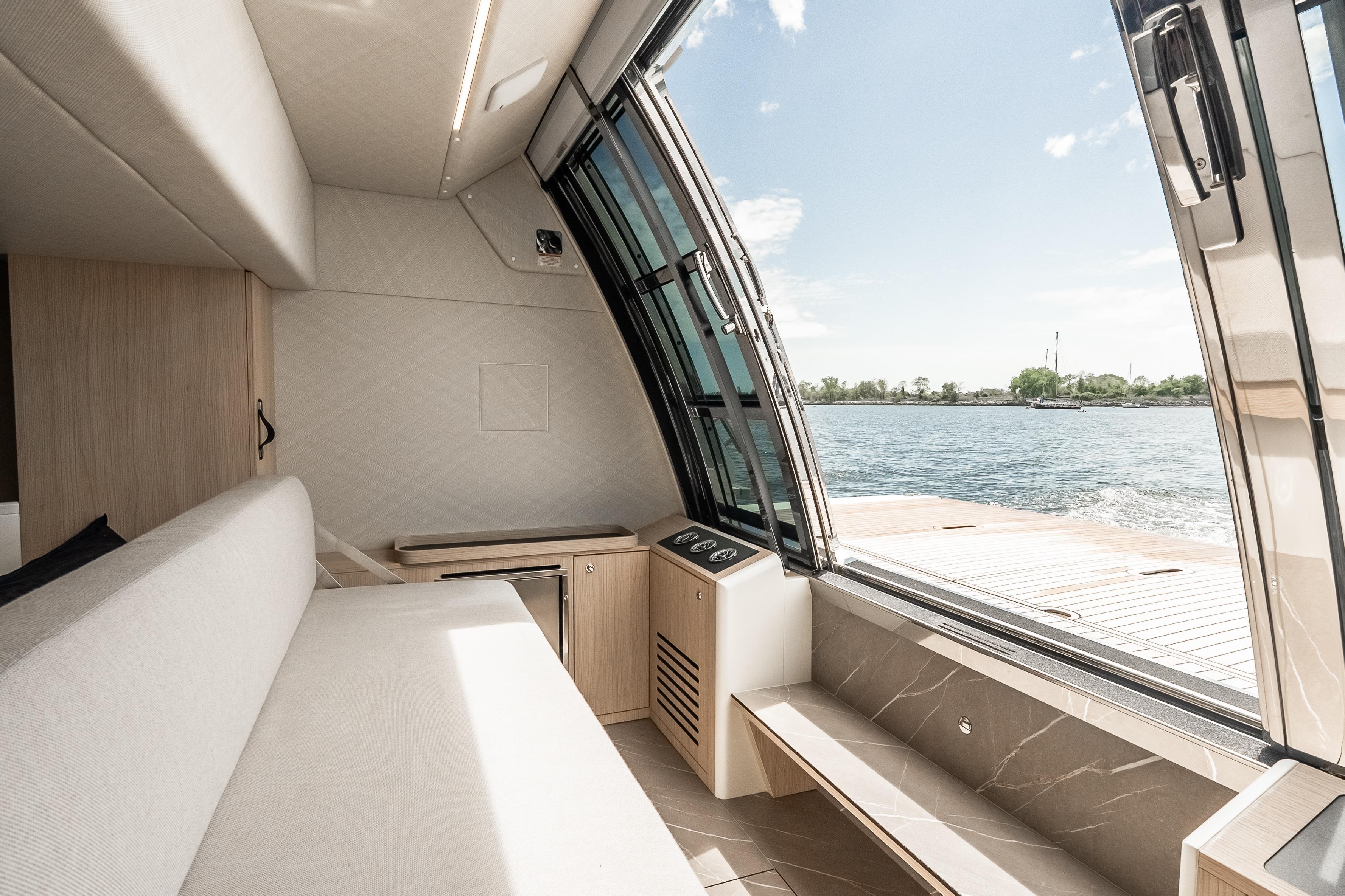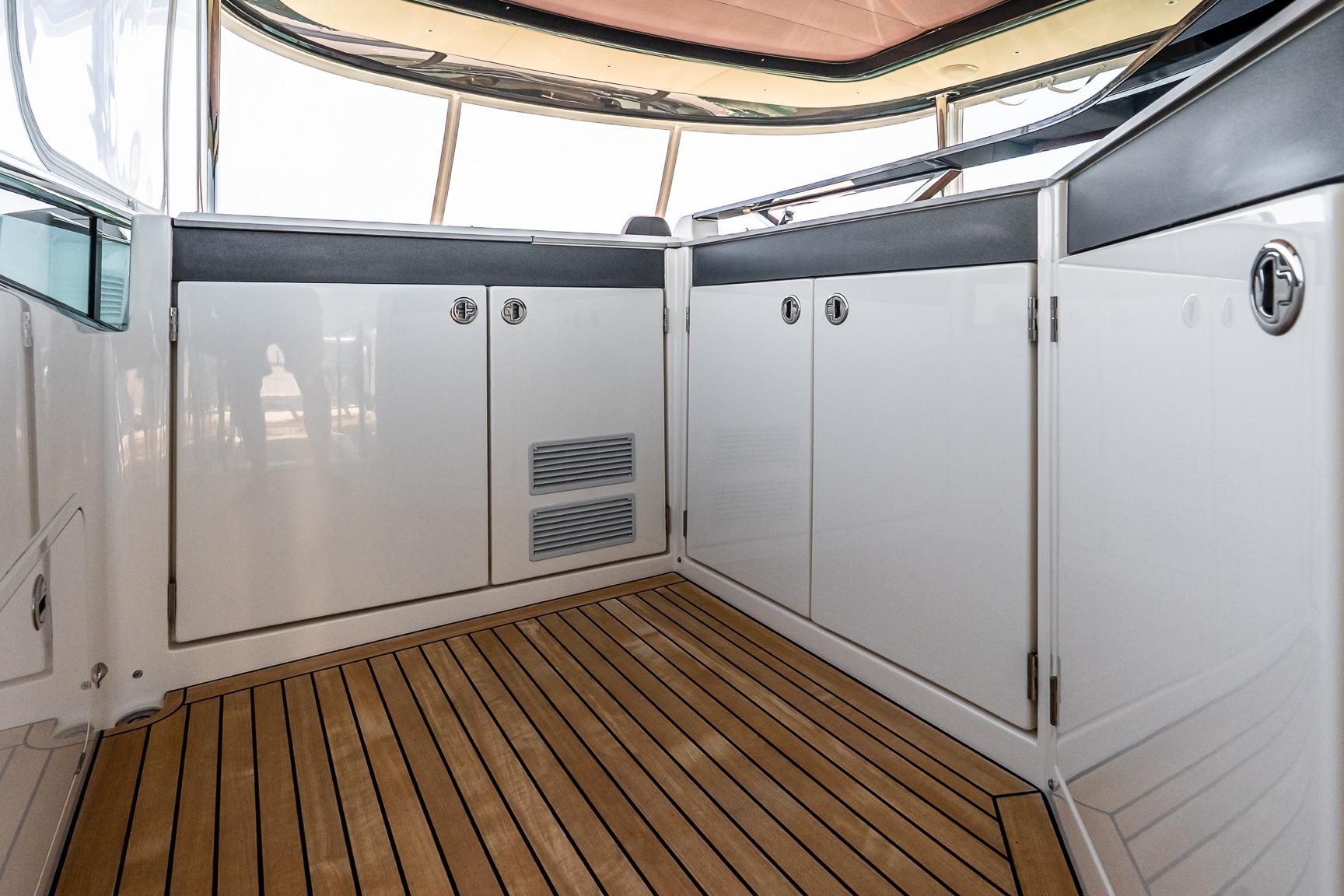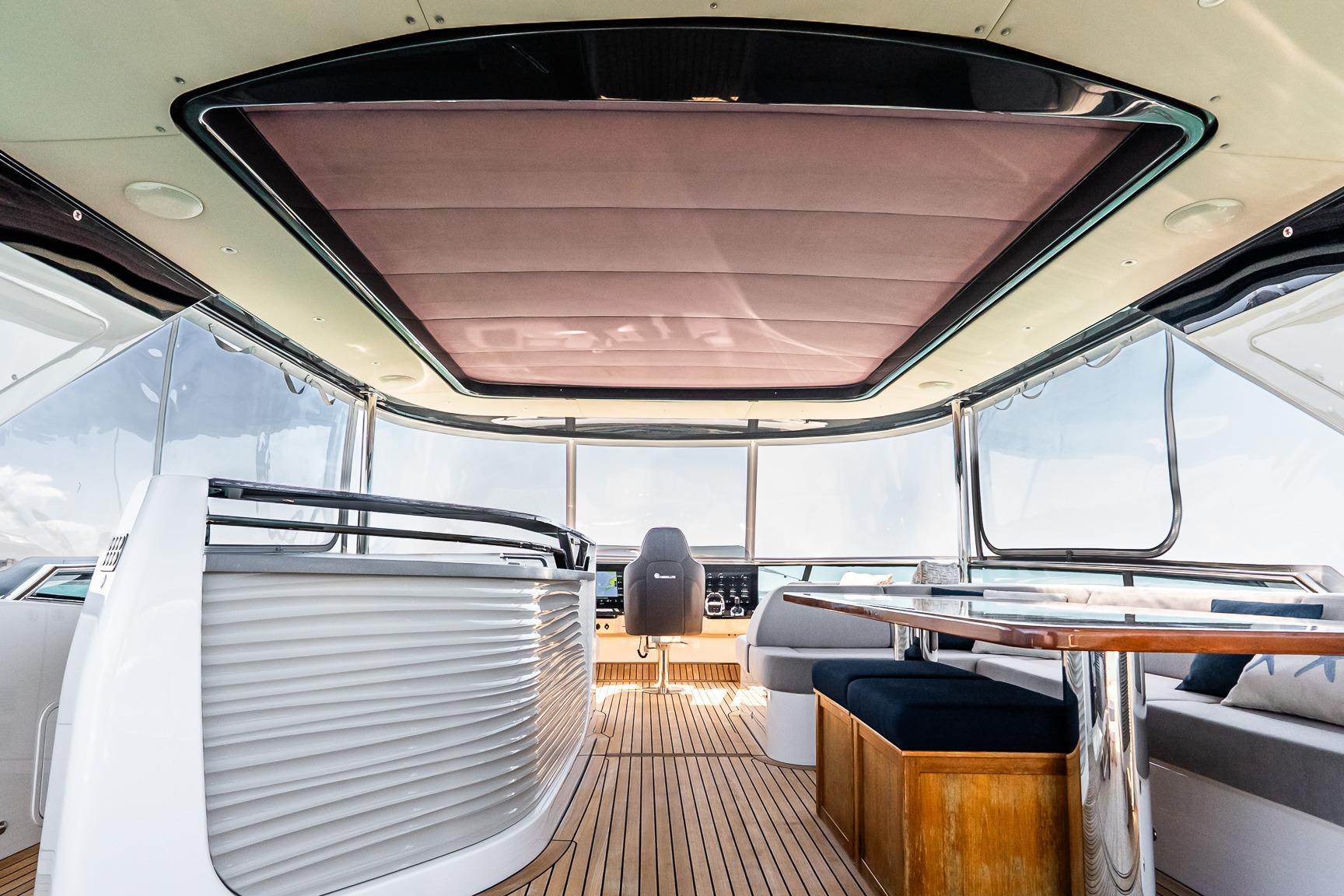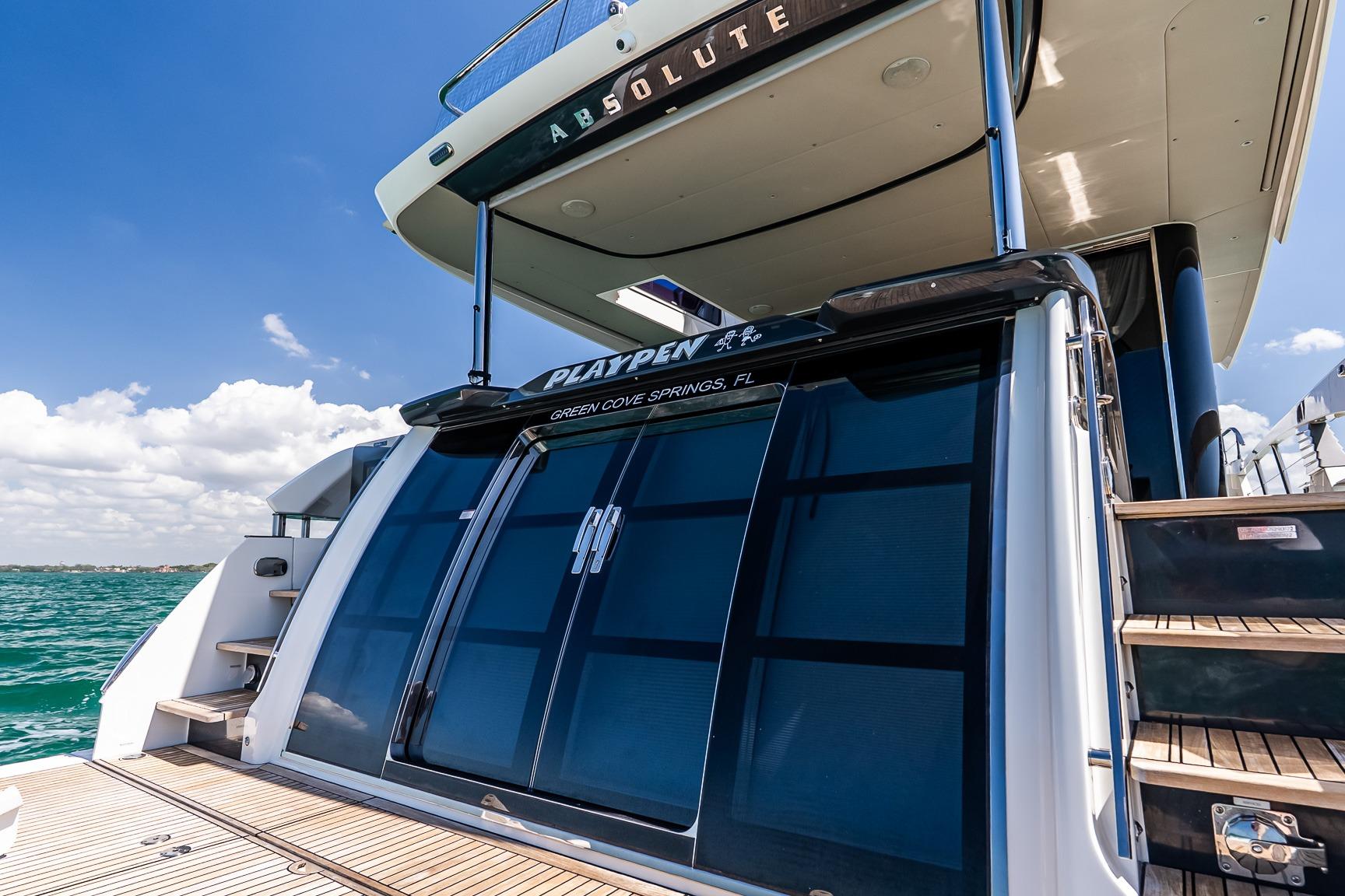 - Three-sided enclosure on flybridge. The front is hard, flip-up glass and the two sides are soft, roll-up.