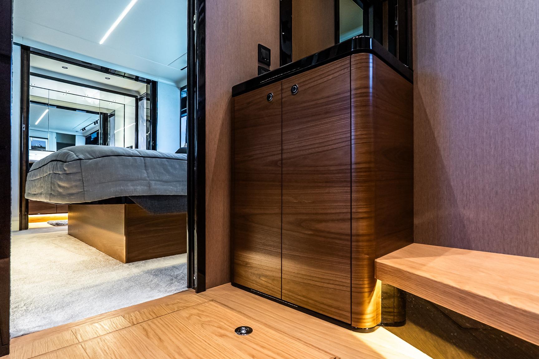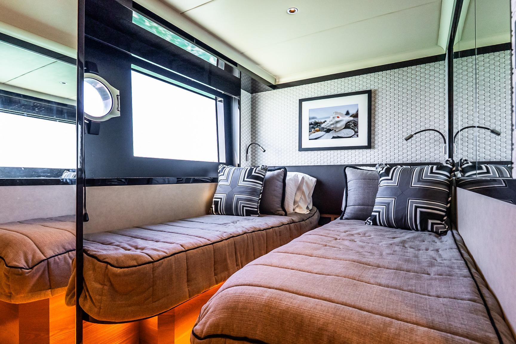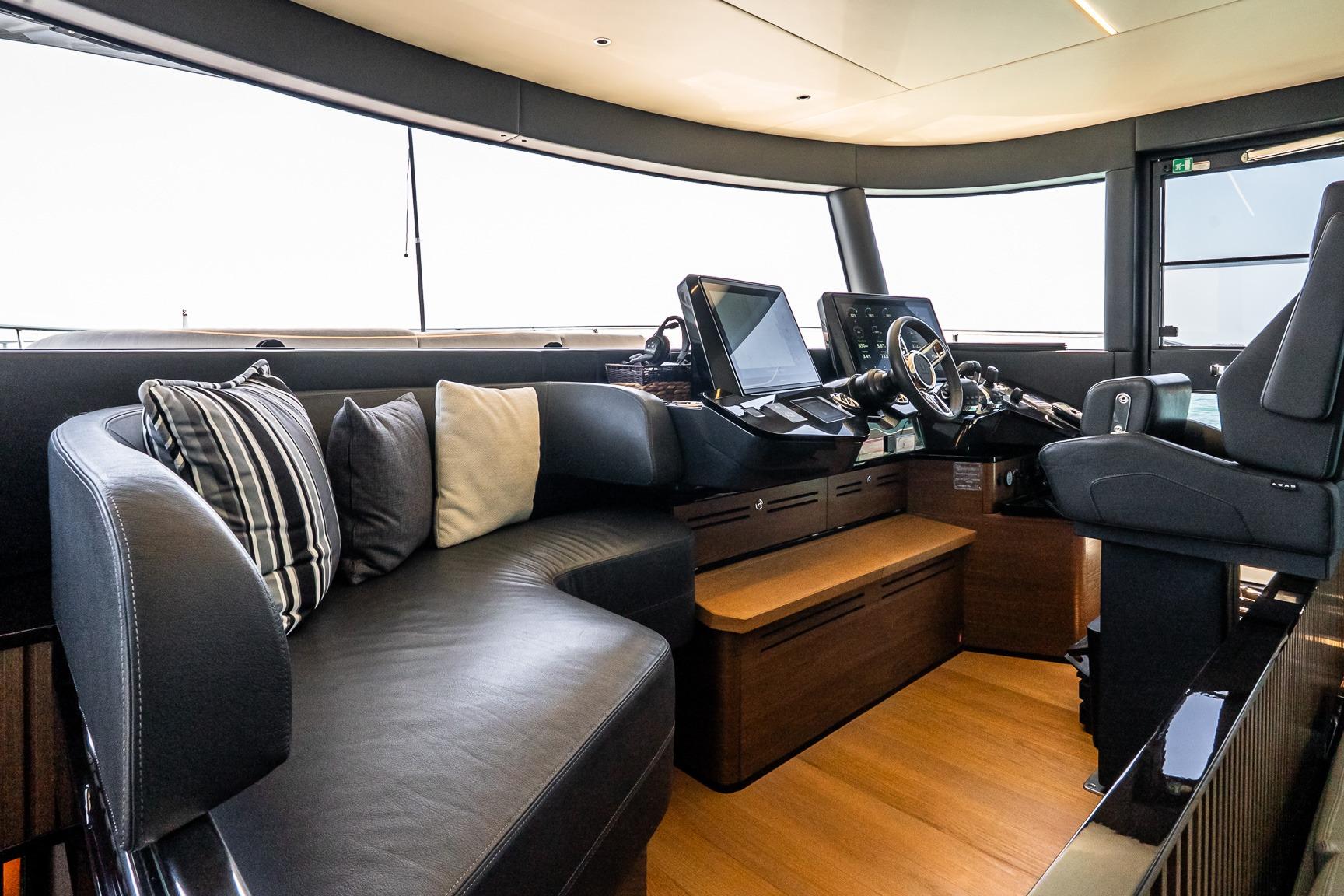 At the helm, four Garmin 22” displays, solid-state radar, AIS weather and identification system, monitoring system, and integrated cockpit and engine room cameras provide advanced navigation and full vessel awareness. Dual 21.5kW generators, a 3000W inverter, bow thruster, and double Racor fuel filtration system support confident cruising and onboard reliability.