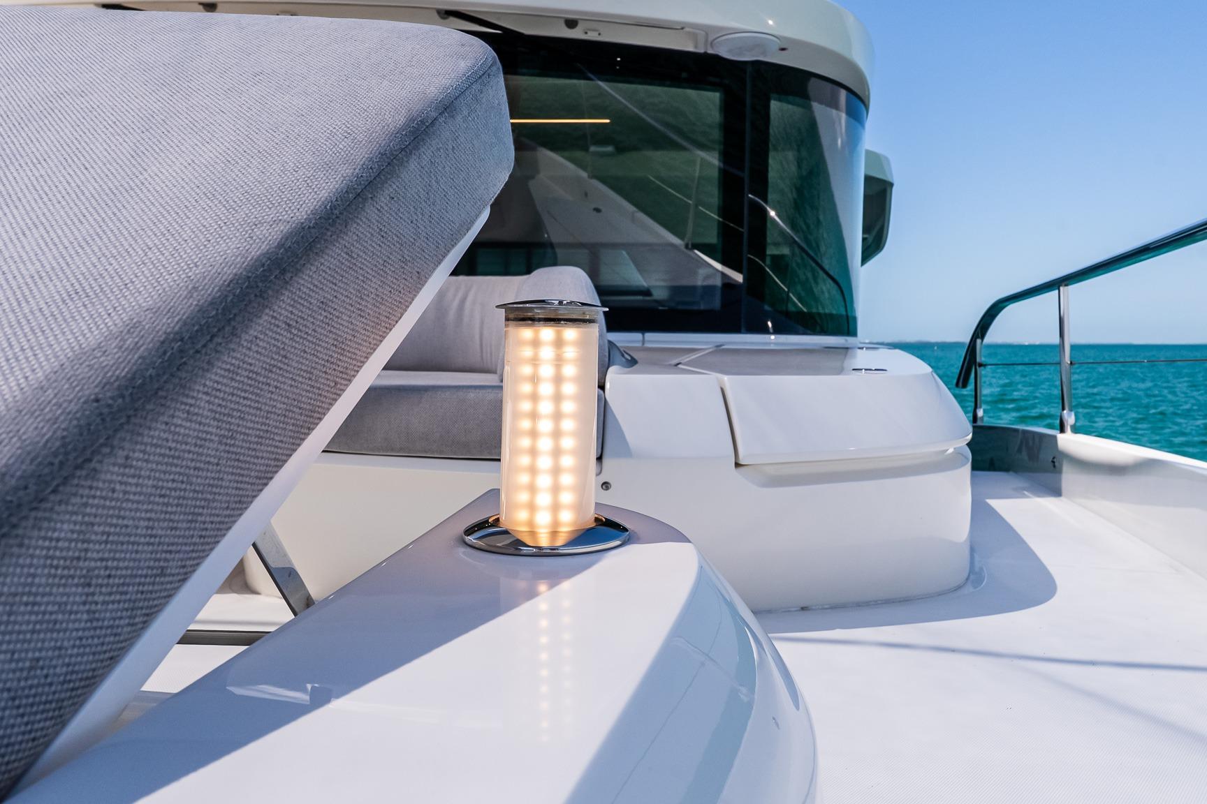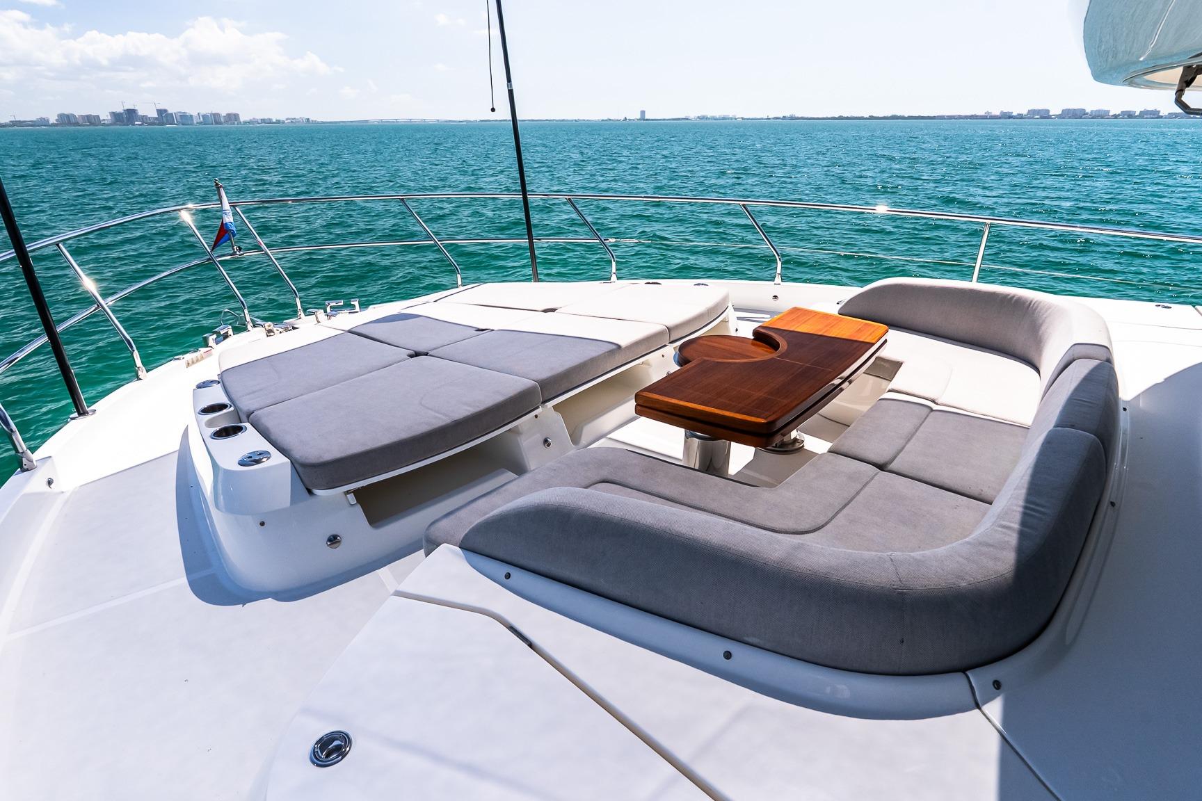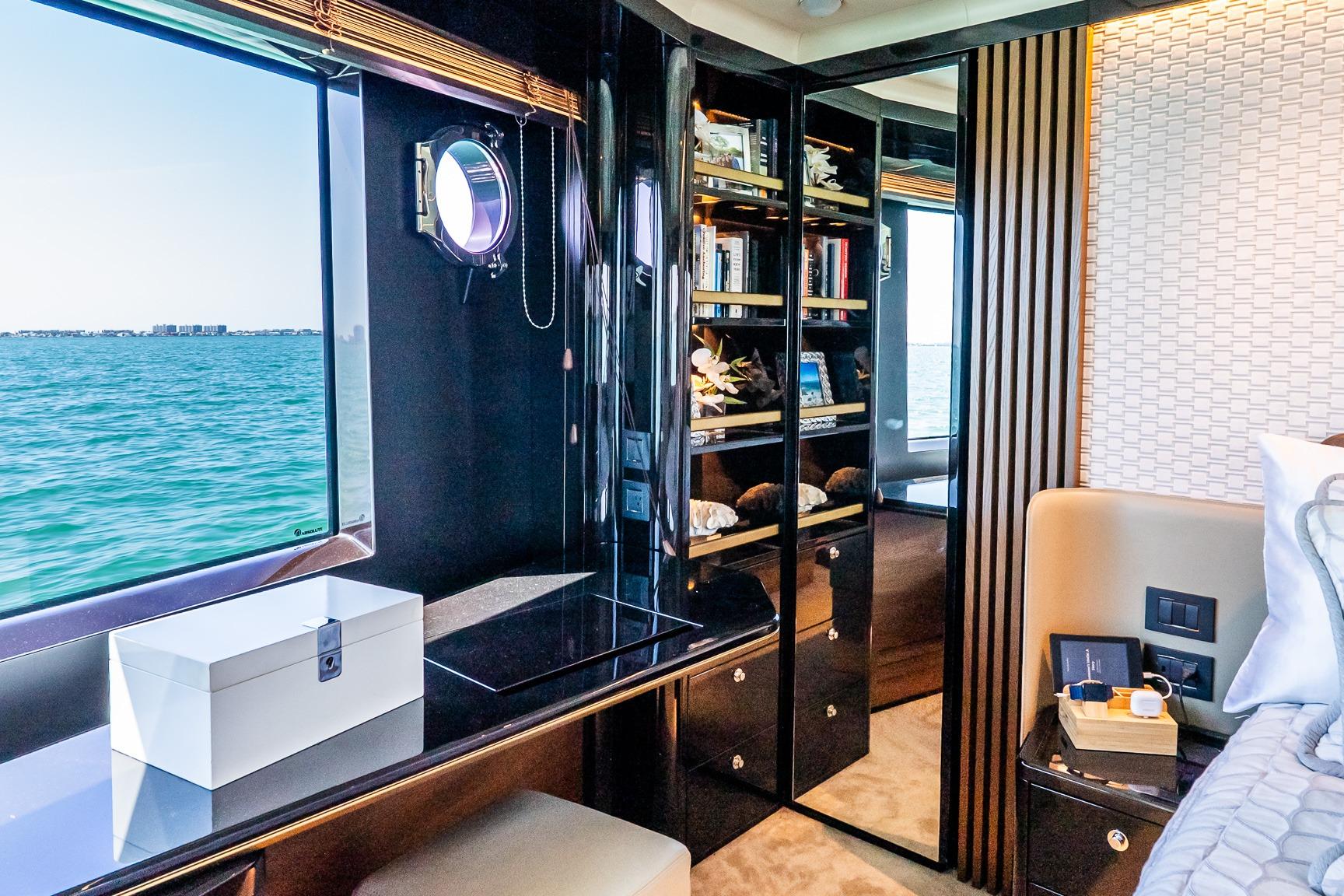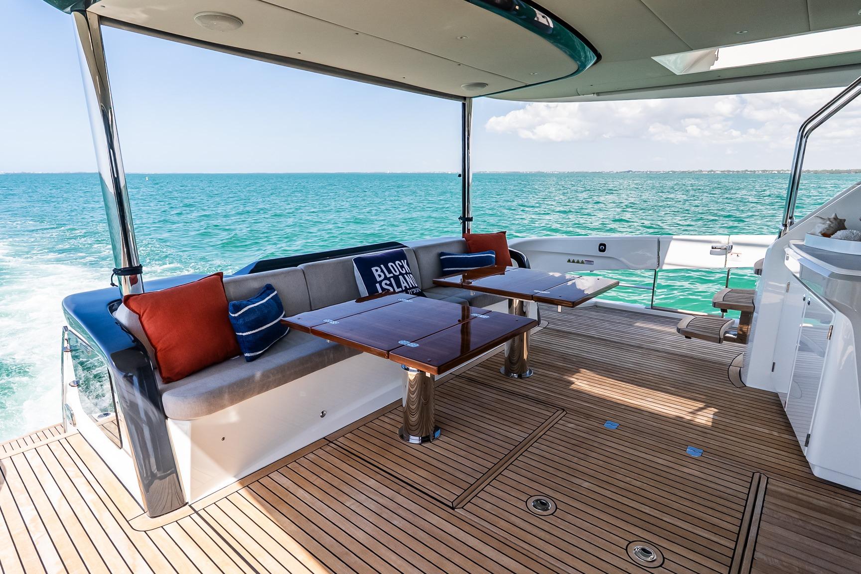 Outdoor spaces are thoughtfully designed for gathering and relaxation. The hydraulic swim platform creates seamless access to the water, while the fully air-conditioned beach club—with shower, convertible double bed, refrigeration, and dedicated stereo—offers a private retreat just steps from the sea. Teak bridge flooring and dual electric teak cockpit tables with folding wings enhance alfresco dining, complemented by multiple entertaining areas including wet bars with sink, stainless refrigerator, BBQ, Corian countertops, wine cooler, and ice maker. Electric privacy sunshades, underwater lights, stainless steel anchor and railings, and integrated hardtop lighting further elevate the experience.
