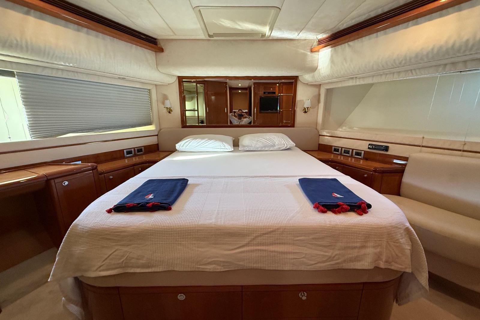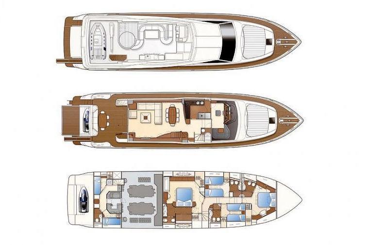 The Ferretti 830 is the first yacht within the Ferretti range featuring the open-view window in the master bedroom to ensure a unique view of the sea that can be enjoyed from both the bed facing the window and the bathroom with double access. The slender lines of the flying bridge are due to the roll bars? unusual position towards bow. This offers a precious, functional advantage by creating a shaded area on the sofa in the hottest hours. The interiors show an immediate Ferretti style thanks to the cherry gloss furniture and the highly accurate finishing. The Ferretti 830 offers also two guests cabin and a large Vip cabin with a double bed, all of them furnished with private bathroom. The huge saloon is equipped with all home comforts and hosts a plasma screen TV. Eight persons could comfortably have dinner in absolute comfort. With the 830 the sea really becomes a pleasure without limits.