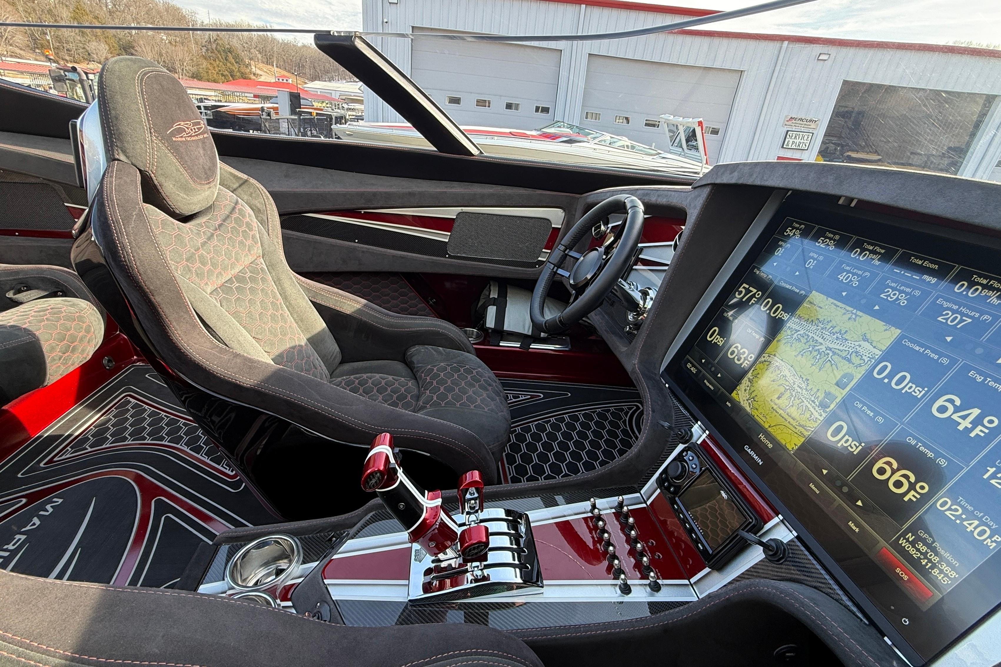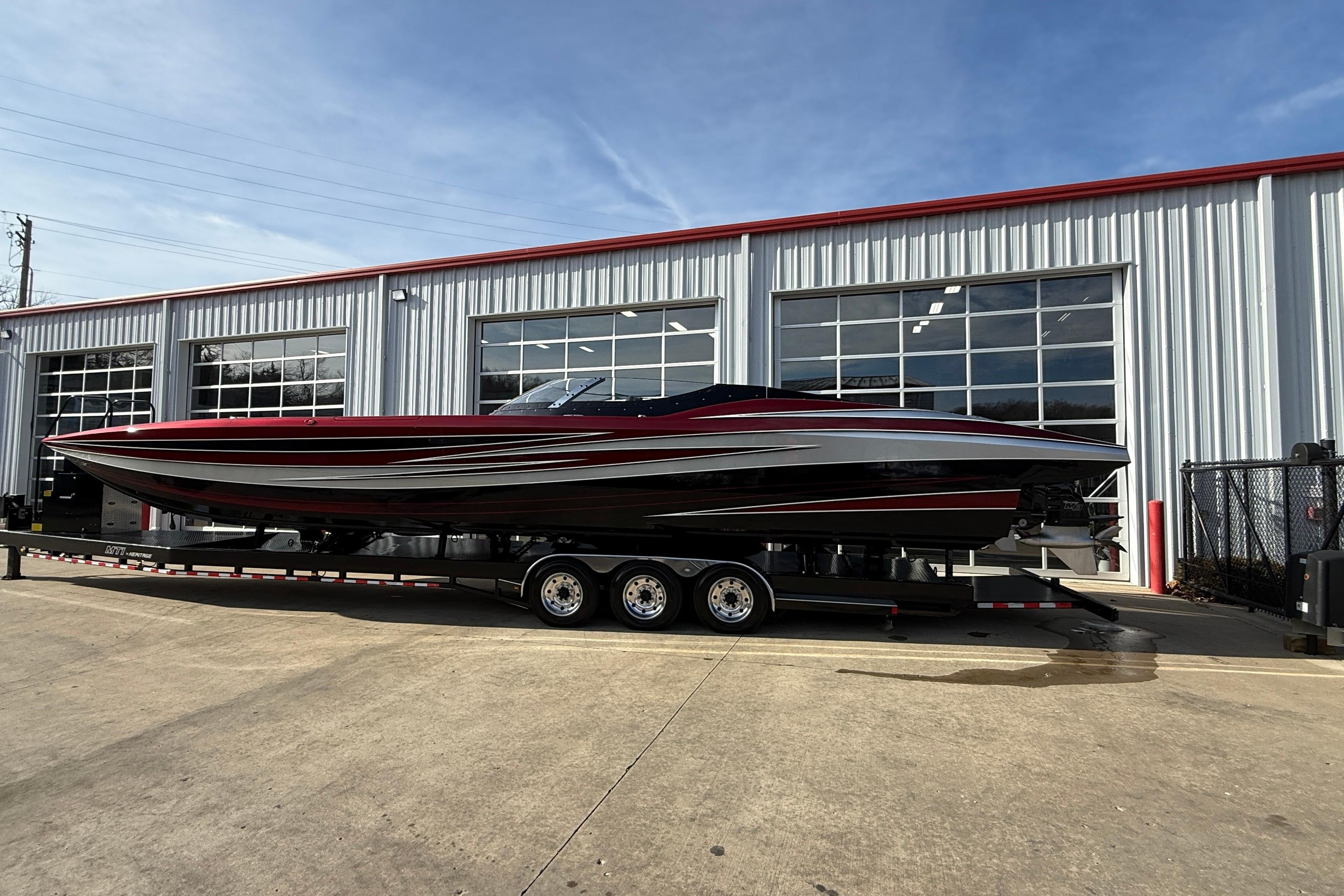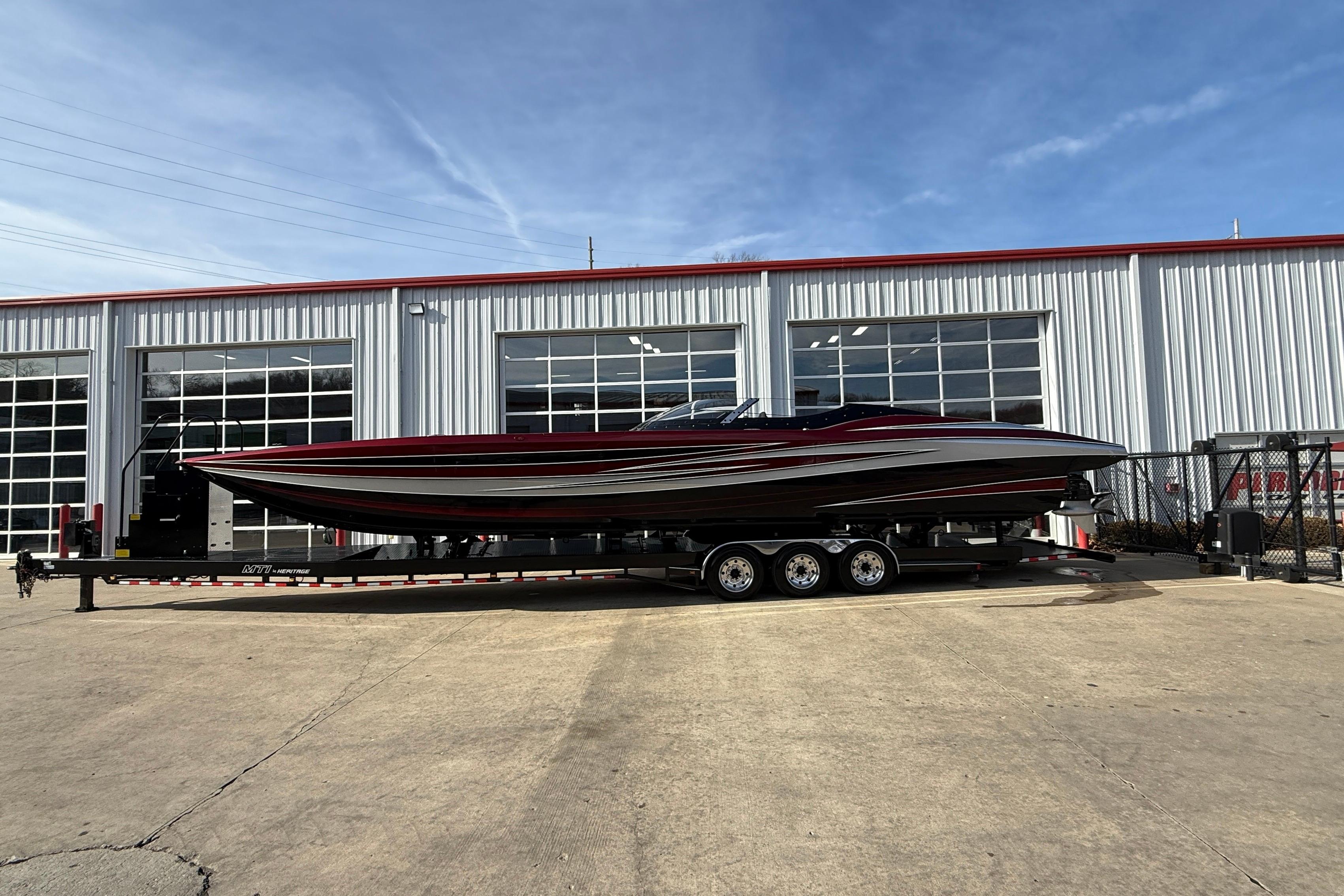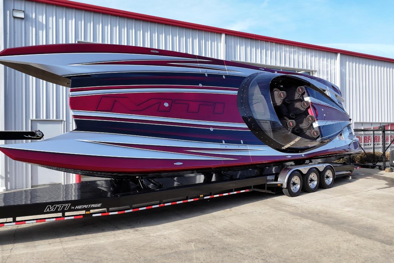 2018 MTI 43 R/P powered by Twin Mercury Racing QC4V 1100/1350 paired with M8 drives, Garmin GPS, Dual Mercury Vessel view, Garmin rear seat displays, dash blowers, rear seat blowers, sea deck flooring, painted dash panels, Alcantara interior, Heritage Tilt trailer included