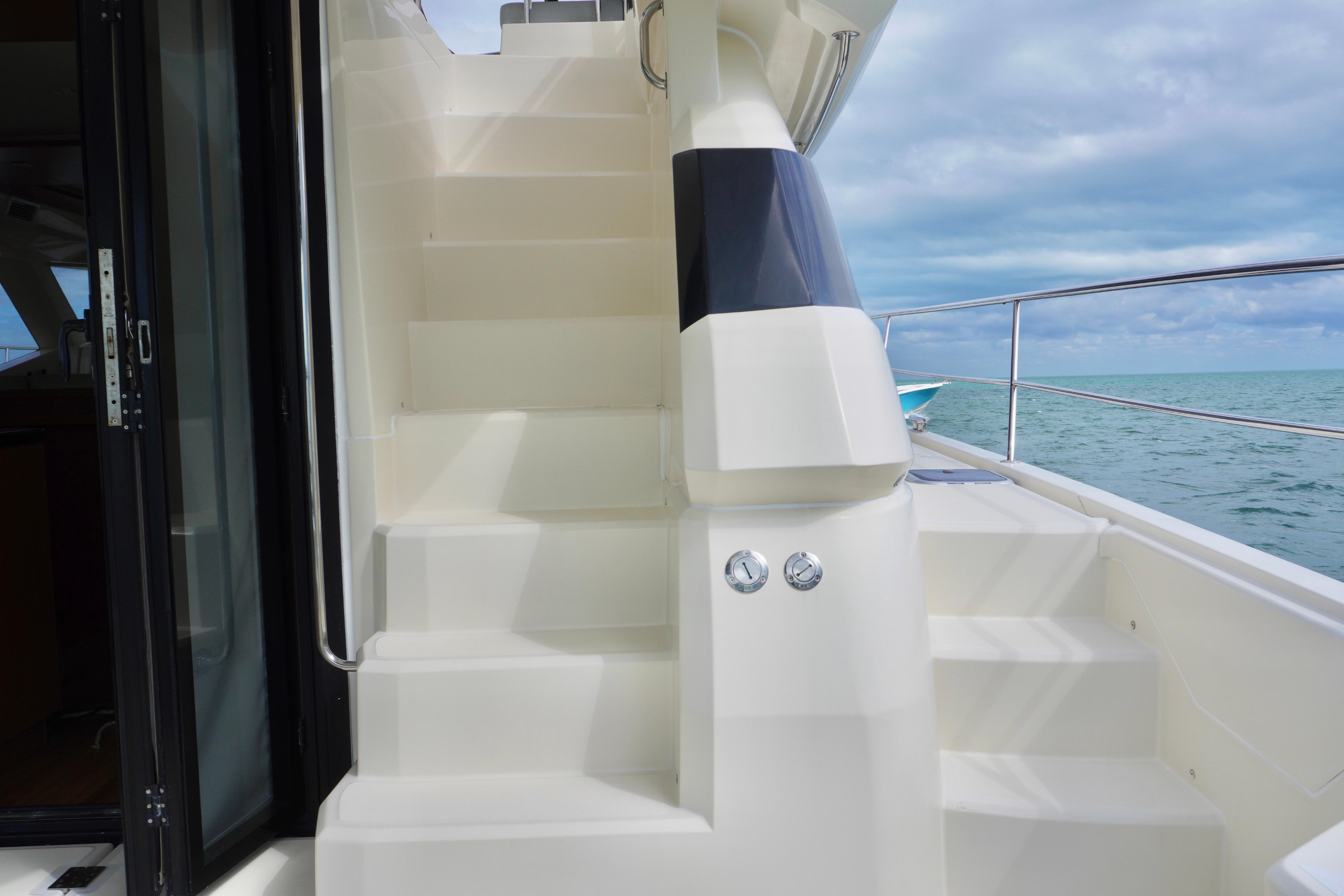 Enjoy a panoramic 360° view from the expansive salon and galley, designed with a spacious seating area, hidden TV compartment, and abundant storage—ideal for both liveaboard living and extended cruising.