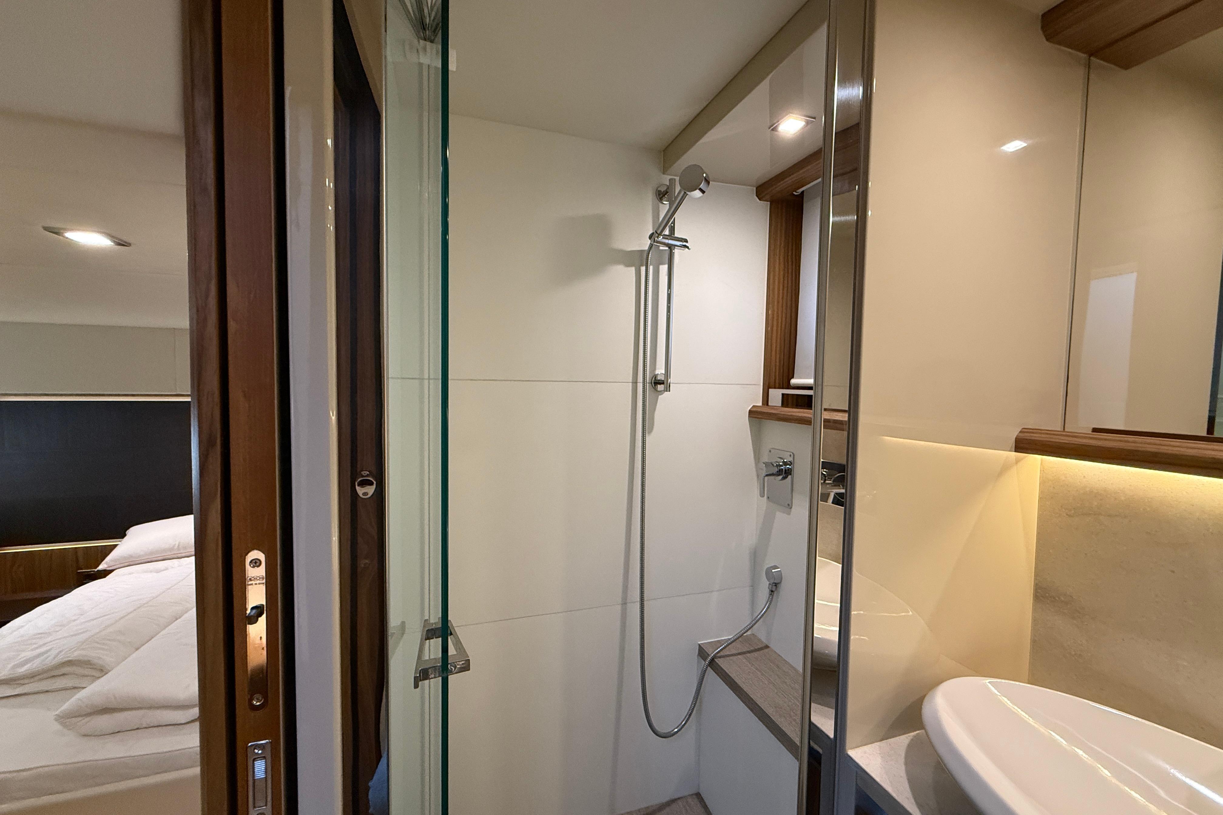 Absolute’s design philosophy is immediately evident: large panoramic glazing, open sightlines, and a seamless connection between cockpit, saloon, and galley create a yacht that feels significantly larger than her length suggests.