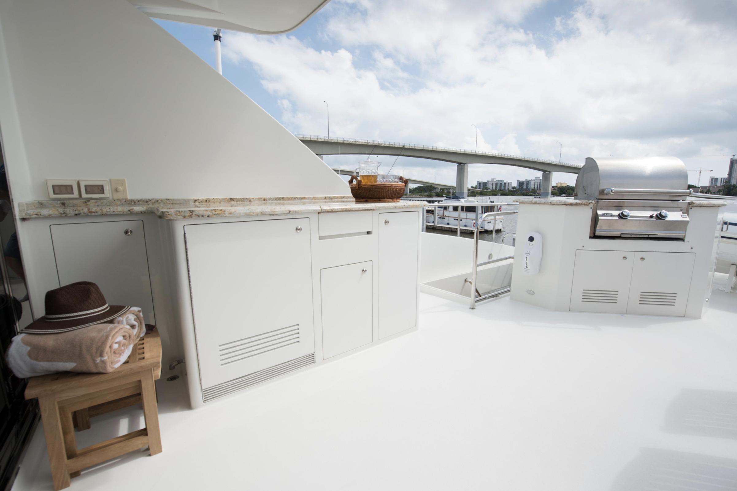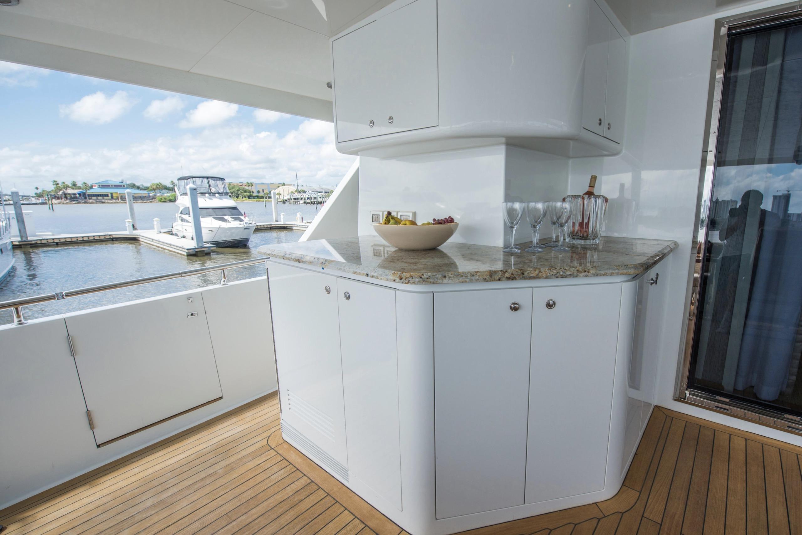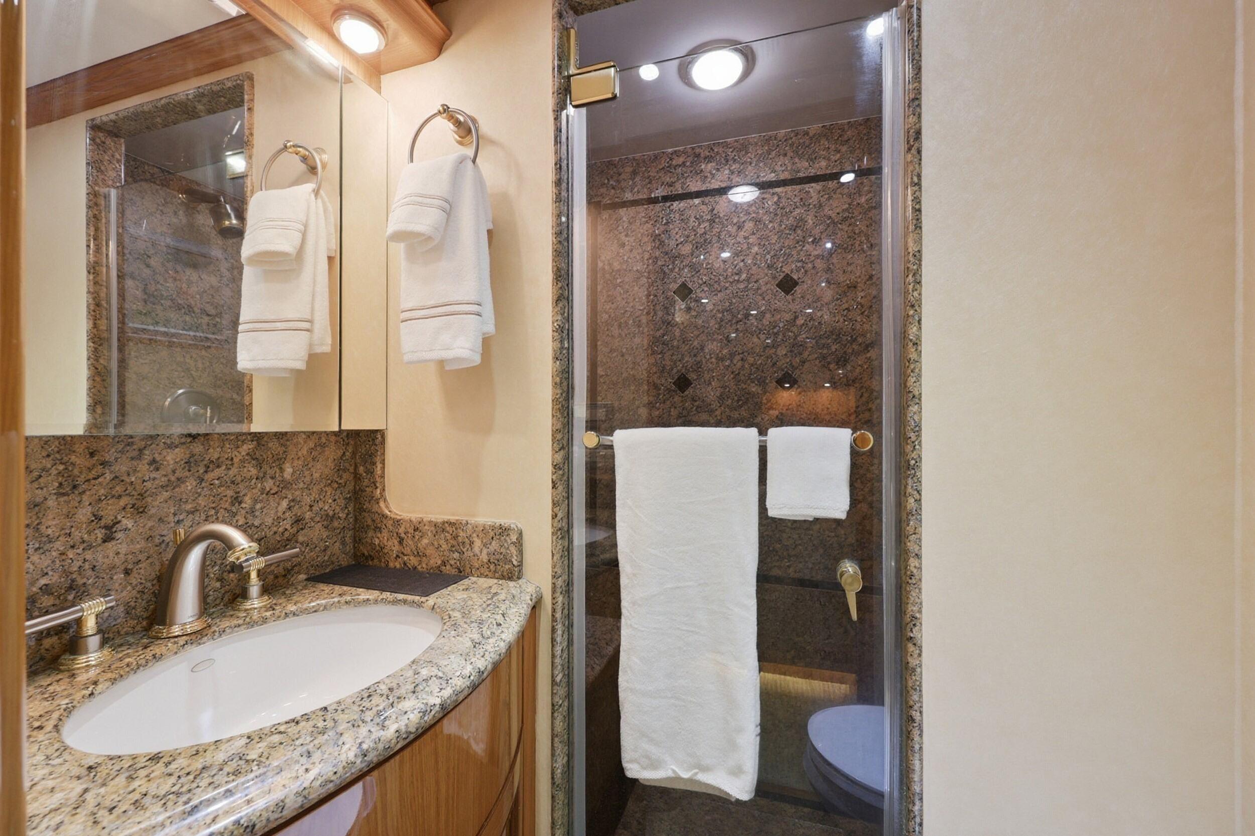 FOOTLOOSE sleeps 8 in four lavish en-suite staterooms: a full-beam main-deck master with king berth, walk-in closets, and spa bath; a forward VIP with another king; and two amidships queens. Warm teak interiors, neutral palettes, and refreshed soft goods create serene spaces. The salon-dining flows to a pro galley and wetted bar. Crew of 3-4 quarters separately with full amenities.