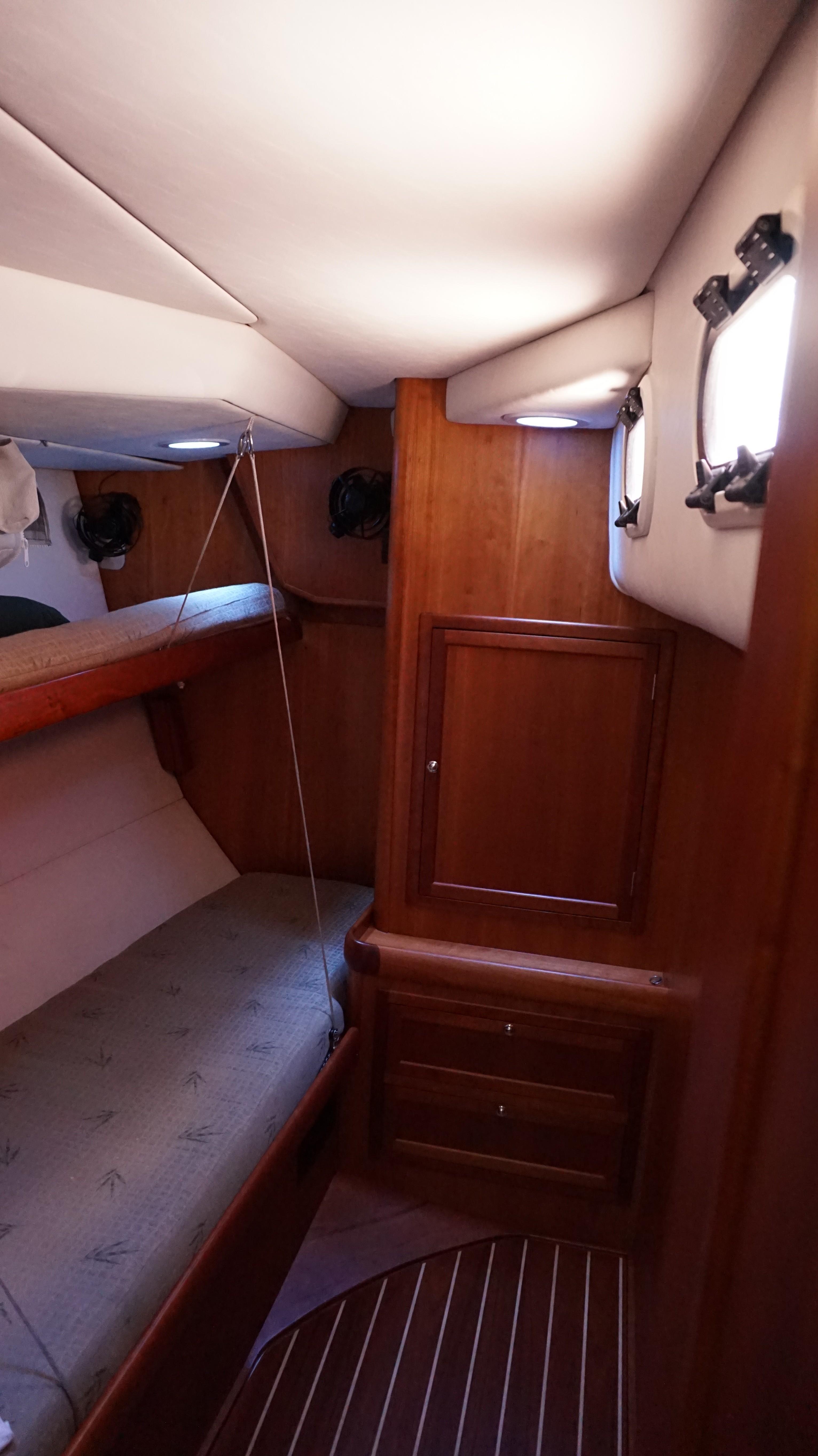 WalkthroughEntering her interior down wide scooped companionway steps, the first impression is of lightness from the port-lights and opening deck hatches. Combined with Majilite headliner panels and cherry wood interior the results are a tasteful contrast with the teak and holly cabin sole.