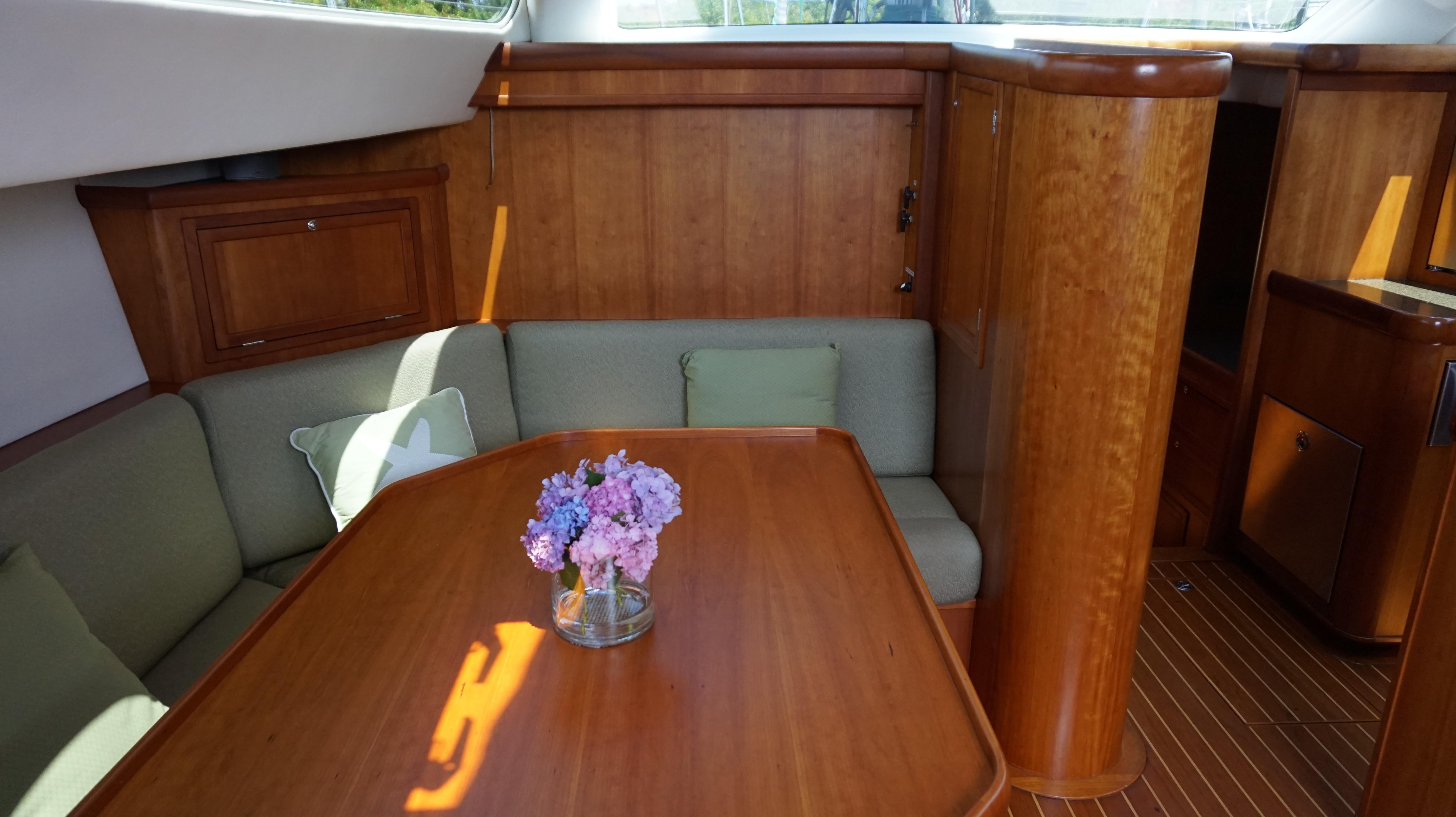CockpitThe centerpiece of her design, the large cockpit, can be accessed from either the retractable stern boarding platform or lifeline gates port and starboard. A walk-through between the twin helm stations leads to the lengthy cockpit seats separated by a teak fold-down dining table, with ample storage beneath the center leaf. Protected by full width dodger, this spacious cockpit with down lighting from the boom makes for an ideal entertainment area and al fresco dining.
