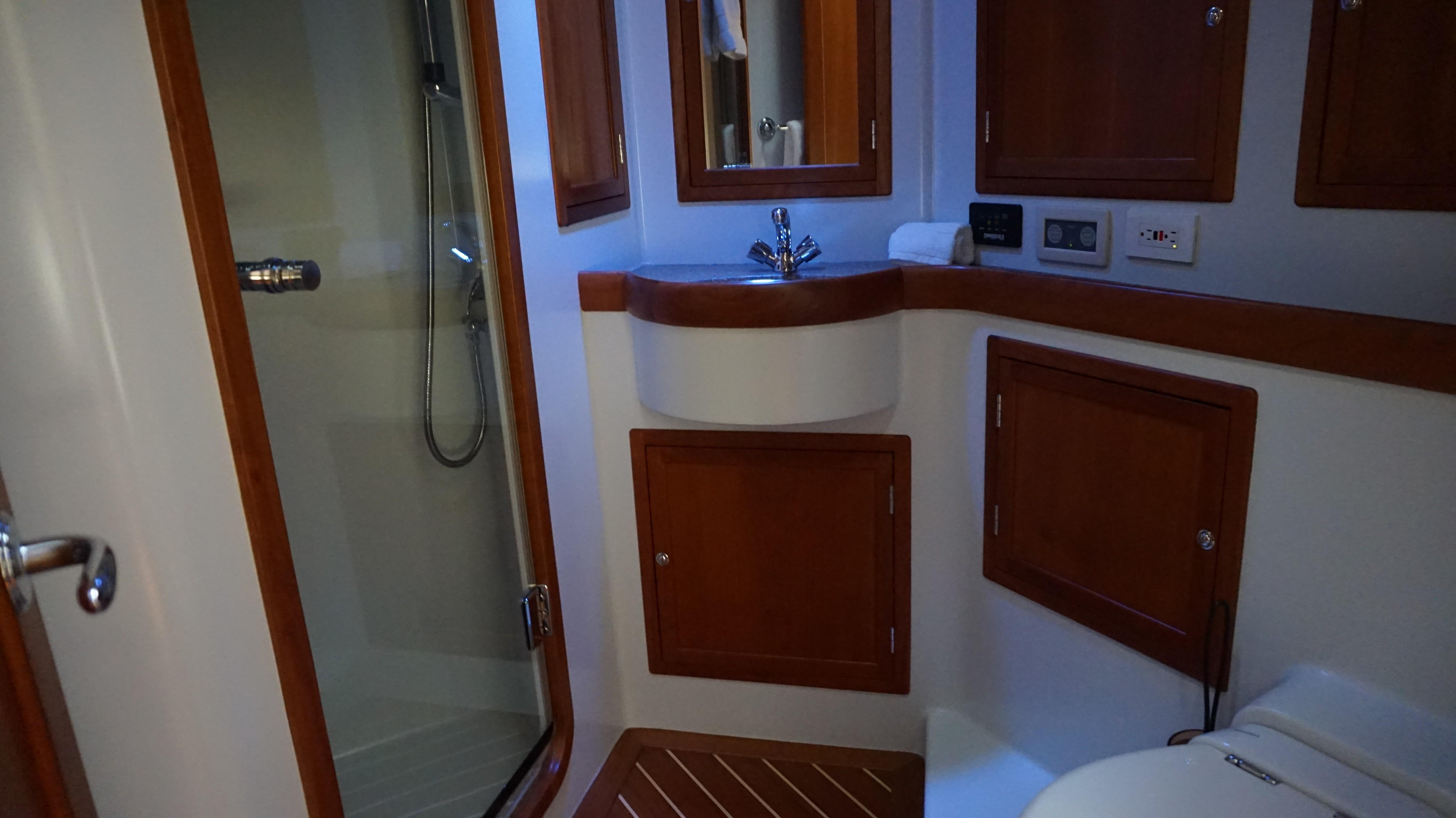 Forward of the hallway is the large master stateroom with a center line “walk around” queen size bed with opening hatches above providing light and ventilation. There is ample stowage within drawers, cupboards and a full length-hanging locker. The spacious, bright and airy head features a full size stall shower and granite countertops.
