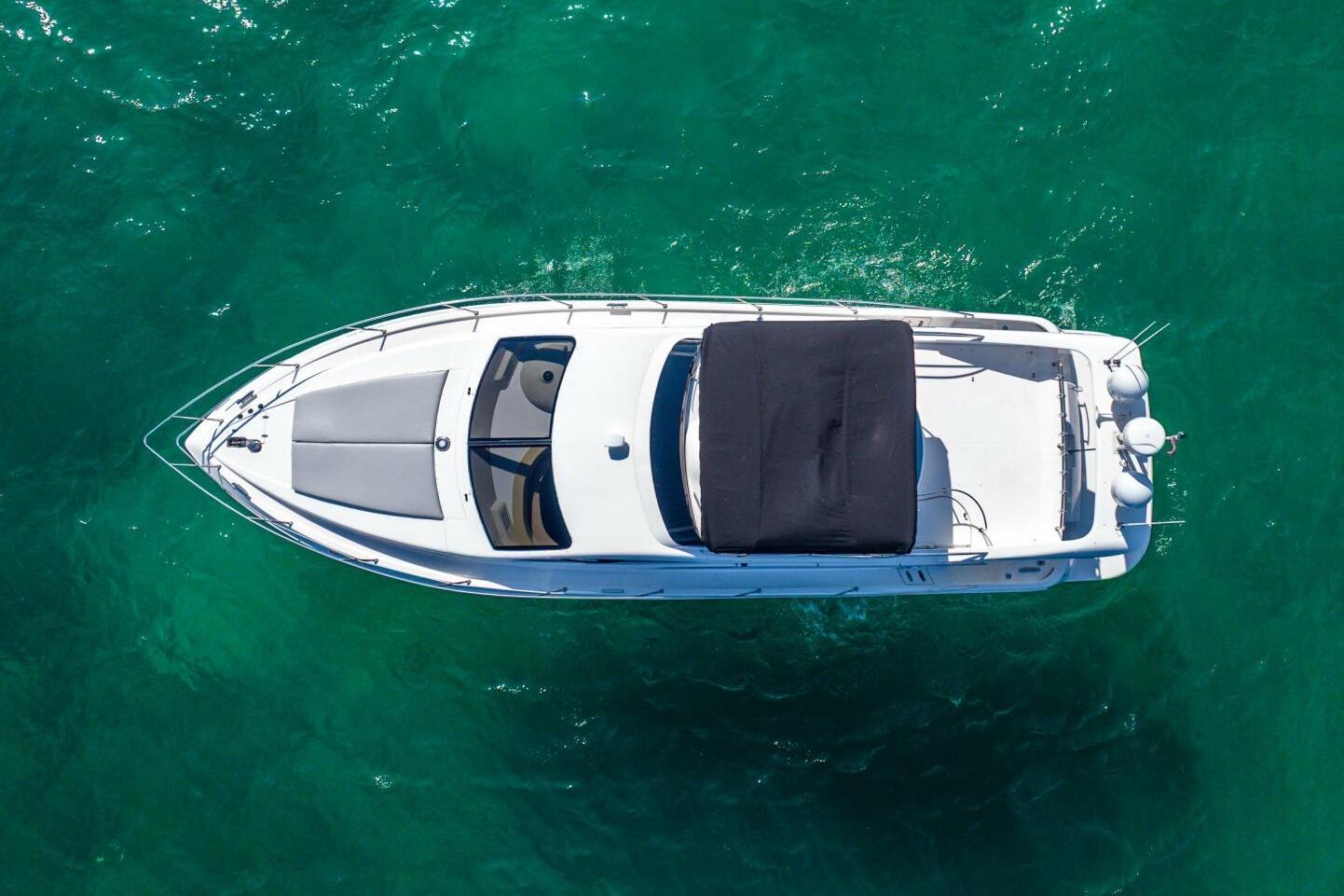 The flybridge is equipped with a Bimini top, giving you great shade while cruising or relaxing at anchor. It’s the perfect setup for South Florida boating — open and airy when you want it, protected when you need it. The bridge offers excellent visibility and plenty of seating for guests.
