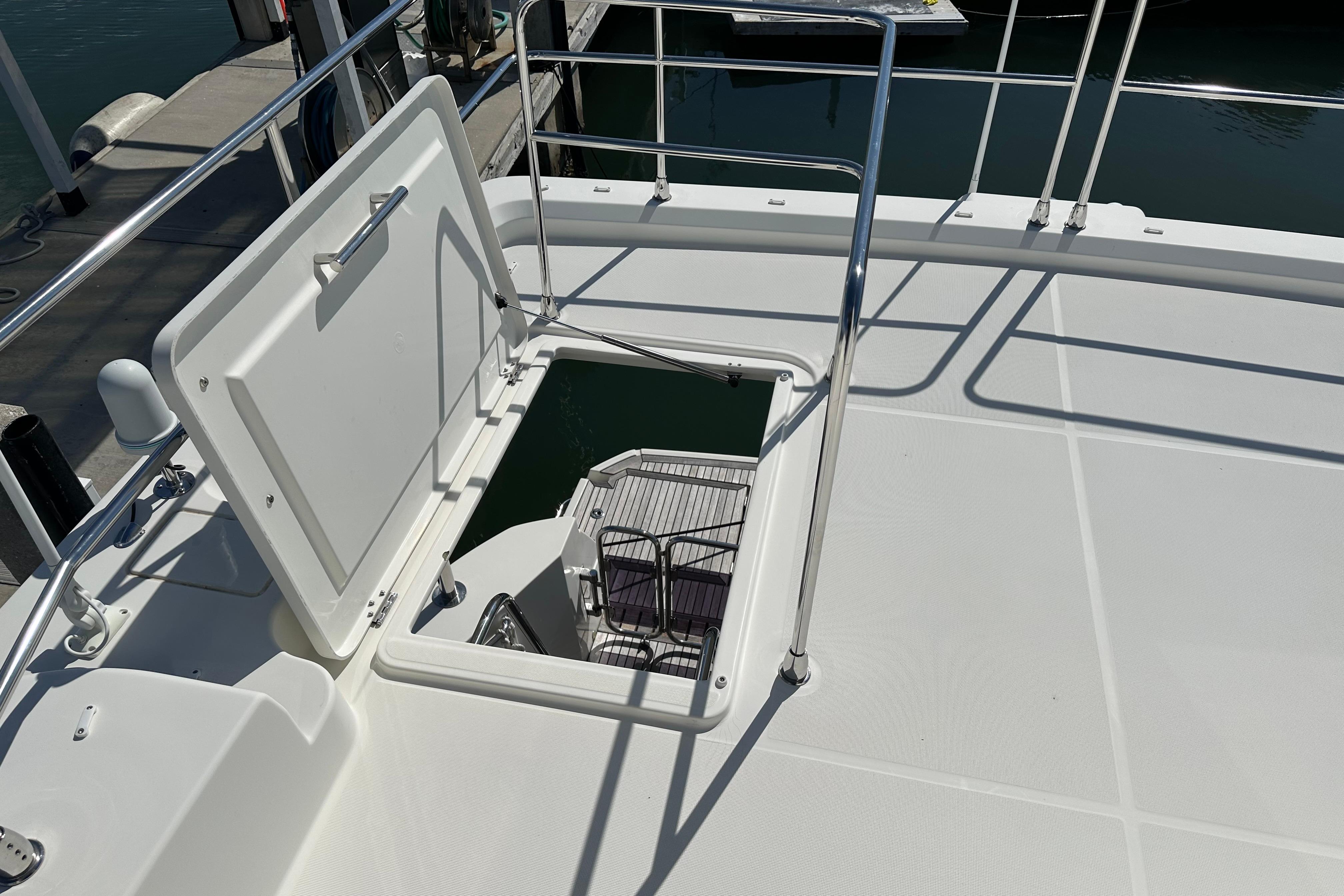 Easily board via starboard boarding gate to walkway, or via fully covered aft deck with starboard transom door and wide swim platform. Fully covered aft deck has aft settee, which slides back to offer additional space once docked, an additional settee port and an optional cocktail table. Stowed screen is easily installed to enclose the space. Access walkway portside or door through to extra wide covered walkway with door to lower helm starboard. Steps to flybridge, and glass pocket doors which open fully to galley/saloon with screens. With the pocket doors fully open, pop up bar opens to deck from galley. Beautiful teak decking, glass doors, custom lighting and storage.