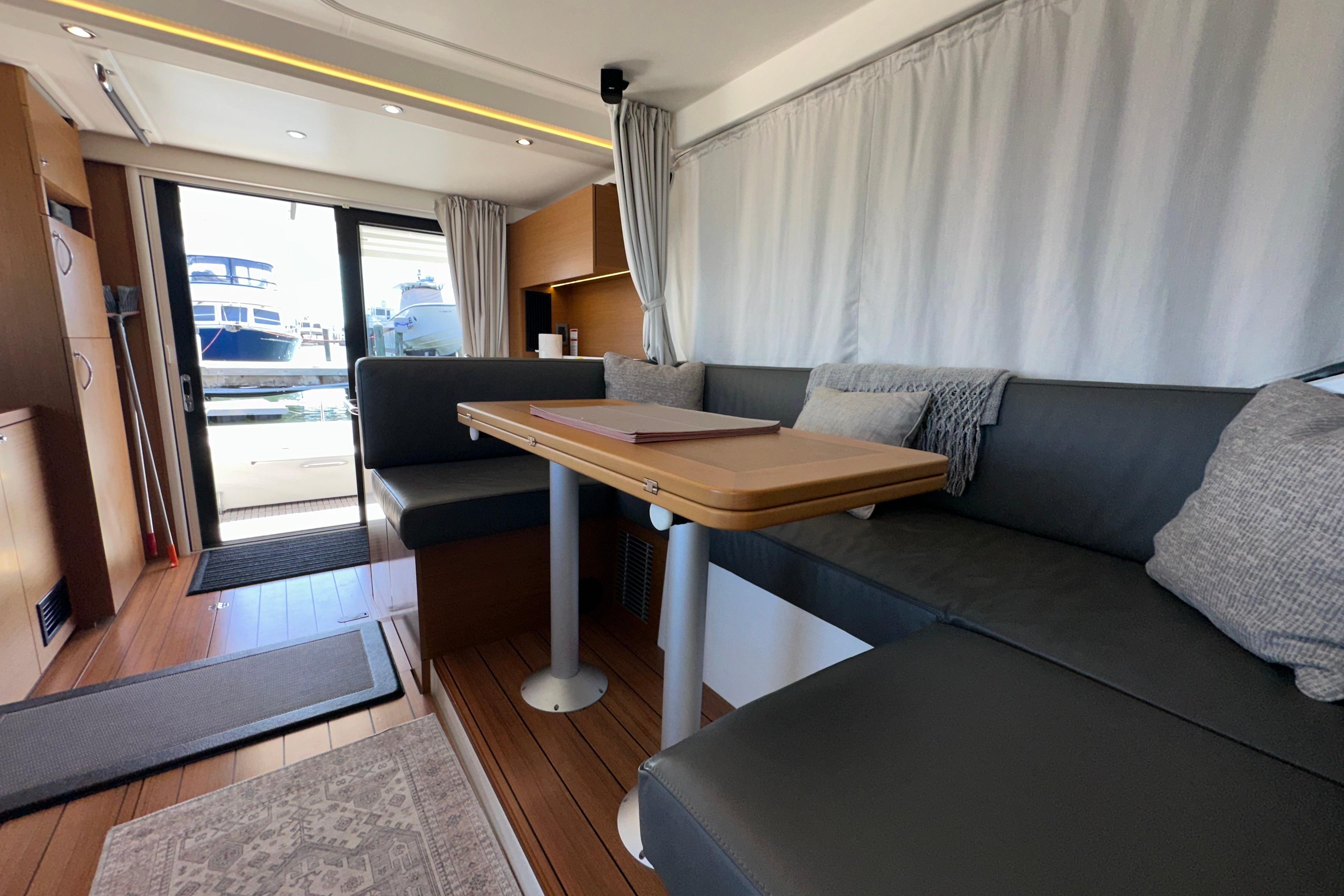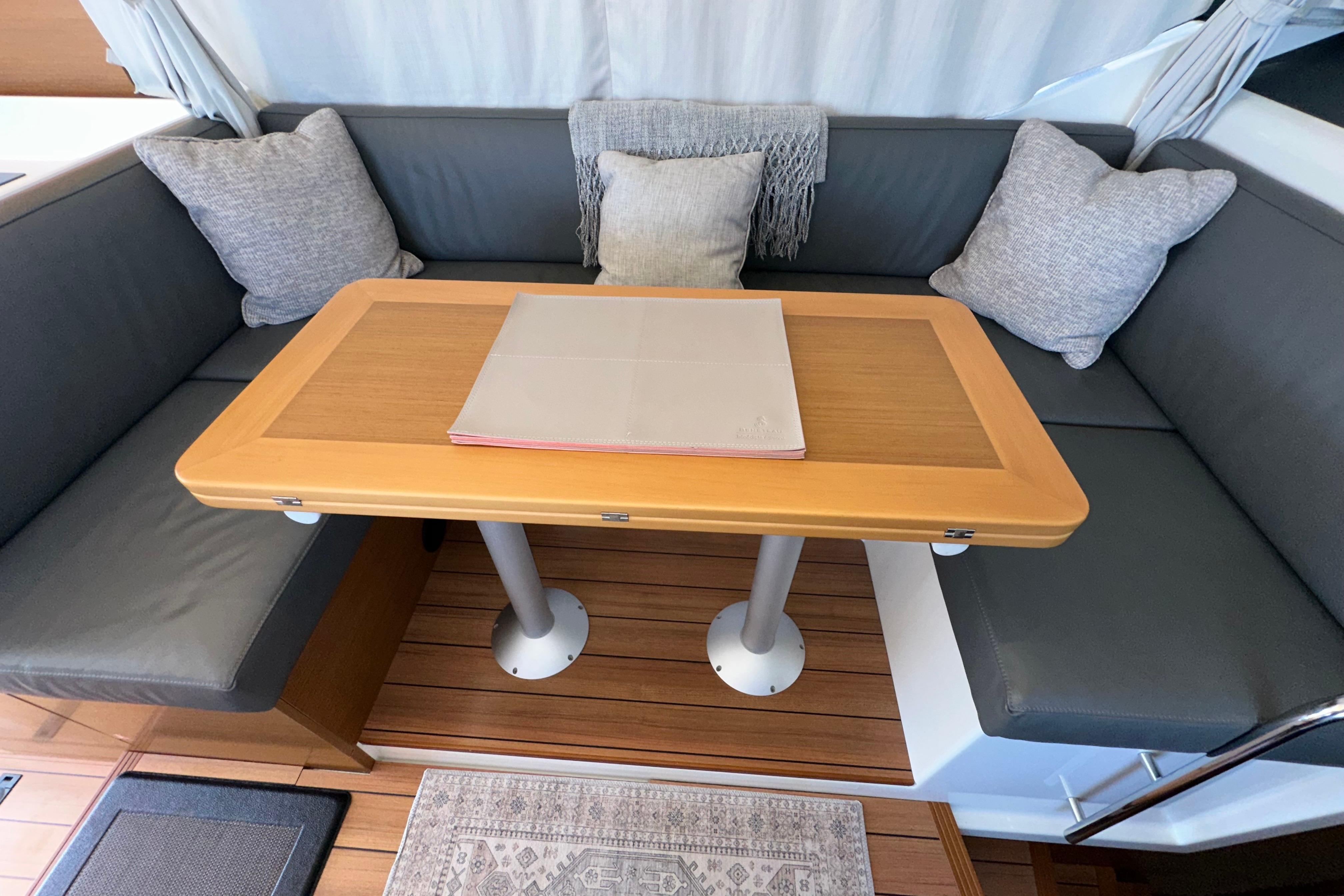 Forward to port is u shaped convertible settee in grey leatherette surrounded by pull out privacy curtain. The dining table folds out, and the double captain’s bench turns around to provide full dining table seating. All of this is accented by large window with opening portlight inset.
