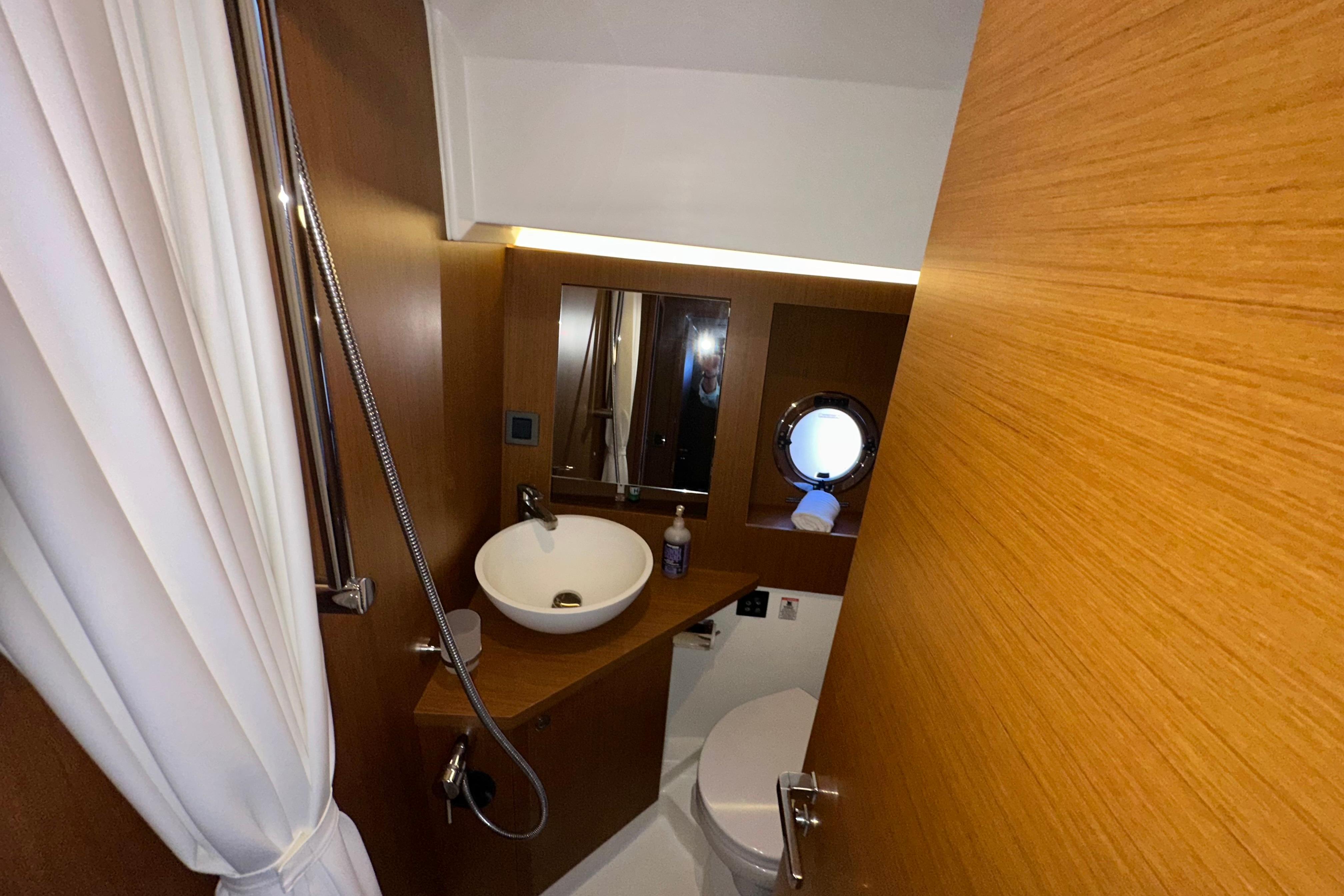 Forward to guest head with vanity and bowl sink, wet head, toilet, opening portlight.